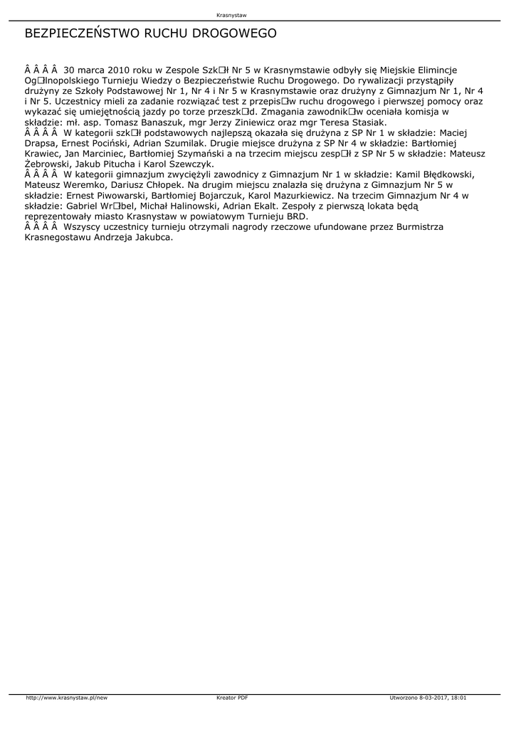 Krasnystaw BEZPIECZEŃSTWO RUCHU DROGOWEGO Â Â Â Â 30 marca 2010 roku w Zespole SzkÃłł Nr 5 w Krasnymstawie odbyły się Miejskie Elimincje OgÃłlnopolskiego Turnieju Wiedzy o Bezpieczeństwie Ruchu Drogowego. Do rywalizacji przystąpiły drużyny ze Szkoły Podstawowej Nr 1, Nr 4 i Nr 5 w Krasnymstawie oraz drużyny z Gimnazjum Nr 1, Nr 4 i Nr 5. Uczestnicy mieli za zadanie rozwiązać test z przepisÃłw ruchu drogowego i pierwszej pomocy oraz wykazać się umiejętnością jazdy po torze przeszkÃłd. Zmagania zawodnikÃłw oceniała komisja w składzie: mł. asp. Tomasz Banaszuk, mgr Jerzy Ziniewicz oraz mgr Teresa Stasiak. Â Â Â Â W kategorii szkÃłł podstawowych najlepszą okazała się drużyna z SP Nr 1 w składzie: Maciej Drapsa, Ernest Pociński, Adrian Szumilak. Drugie miejsce drużyna z SP Nr 4 w składzie: Bartłomiej Krawiec, Jan Marciniec, Bartłomiej Szymański a na trzecim miejscu zespÃłł z SP Nr 5 w składzie: Mateusz Żebrowski, Jakub Pitucha i Karol Szewczyk. Â Â Â Â W kategorii gimnazjum zwyciężyli zawodnicy z Gimnazjum Nr 1 w składzie: Kamil Błędkowski, Mateusz Weremko, Dariusz Chłopek. Na drugim miejscu znalazła się drużyna z Gimnazjum Nr 5 w składzie: Ernest Piwowarski, Bartłomiej Bojarczuk, Karol Mazurkiewicz. Na trzecim Gimnazjum Nr 4 w składzie: Gabriel WrÃłbel, Michał Halinowski, Adrian Ekalt. Zespoły z pierwszą lokata będą reprezentowały miasto Krasnystaw w powiatowym Turnieju BRD. Â Â Â Â Wszyscy uczestnicy turnieju otrzymali nagrody rzeczowe ufundowane przez Burmistrza Krasnegostawu Andrzeja Jakubca. http://www.krasnystaw.pl/new Kreator PDF Utworzono 8-03-2017, 18:01