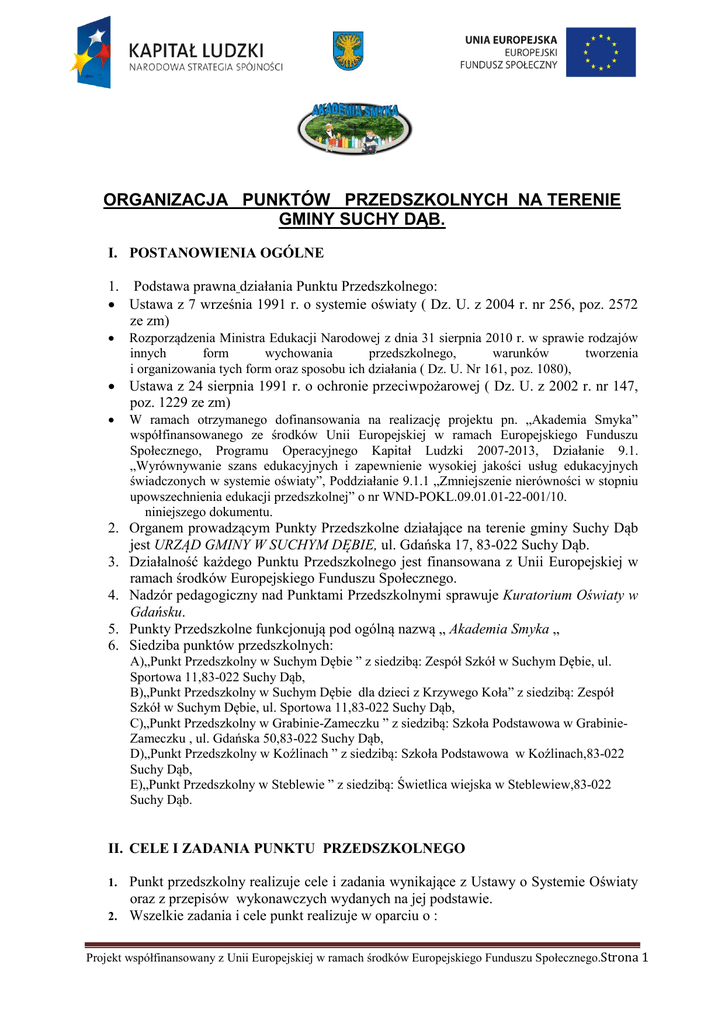 ORGANIZACJA PUNKTÓW PRZEDSZKOLNYCH NA TERENIE GMINY SUCHY DĄB. I. POSTANOWIENIA OGÓLNE 1. Podstawa prawna działania Punktu Przedszkolnego: Ustawa z 7 września 1991 r. o systemie oświaty ( Dz. U. z 2004 r. nr 256, poz. 2572 ze zm) Rozporządzenia Ministra Edukacji Narodowej z dnia 31 sierpnia 2010 r. w sprawie rodzajów innych form wychowania przedszkolnego, warunków tworzenia i organizowania tych form oraz sposobu ich działania ( Dz. U. Nr 161, poz. 1080), Ustawa z 24 sierpnia 1991 r. o ochronie przeciwpożarowej ( Dz. U. z 2002 r. nr 147, poz. 1229 ze zm) W ramach otrzymanego dofinansowania na realizację projektu pn. „Akademia Smyka” współfinansowanego ze środków Unii Europejskiej w ramach Europejskiego Funduszu Społecznego, Programu Operacyjnego Kapitał Ludzki 2007-2013, Działanie 9.1. „Wyrównywanie szans edukacyjnych i zapewnienie wysokiej jakości usług edukacyjnych świadczonych w systemie oświaty”, Poddziałanie 9.1.1 „Zmniejszenie nierówności w stopniu upowszechnienia edukacji przedszkolnej” o nr WND-POKL.09.01.01-22-001/10. niniejszego dokumentu. 2. Organem prowadzącym Punkty Przedszkolne działające na terenie gminy Suchy Dąb jest URZĄD GMINY W SUCHYM DĘBIE, ul. Gdańska 17, 83-022 Suchy Dąb. 3. Działalność każdego Punktu Przedszkolnego jest finansowana z Unii Europejskiej w ramach środków Europejskiego Funduszu Społecznego. 4. Nadzór pedagogiczny nad Punktami Przedszkolnymi sprawuje Kuratorium Oświaty w Gdańsku. 5. Punkty Przedszkolne funkcjonują pod ogólną nazwą „ Akademia Smyka „ 6. Siedziba punktów przedszkolnych: A)„Punkt Przedszkolny w Suchym Dębie ” z siedzibą: Zespół Szkół w Suchym Dębie, ul. Sportowa 11,83-022 Suchy Dąb, B)„Punkt Przedszkolny w Suchym Dębie dla dzieci z Krzywego Koła” z siedzibą: Zespół Szkół w Suchym Dębie, ul. Sportowa 11,83-022 Suchy Dąb, C)„Punkt Przedszkolny w Grabinie-Zameczku ” z siedzibą: Szkoła Podstawowa w GrabinieZameczku , ul. Gdańska 50,83-022 Suchy Dąb, D)„Punkt Przedszkolny w Koźlinach ” z siedzibą: Szkoła Podstawowa w Koźlinach,83-022 Suchy Dąb, E)„Punkt Przedszkolny w Steblewie ” z siedzibą: Świetlica wiejska w Steblewiew,83-022 Suchy Dąb. II. CELE I ZADANIA PUNKTU PRZEDSZKOLNEGO Punkt przedszkolny realizuje cele i zadania wynikające z Ustawy o Systemie Oświaty oraz z przepisów wykonawczych wydanych na jej podstawie. 2. Wszelkie zadania i cele punkt realizuje w oparciu o : 1. Projekt współfinansowany z Unii Europejskiej w ramach środków Europejskiego Funduszu Społecznego.Strona 1 Obszary edukacyjne Podstawy Programowej wychowania przedszkolnego dla przedszkoli i oddziałów przedszkolnych w szkołach podstawowych (załącznik do rozporządzenia MEN z dn 23 sierpnia 2007 r. – Dz. U. z dn. 31 sierpnia 2007 r. Nr 157, poz 1100). Programy nauczania wychowania przedszkolnego dopuszczone do użytku i zatwierdzone przez MEN. 3. Głównym celem punktu przedszkolnego jest wspomaganie i ukierunkowanie rozwoju dziecka zgodnie z jego wrodzonym potencjałem i możliwościami rozwojowymi w relacjach ze środowiskiem społeczno-kulturowym i przyrodniczym. 4. Punkt przedszkolny obejmuje opieką wszystkie dzieci z terenu Gminy Suchy Dąb, w wieku od 2,5 do 6 lat i zapewnia im bezpieczne oraz optymalne warunki do prawidłowego rozwoju. 5. Punkt przedszkolny realizuje swoje cele i zadania we współpracy z rodzicami lub prawnymi opiekunami dziecka. 6. Działalność wychowawcza, dydaktyczna i opiekuńcza punktu przedszkolnego prowadzona jest zgodnie z zasadami pedagogiki. 7. Punkt przedszkolny prowadzi szeroki zakres działań dydaktyczno-wychowawczych, dzięki którym skutecznie kształtują gotowość dziecka do podjęcia nauki szkolnej. 8. Charakteryzuje się zindywidualizowanym i elastycznym podejściem do potrzeb i oczekiwań dzieci oraz ich rodziców. 9. Pracę dydaktyczno-wychowawczą i opiekuńczą opierają się na wspomaganiu indywidualnego rozwoju dziecka. 10. Punkt Przedszkolny pracuje zgodnie z zasadami: wzajemnej akceptacji życzliwości sprawiedliwości tolerancji odpowiedzialności uczciwości. 11. Do szczegółowych zadań punktu przedszkolnego należy : Wspomaganie dzieci w rozwijaniu uzdolnień oraz kształtowanie czynności intelektualnych. Wychowanie dzieci tak, aby wiedziały co dobre, a co złe. Kształtowanie u dzieci odporności emocjonalnej do racjonalnego radzenia sobie w nowych i trudnych sytuacjach. Rozwijanie umiejętności społecznych dzieci. Wspomaganie rozwoju fizycznego oraz rozwijanie sprawności ruchowej wychowanków. Budowanie dziecięcej wiedzy o świecie, społecznym, przyrodniczym i technicznym. Wprowadzenie dzieci w świat wartości estetycznych. Kształtowanie u dzieci poczucia przynależności społecznej. Zapewnienie wychowankom lepszych szans edukacyjnych. Projekt współfinansowany z Unii Europejskiej w ramach środków Europejskiego Funduszu Społecznego.Strona 2 III.FUNKCJONOWANU PUNKTU PRZEDSZKOLNEGO 1. Dzienny wymiar godzin pracy punktu przedszkolnego, w tym czas przeznaczony na realizację wybranych części Podstawy Programowej wynosi 4 godziny . 2. Punkt Przedszkolny czynne jest codziennie od poniedziałku do piątku w godzinach:8.00-12.00- I zmiana oraz od 11.00-15.00-II zmiana. 3. Przerwa w pracy punktu przedszkolnego: w soboty i niedziele, z wyjątkiem gdy w te dni organizowane są uroczystości przedszkolne, imprezy środowiskowe i integracyjne, we wszystkie święta państwowe ustawowo wolne od pracy, w trakcie ferii zimowych od 24.01.2011 do 30.01.2011r.oraz od 20.02.2012r- 26.02.2012r. w trakcie przerwy wakacyjnej od 11.07.2011 do 15.08.2011r. 4. W szczególnie uzasadnionych przypadkach mogą być ustalone inne przerwy w działalności punktu przedszkolnego, przy czym istnieje obowiązek powiadamiania rodziców co najmniej na trzy dni przed przerwą. 5. Punkt przedszkolny prowadzi oddział przedszkolny złożony z grupy dziecięcej mieszanej wiekowo. 6. Do grupy przyjmowane są dz