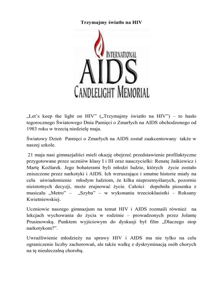 Trzymajmy światło na HIV „Let’s keep the light on HIV” („Trzymajmy światło na HIV”) – to hasło tegorocznego Światowego Dnia Pamięci o Zmarłych na AIDS obchodzonego od 1983 roku w trzecią niedzielę maja. Światowy Dzień Pamięci o Zmarłych na AIDS został zaakcentowany także w naszej szkole. 21 maja nasi gimnazjaliści mieli okazję obejrzeć przedstawienie profilaktyczne przygotowane przez uczniów klasy I i III oraz nauczycielki: Renatę Jaśkiewicz i Martę Koźlarek. Jego bohaterami byli młodzi ludzie, których życie zostało zniszczone przez narkotyki i AIDS. Ich wzruszające i smutne historie miały na celu uświadomienie młodym ludziom, że kilka nieprzemyślanych, pozornie nieistotnych decyzji, może zrujnować życie. Całości dopełniła piosenka z musicalu „Metro” – „Szyba” – w wykonaniu trzecioklasistki – Roksany Kwietniewskiej. Uczniowie naszego gimnazjum na temat HIV i AIDS rozmaili również na lekcjach wychowania do życia w rodzinie – prowadzonych przez Jolantę Prusinowską. Punktem wyjściowym do dyskusji był film „Dlaczego stop narkotykom?”. Uwrażliwienie młodzieży na sprawy HIV i AIDS ma nie tylko na celu ograniczenie liczby zachorowań, ale także walkę z dyskryminacją osób chorych na tę nieuleczalną chorobą. 18 maja 2014r. Dzień Pamięci o Zmarłych na AIDS Dzień Pamięci o Zmarłych na AIDS obchodzony jest od 1983 roku, w każdą trzecią niedzielę maja. Prowadzony jest przez koalicję około 1200 organizacji społecznych w 115 krajach. Jest jedną z najstarszych i największych na świecie kampanii organizowanych koordynowany jest przez osoby żyjące z HIV. Wspomnienie osób, które odeszły z powodu AIDS, ma na celu zwrócenie uwagi całego świata na fakt, że zapobieganie HIV/AIDS, pomoc osobom żyjącym z HIV i chorym na AIDS i ich rodzinom nie jest tylko sprawą rządów, ale spoczywa również w rękach społeczności lokalnych. Plakat na Międzynarodowym Pamięci o Zmarłych na AIDS (AIDS Candlelight Memorial), który w roku 2014 przypada na 18 maja. Hasło "Let’s keep the light on HIV" ma wymiar pozytywny. Dzień ten ma służyć mobilizacji społeczności w działalności na rzecz ograniczenia zakażeń HIV i zachorowań na AIDS, podnosić świadomość społeczną na temat HIV i AIDS, przełamywać bariery stygmatyzacji i dyskryminacji osób żyjących z HIV i AIDS. Źródło: candlelightmemorial.org, Krajowe Centrum ds. AIDS