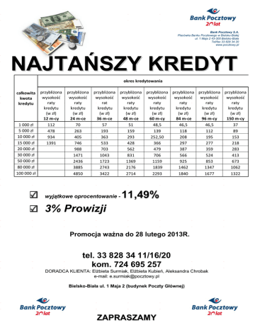 Bank Pocztowy S.A. Placówka Banku Pocztowego w Bielsku-Białej ul. 1 Maja 2 43-300 Bielsko-Biała Tel/fax 33 828 34 20 www.pocztowy.pl NAJTAŃSZY KREDYT okres kredytowania całkowita przybliżona przybliżona przybliżona przybliżona przybliżona przybliżona przybliżona przybliżona wysokość wysokość wysokość wysokość wysokość wysokość wysokość wysokość kwota raty raty rat raty raty raty raty raty kredytu kredytu kredytu kredytu kredytu kredytu kredytu kredytu kredytu (w zł) (w zł) (w zł) (w zł) (w zł) (w zł) (w zł) (w zł) 48 m‐ce 36 m‐ce 150 m‐cy 24 m‐ce 96 m‐cy 12 m‐cy 84 m‐ce 60 m‐cy 1 000 zł 112 70 57 51 48,5 46,5 46,5 37 5 000 zł 478 263 193 159 139 118 112 89 10 000 zł 934 405 363 293 252,50 208 195 153 15 000 zł 1391 746 533 428 366 297 277 218 20 000 zł 988 703 562 479 387 359 283 30 000 zł 1471 1043 831 706 566 524 413 50 000 zł 2436 1723 1369 1159 925 853 673 80 000 zł 3885 2743 2176 1839 1462 1347 1062 100 000 zł 4850 3422 2714 2293 1840 1677 1322 wyjątkowe oprocentowanie - 11,49% 3% Prowizji Promocja ważna do 28 lutego 2013R. tel. 33 828 34 11/16/20 kom. 724 695 257 DORADCA KLIENTA: Elżbieta Surmiak, Elżbieta Kubień, Aleksandra Chrobak e-mail: [email protected] Bielsko-Biała ul. 1 Maja 2 (budynek Poczty Głównej) ZAPRASZAMY