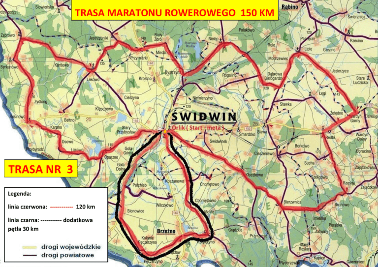 TRASA MARATONU ROWEROWEGO 150 KM TRASA NR 3 Legenda: linia czerwona: ------------ 120 km linia czarna: ----------- dodatkowa pętla 30 km