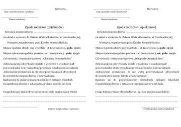 ………………………………………………… Imię i nazwisko rodzica (opiekuna) Warszawa, ………………………………………………... ………………………………………………… Imię i nazwisko rodzica (opiekuna) Warszawa, ………………………………………………... Numer kontaktowy Numer kontaktowy Zgoda rodziców (opiekunów) Zezwalam mojemu dziecku …………………………….…………………………. na udział w wycieczce do Zakonu Sióstr Miłosierdzia, ul. Grochowska 365, Warszawa, organizowanej przez Księdza Konrada Hasiora. Zgoda rodziców ( opiekunów) Zezwalam mojemu dziecku …………………………….……………………………… na udział w wycieczce do Zakonu Sióstr Miłosierdzia, ul. Grochowska 365, Warszawa, organizowanej przez Księdza Konrada Hasiora. Miejsce i godzina zbiórki przy wyjeździe - ul. Leszczynowa 5, godz. 13:00 Miejsce i godzina zbiórki przy wyjeździe – ul. Leszczynowa 5, godz. 13:00 Miejsce i planowana godzina powrotu – ul. Leszczynowa 5, godz. 19:30 Miejsce i planowana godzina powrotu – ul. Leszczynowa 5, ok. godz. 19:30 Cel wycieczki: rekreacyjno-sportowa „Olimpiada Otwartych Serc” Cel wycieczki: rekreacyjno-sportowa „Olimpiada Otwartych Serc” Zobowiązuję się pokryć koszty udziału w wycieczce w wysokości 5 zł Zobowiązuję się pokryć koszty udziału w wycieczce w wysokości 5 zł oraz ewentualne straty wyrządzone przez moje dziecko podczas wyjazdu. oraz ewentualne straty wyrządzone przez moje dziecko podczas wyjazdu. Jednocześnie oświadczam, że nie widzę przeciwwskazań zdrowotnych Jednocześnie oświadczam, do uczestnictwa mojego dziecka w w/w wycieczce. do uczestnictwa mojego dziecka w w/w wycieczce. Zgadzam się do przeprowadzenie niezbędnych zabiegów lekarskich Zgadzam i hospitalizację dziecka w sytuacjach zagrożenia zdrowia lub życia. i hospitalizację dziecka w sytuacjach zagrożenia zdrowia lub życia. Uwagi dotyczące stanu zdrowia dziecka (np. stałe przyjmowanie leków) Uwagi dotyczące stanu zdrowia dziecka (np. stałe przyjmowanie leków) …………………………………………………………………………….…………………………………… …………………………………………………………………………….…………………………………… ………………………………………………………………………………………….……………………… ………………………………………………………………………………………….……………………… ………………………………………………... Czytelny podpis rodzica ( opiekuna) się do że nie widzę przeciwwskazań zdrowotnych przeprowadzenie niezbędnych zabiegów lekarskich ………………………………………………... Czytelny podpis rodzica ( opiekuna)