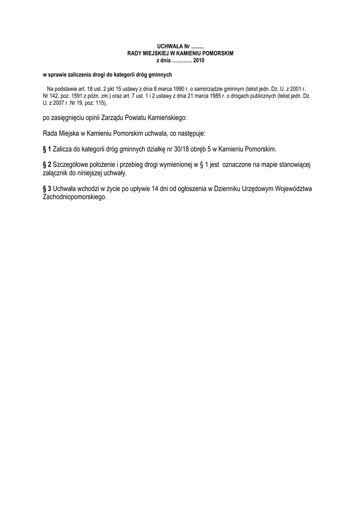 UCHWAŁA Nr ......... RADY MIEJSKIEJ W KAMIENIU POMORSKIM z dnia ………… 2010 w sprawie zaliczenia drogi do kategorii dróg gminnych Na podstawie art. 18 ust. 2 pkt 15 ustawy z dnia 8 marca 1990 r. o samorządzie gminnym (tekst jedn. Dz. U. z 2001 r. Nr 142, poz. 1591 z późn. zm.) oraz art. 7 ust. 1 i 2 ustawy z dnia 21 marca 1985 r. o drogach publicznych (tekst jedn. Dz. U. z 2007 r. Nr 19, poz. 115), po zasięgnięciu opinii Zarządu Powiatu Kamieńskiego: Rada Miejska w Kamieniu Pomorskim uchwala, co następuje: § 1 Zalicza do kategorii dróg gminnych działkę nr 30/18 obręb 5 w Kamieniu Pomorskim. § 2 Szczegółowe połoŜenie i przebieg drogi wymienionej w § 1 jest oznaczone na mapie stanowiącej załącznik do niniejszej uchwały. § 3 Uchwała wchodzi w Ŝycie po upływie 14 dni od ogłoszenia w Dzienniku Urzędowym Województwa Zachodniopomorskiego. Uzasadnienie Po wybudowaniu budynków dla osób poszkodowanych w poŜarze działka 30/3 obręb 5 przy ul. Orzeszkowej w Kamieniu Pomorskim została podzielona na 3 kolejne działki przeznaczeniem na budowę budynków mieszkalnych wielorodzinnych. Zaliczenie do kategorii dróg gminnych działki 30/18 pozwoli na zapewnienie dostępu do drogi publicznej działek 30/19, 30/16 i zapobiegnie konieczności ustanawiania słuŜebności drogiej jako procedury długotrwałej i kosztownej. Jednocześnie działka ta zostanie przeznaczona na umieszczenie w niej pełnej infrastruktury [sieci elektroenergetyczne, gazowe, wod-kan] . Stąd podjęcie uchwały jest zasadne.