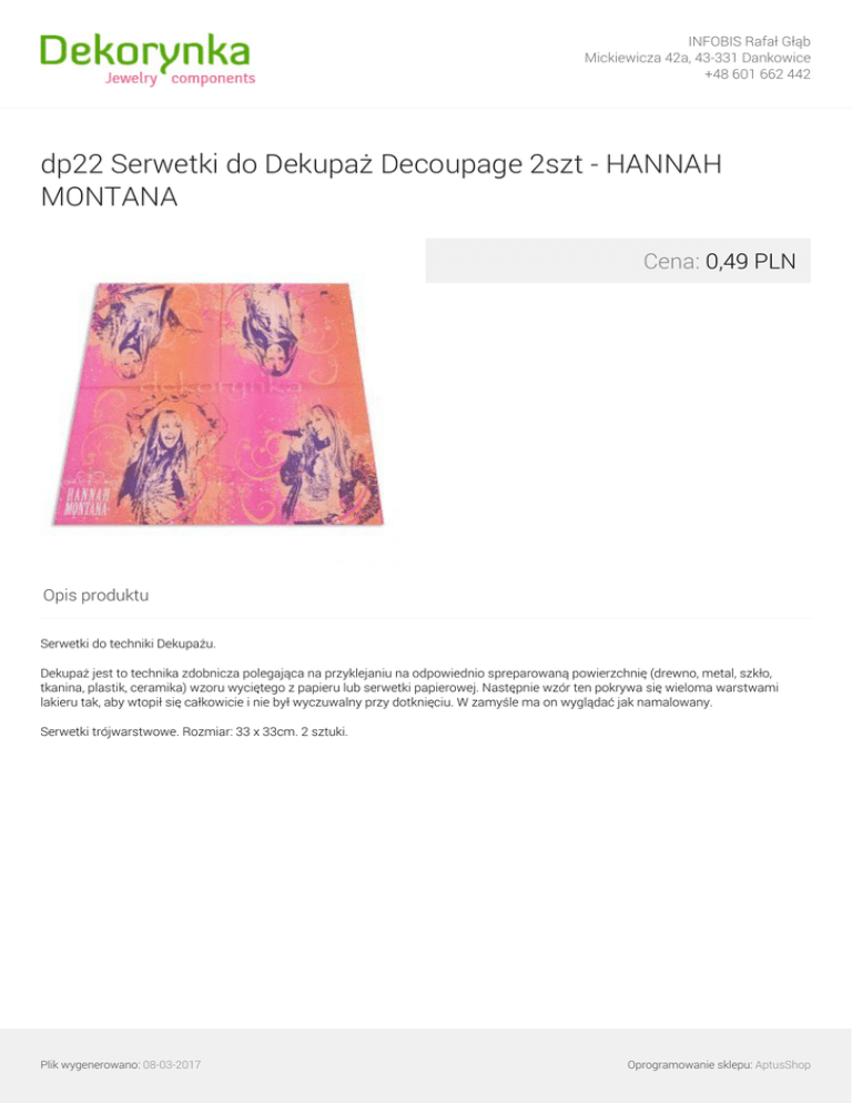 INFOBIS Rafał Głąb Mickiewicza 42a, 43-331 Dankowice +48 601 662 442 dp22 Serwetki do Dekupaż Decoupage 2szt - HANNAH MONTANA Cena: 0,49 PLN Opis produktu Serwetki do techniki Dekupażu. Dekupaż jest to technika zdobnicza polegająca na przyklejaniu na odpowiednio spreparowaną powierzchnię (drewno, metal, szkło, tkanina, plastik, ceramika) wzoru wyciętego z papieru lub serwetki papierowej. Następnie wzór ten pokrywa się wieloma warstwami lakieru tak, aby wtopił się całkowicie i nie był wyczuwalny przy dotknięciu. W zamyśle ma on wyglądać jak namalowany. Serwetki trójwarstwowe. Rozmiar: 33 x 33cm. 2 sztuki. Plik wygenerowano: 08-03-2017 Oprogramowanie sklepu: AptusShop INFOBIS Rafał Głąb Mickiewicza 42a, 43-331 Dankowice +48 601 662 442 Galeria Plik wygenerowano: 08-03-2017 Powered by TCPDF (www.tcpdf.org) Oprogramowanie sklepu: AptusShop