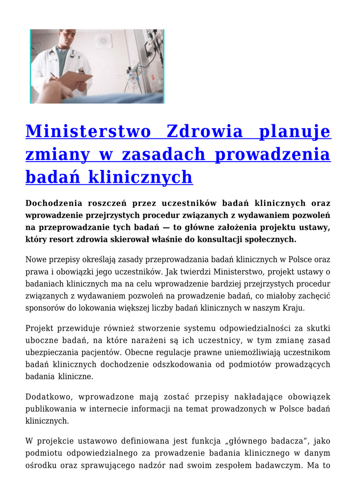 Ministerstwo Zdrowia planuje zmiany w zasadach prowadzenia badań klinicznych Dochodzenia roszczeń przez uczestników badań klinicznych oraz wprowadzenie przejrzystych procedur związanych z wydawaniem pozwoleń na przeprowadzanie tych badań — to główne założenia projektu ustawy, który resort zdrowia skierował właśnie do konsultacji społecznych. Nowe przepisy określają zasady przeprowadzania badań klinicznych w Polsce oraz prawa i obowiązki jego uczestników. Jak twierdzi Ministerstwo, projekt ustawy o badaniach klinicznych ma na celu wprowadzenie bardziej przejrzystych procedur związanych z wydawaniem pozwoleń na prowadzenie badań, co miałoby zachęcić sponsorów do lokowania większej liczby badań klinicznych w naszym Kraju. Projekt przewiduje również stworzenie systemu odpowiedzialności za skutki uboczne badań, na które narażeni są ich uczestnicy, w tym zmianę zasad ubezpieczania pacjentów. Obecne regulacje prawne uniemożliwiają uczestnikom badań klinicznych dochodzenie odszkodowania od podmiotów prowadzących badania kliniczne. Dodatkowo, wprowadzone mają zostać przepisy nakładające obowiązek publikowania w internecie informacji na temat prowadzonych w Polsce badań klinicznych. W projekcie ustawowo definiowana jest funkcja „głównego badacza”, jako podmiotu odpowiedzialnego za prowadzenie badania klinicznego w danym ośrodku oraz sprawującego nadzór nad swoim zespołem badawczym. Ma to umożliwić uniknięcie wątpliwości dotyczących odpowiedzialności za prowadzenie badania. Ograniczono też liczbę badań przeprowadzanych przez jednego badacza. Umowy dotyczące przeprowadzenia badania mają być zawierane nie tylko między jednostką prowadzącą badania a pacjentem, ale także z dyrektorem placówki na terenie której prowadzone jest dane badanie. Nowa ustawa jest efektem ubiegłorocznej kontroli NIK, która wykazała patologiczną zależność między udziałem lekarzy w dochodowych badaniach klinicznych i czerpanymi z tego tytułu korzyściami, a wielomilionowymi zamówieniami udzielanymi później przez szpitale sponsorom badań. Same badania kliniczne według NIK przynosiły straty szpitalom w których badania były przeprowadzane. Niebawem najprawdopodobniej zmienią się zasady prowadzenia badań klinicznych Data publikacji: 29.05.2011r.