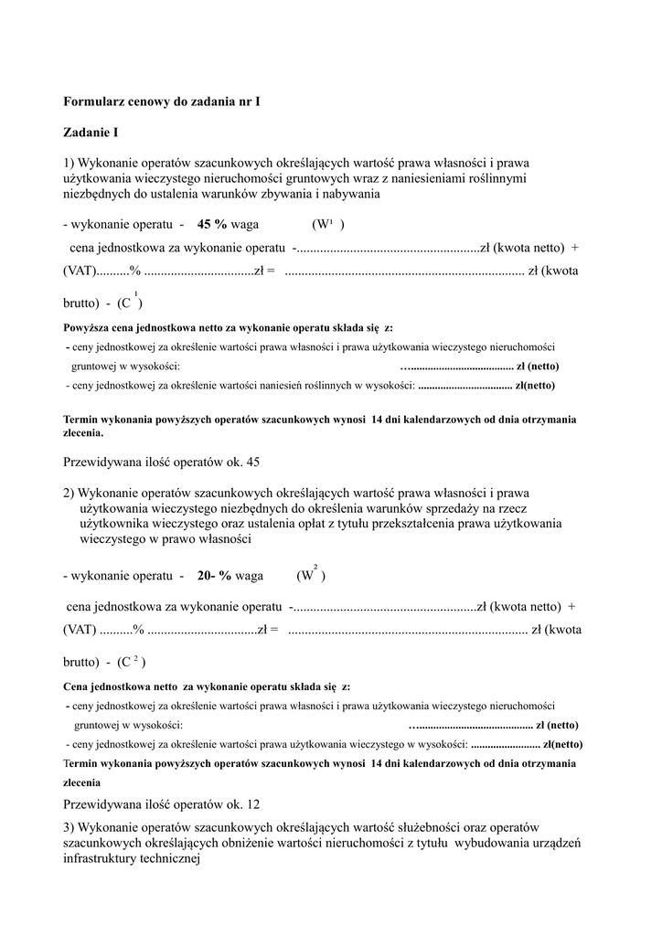 Formularz cenowy do zadania nr I Zadanie I 1) Wykonanie operatów szacunkowych określających wartość prawa własności i prawa użytkowania wieczystego nieruchomości gruntowych wraz z naniesieniami roślinnymi niezbędnych do ustalenia warunków zbywania i nabywania - wykonanie operatu - 45 % waga (W¹ ) cena jednostkowa za wykonanie operatu -.......................................................zł (kwota netto) + (VAT)..........% .................................zł = ........................................................................ zł (kwota brutto) - (C ¹) Powyższa cena jednostkowa netto za wykonanie operatu składa się z: - ceny jednostkowej za określenie wartości prawa własności i prawa użytkowania wieczystego nieruchomości gruntowej w wysokości: …..................................... zł (netto) - ceny jednostkowej za określenie wartości naniesień roślinnych w wysokości: .................................. zł(netto) Termin wykonania powyższych operatów szacunkowych wynosi 14 dni kalendarzowych od dnia otrzymania zlecenia. Przewidywana ilość operatów ok. 45 2) Wykonanie operatów szacunkowych określających wartość prawa własności i prawa użytkowania wieczystego niezbędnych do określenia warunków sprzedaży na rzecz użytkownika wieczystego oraz ustalenia opłat z tytułu przekształcenia prawa użytkowania wieczystego w prawo własności - wykonanie operatu - 20- % waga (W² ) cena jednostkowa za wykonanie operatu -.......................................................zł (kwota netto) + (VAT) ..........% .................................zł = ........................................................................ zł (kwota brutto) - (C 2 ) Cena jednostkowa netto za wykonanie operatu składa się z: - ceny jednostkowej za określenie wartości prawa własności i prawa użytkowania wieczystego nieruchomości gruntowej w wysokości: …......................................... zł (netto) - ceny jednostkowej za określenie wartości prawa użytkowania wieczystego w wysokości: ......................... zł(netto) Termin wykonania powyższych operatów szacunkowych wynosi 14 dni kalendarzowych od dnia otrzymania zlecenia Przewidywana ilość operatów ok. 12 3) Wykonanie operatów szacunkowych określających wartość służebności oraz operatów szacunkowych określających obniżenie wartości nieruchomości z tytułu wybudowania urządzeń infrastruktury technicznej - wykonanie operatu - 35 % waga (W ³) cena jednostkowa za wykonanie operatu -......................................................zł (kwota netto) + (VAT)..........% .................................... zł = ................................................................... zł (kwota brutto) - (C³ ) Termin wykonania powyższych operatów szacunkowych wynosi 14 dni kalendarzowych od dnia otrzymania zlecenia Przewidywana ilość operatów ok. 19 UWAGA Zlecany jednostkowy operat szacunkowy może dotyczyć wyliczenia wartości poszczególnych składników za wynagrodzeniem odpowiadającym wycenianej pozycji. Ocenie podlegać będzie suma kwot liczona według wzoru: C= C 1 x W 1 + C 2 x W 2 + C3 x W 3 przy czym: C – cena brutto oferty- wartość niniejszą należy wpisać w formularzu oferty C 1,2,3 - ceny jednostkowe brutto za wykonanie poszczególnych operatów W 1,2,3 - przypisane wagi C = ............................................................................................................................. ..................................................................................................................................... = = ......................................................................................... ................................................................ podpis osoby/ osób wskazanych w dokumencie uprawnionej / uprawnionych do występowania w obrocie prawnym, reprezentowania oferenta i składania oświadczeń woli w jego imieniu Formularz cenowy do zadania nr II Zadanie II 1) Wykonanie operatów szacunkowych określających wartość nieruchomości gruntowych niezbędnych do aktualizacji opłat rocznych z tytułu ich użytkowania wieczystego, opłat z tytułu trwałego zarządu i użytkowania - wykonanie operatu - 60 % waga (W 1) cena jednostkowa za wykonanie operatu -.........................................................zł (kwota netto) + (VAT) ..........% ................................zł = .......................................................................... zł (kwota brutto) - (C 1 ) Termin wykonania powyższych operatów szacunkowych wynosi 21 dni kalendarzowych od dnia otrzymania zlecenia Przewidywana ilość operatów ok. 40 2) Wykonanie operatów szacunkowych niezbędnych do naliczenia opłaty adiacenckiej z tytułu wzrostu wartości nieruchomości na skutek jej podziału - wykonanie operatu - 30 % waga (W 3) cena jednostkowa za wykonanie operatu dla jednej działki -......................................................zł (kwota netto) + (VAT) ..........% ..................................zł=.................................................... zł (kwota (C3 ) brutto) - Termin wykonania powyższych operatów szacunkowych wynosi 21 dni kalendarzowych od dnia otrzymania zlecenia Przewidywana ilość operatów ok. 25 3) Wykonanie operatów szacunkowych określających wartość nieruchomości niezbędnych do ustalenia wysokości opłaty z tytułu wzrostu wartości nieruchomości na skutek zmiany planu miejscowego. - wykonanie operatu - 10 % waga (W4) cena jednostkowa za wykonanie operatu dla jednej działki -......................................................zł (kwota netto) + (VAT) ..........% ..................................zł=.................................................... zł (kwota brutto) - (C4 ) Termin wykonania powyższych operatów szacunkowych wynosi 21 dni kalendarzowych od dnia otrzymania zlecenia. Przewidywana ilość operatów ok. 5 Ocenie podlegać będzie suma kwot lic