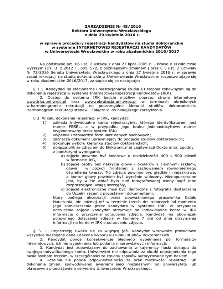 ZARZĄDZENIE Nr 45/2016 Rektora Uniwersytetu Wrocławskiego z
