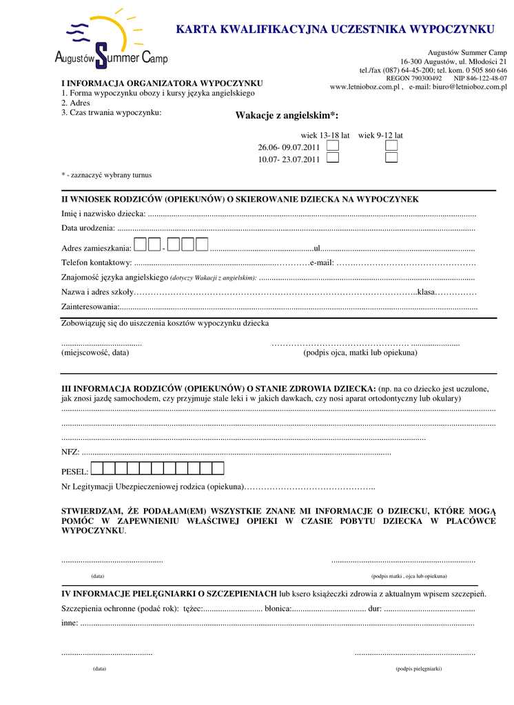 KARTA KWALIFIKACYJNA UCZESTNIKA WYPOCZYNKU Augustów Summer Camp 16-300 Augustów, ul. Młodości 21 tel./fax (087) 64-45-200; tel. kom. 0 505 860 646 Augustów ummer Camp I INFORMACJA ORGANIZATORA WYPOCZYNKU 1. Forma wypoczynku obozy i kursy języka angielskiego 2. Adres 3. Czas trwania wypoczynku: Wakacje REGON 790300492 NIP 846-122-48-07 www.letnioboz.com.pl , e-mail: [email protected] z angielskim*: wiek 13-18 lat 26.06- 09.07.2011 10.07- 23.07.2011 wiek 9-12 lat * - zaznaczyć wybrany turnus II WNIOSEK RODZICÓW (OPIEKUNÓW) O SKIEROWANIE DZIECKA NA WYPOCZYNEK Imię i nazwisko dziecka: ........................................................................................................................................................... Data urodzenia: ......................................................................................................................................................................... Adres zamieszkania: - .................................................ul......................................................................... Telefon kontaktowy: ...................................................................…………e-mail: …….……………………………………. Znajomość języka angielskiego (dotyczy Wakacji z angielskim): ...................................................................................................... Nazwa i adres szkoły………………………………………………………………………………………..klasa…………… Zainteresowania:......................................................................................................................................................................... Zobowiązuję się do uiszczenia kosztów wypoczynku dziecka ...................................... (miejscowość, data) …………………………………………. ....................... (podpis ojca, matki lub opiekuna) III INFORMACJA RODZICÓW (OPIEKUNÓW) O STANIE ZDROWIA DZIECKA: (np. na co dziecko jest uczulone, jak znosi jazdę samochodem, czy przyjmuje stale leki i w jakich dawkach, czy nosi aparat ortodontyczny lub okulary) ............................................................................................................................................................................................................. ............................................................................................................................................................................................................. ............................................................................................................................................................................ NFZ: .................................................................................................................................................. PESEL: Nr Legitymacji Ubezpieczeniowej rodzica (opiekuna)……………………………………….. STWIERDZAM, ŻE PODAŁAM(EM) WSZYSTKIE ZNANE MI INFORMACJE O DZIECKU, KTÓRE MOGĄ POMÓC W ZAPEWNIENIU WŁAŚCIWEJ OPIEKI W CZASIE POBYTU DZIECKA W PLACÓWCE WYPOCZYNKU. ................................................ (data) .................................................................... (podpis matki , ojca lub opiekuna) IV INFORMACJE PIELĘGNIARKI O SZCZEPIENIACH lub ksero książeczki zdrowia z aktualnym wpisem szczepień. Szczepienia ochronne (podać rok): tężec:............................ błonica:................................... dur: ........................................... inne: .......................................................................................................................................................................................... ........................................... (data) ......................................................... (podpis pielęgniarki) V. INFORMACJA WYCHOWAWCY KLASY O DZIECKU (w przypadku braku możliwości uzyskania opinii wychowawcy klasy - wypełnia rodzic lub opiekun) ........................................................................................................................................................................... ........................................................................................................................................................................... ........................................................................................................................................................................... ....................................... (data) .................................................. (podpis wychowawcy lub rodzica -opiekuna) WYPEŁNIA VI. DECYZJA O KWALIFIKACJI UCZESTNIKA Postanawia się: 1. Zakwalifikować i skierować dziecko na wypoczynek 2. Odmówić skierowania dziecka na wypoczynek ze względu: ............................................... ....................................... (data) ORGANIZATOR ........................................................... (podpis organizatora) VII. POTWIERDZENIE POBYTU DZIECKA NA WYPOCZYNKU WYPEŁNIA ORGANIZATOR Dziecko przebywało na……………………………………………………………………......................................... (forma i adres miejsca wypoczynku) od dnia ............................... do dnia ........................... 2 .......... r. ........................ (data) ................................. (czytelny podpis kierownika wypoczynku) WYPEŁNIA ORGANIZATOR VIII. INFORMACJE O STANIE ZDROWIA DZIECKA W CZASIE TRWANIA WYPOCZYNKU (dane o zachorowaniach, urazach, leczeniu itp.) ................................................................................................................................................................................................ Organizator informuje rodziców o leczeniu ambulatoryjnym lub hospitalizacji dziecka .................