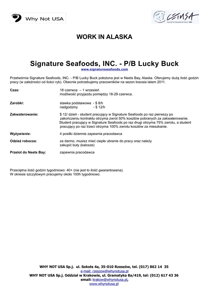 WORK IN ALASKA Signature Seafoods, INC. - P/B Lucky Buck www.signatureseafoods.com Przetwórnia Signature Seafoods, INC. - P/B Lucky Buck położona jest w Neets Bay, Alaska. Oferujemy dużą ilość godzin pracy (w zależności od ilości ryb). Obecnie potrzebujemy pracowników na sezon łososia latem 2011. Czas: 18 czerwca – 1 wrzesień możliwość przyjazdu pomiędzy 18-29 czerwca. Zarobki: stawka podstawowa - $ 8/h nadgodziny - $ 12/h Zakwaterowanie: $ 12/ dzień - student pracujący w Signature Seafoods po raz pierwszy po zakończeniu kontraktu otrzyma zwrot 50% kosztów pobranych za zakwaterowanie. Student pracujący w Signature Seafoods po raz drugi otrzyma 75% zwrotu, a student pracujący po raz trzeci otrzyma 100% zwrotu kosztów za mieszkanie. Wyżywienie: 4 posiłki dziennie zapewnia pracodawca Odzież robocza: za darmo, musisz mieć ciepłe ubranie do pracy oraz należy zakupić buty (kalosze) Przelot do Neets Bay: zapewnia pracodawca Przeciętna ilość godzin tygodniowo: 40+ (nie jest to ilość gwarantowana). W okresie szczytowym pracujemy około 100h tygodniowo. WHY NOT USA Sp.j. ul. Sokoła 4a, 35-010 Rzeszów, tel. (017) 862 14 35 e-mail: [email protected] WHY NOT USA Sp.j. Oddział w Krakowie, ul. Gramatyka 8a/419, tel: (012) 617 43 36 email: [email protected], www.whynotusa.pl