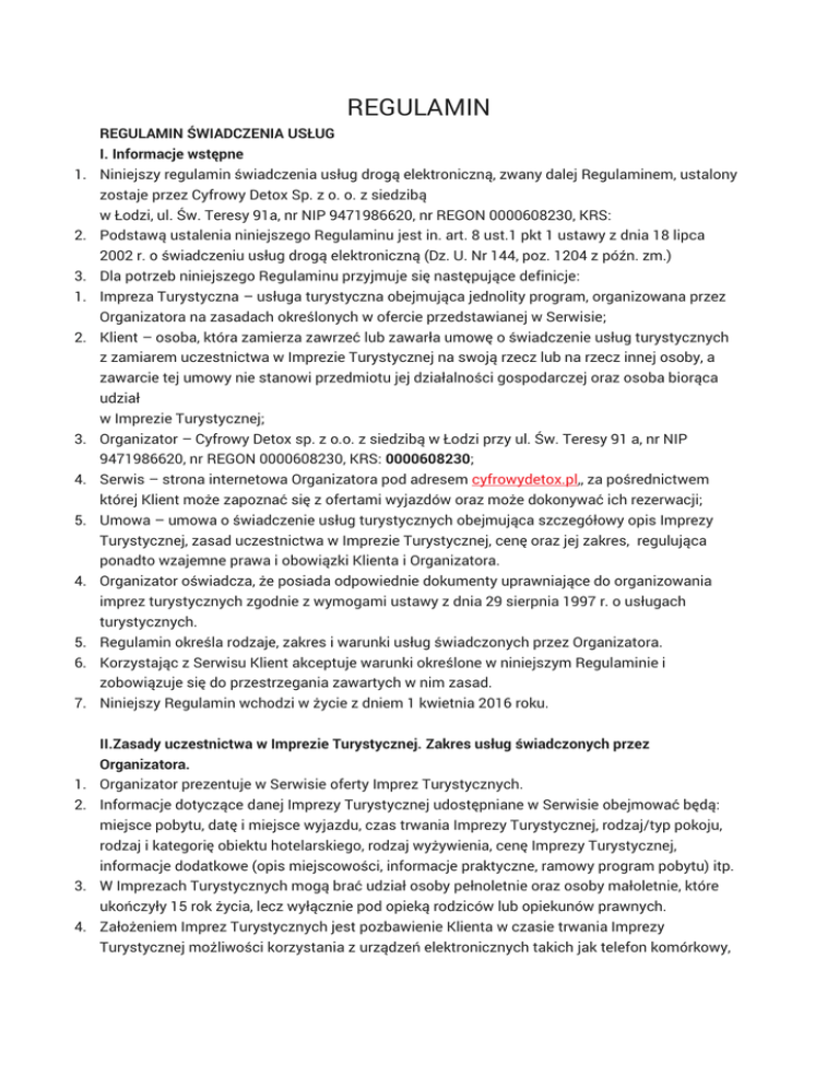 REGULAMIN REGULAMIN ŚWIADCZENIA USŁUG I. Informacje wstępne 1. Niniejszy regulamin świadczenia usług drogą elektroniczną, zwany dalej Regulaminem, ustalony zostaje przez Cyfrowy Detox Sp. z o. o. z siedzibą w Łodzi, ul. Św. Teresy 91a, nr NIP 9471986620, nr REGON 0000608230, KRS: 2. Podstawą ustalenia niniejszego Regulaminu jest in. art. 8 ust.1 pkt 1 ustawy z dnia 18 lipca 2002 r. o świadczeniu usług drogą elektroniczną (Dz. U. Nr 144, poz. 1204 z późn. zm.) 3. Dla potrzeb niniejszego Regulaminu przyjmuje się następujące definicje: 1. Impreza Turystyczna – usługa turystyczna obejmująca jednolity program, organizowana przez Organizatora na zasadach określonych w ofercie przedstawianej w Serwisie; 2. Klient – osoba, która zamierza zawrzeć lub zawarła umowę o świadczenie usług turystycznych z zamiarem uczestnictwa w Imprezie Turystycznej na swoją rzecz lub na rzecz innej osoby, a zawarcie tej umowy nie stanowi przedmiotu jej działalności gospodarczej oraz osoba biorąca udział w Imprezie Turystycznej; 3. Organizator – Cyfrowy Detox sp. z o.o. z siedzibą w Łodzi przy ul. Św. Teresy 91 a, nr NIP 9471986620, nr REGON 0000608230, KRS: 0000608230; 4. Serwis – strona internetowa Organizatora pod adresem cyfrowydetox.pl,, za pośrednictwem której Klient może zapoznać się z ofertami wyjazdów oraz może dokonywać ich rezerwacji; 5. Umowa – umowa o świadczenie usług turystycznych obejmująca szczegółowy opis Imprezy Turystycznej, zasad uczestnictwa w Imprezie Turystycznej, cenę oraz jej zakres, regulująca ponadto wzajemne prawa i obowiązki Klienta i Organizatora. 4. Organizator oświadcza, że posiada odpowiednie dokumenty uprawniające do organizowania imprez turystycznych zgodnie z wymogami ustawy z dnia 29 sierpnia 1997 r. o usługach turystycznych. 5. Regulamin określa rodzaje, zakres i warunki usług świadczonych przez Organizatora. 6. Korzystając z Serwisu Klient akceptuje warunki określone w niniejszym Regulaminie i zobowiązuje się do przestrzegania zawartych w nim zasad. 7. Niniejszy Regulamin wchodzi w życie z dniem 1 kwietnia 2016 roku. 1. 2. 3. 4. II.Zasady uczestnictwa w Imprezie Turystycznej. Zakres usług świadczonych przez Organizatora. Organizator prezentuje w Serwisie oferty Imprez Turystycznych. Informacje dotyczące danej Imprezy Turystycznej udostępniane w Serwisie obejmować będą: miejsce pobytu, datę i miejsce wyjazdu, czas trwania Imprezy Turystycznej, rodzaj/typ pokoju, rodzaj i kategorię obiektu hotelarskiego, rodzaj wyżywienia, cenę Imprezy Turystycznej, informacje dodatkowe (opis miejscowości, informacje praktyczne, ramowy program pobytu) itp. W Imprezach Turystycznych mogą brać udział osoby pełnoletnie oraz osoby małoletnie, które ukończyły 15 rok życia, lecz wyłącznie pod opieką rodziców lub opiekunów prawnych. Założeniem Imprez Turystycznych jest pozbawienie Klienta w czasie trwania Imprezy Turystycznej możliwości korzystania z urządzeń elektronicznych takich jak telefon komórkowy, laptop, tablet itp. Klient oświadcza, iż znane jest mu założenie Imprez Turystycznych i nie zgłasza i co do niego zastrzeżeń. 5. Imprezy Turystyczne obejmować będą również wszelkiego rodzaju zajęcia sportowe i rekreacyjne. 6. Klient deklaruje, że jest zdrowy i nie ma żadnych przeciwwskazań do uprawiania sportów. We wszelkich zajęciach będących częścią programu Imprezy Turystycznej bierze udział na własną odpowiedzialność. 7. Warunkiem wzięcia przez Klienta udziału w Imprezie Turystycznej jest wypełnienie przez Klienta, po dokonaniu rezerwacji, ankiety dotyczącej stanu zdrowia Klienta w zakresie choróbprzewlekłych, przebytych operacjach, urazach i alergiach na produkty żywnościowe. Organizator zastrzega sobie prawy odstąpienia od umowy z Klientem w razie, gdy na podstawie wyników ankiety stwierdzić będzie można, iż w związku z wzięciem udziału przez Klienta w Imprezie Turystycznej istnieje ryzyko utraty zdrowia lub życia. 8. Klient przyjmuje do wiadomości, że udział w Imprezie Turystycznej może się wiązać się z wysiłkiem fizycznym i może pociągać za sobą naturalne ryzyko i zagrożenie wypadkami, możliwość odniesienia obrażeń ciała i urazów fizycznych (w tym śmierci). 9. Rezerwacja Imprezy Turystycznej oraz dokonanie opłaty jednoznacznie oznacza, że Klient rozważył i ocenił charakter, zakres i stopień ryzyka wiążącego się z uczestnictwem w danej Imprezie Turystycznej i dobrowolnie zdecydował się podjąć to ryzyko, biorąc w niej udział na własną odpowiedzialność. 10. Przed podjęciem decyzji o uczestnictwie w Imprezie Turystycznej Organizator zaleca Klientom wykonanie profilaktycznych badań lekarskich mogących potwierdzić brak przeciwwskazań do udziału w imprezie. 11. Warunkiem uczestnictwa w Imprezie Turystycznej osoby niepełnoletniej jest pisemna zgoda opiekuna prawnego z zaświadczeniem o znajomości zagrożeń z pkt 5 powyżej. 12. Klient zobowiązany jest do bezwzględnego podporządkowania się obowiązującym przepisom bezpieczeństwa w czasie trwania Imprezy Turystycznej oraz do przestrzegania regulaminów obowiązujących w miejscach prowadzenia zajęć oraz do wykonywania poleceń przedstawiciela Organizatora. 13. Klient wyraża zgodę na nieodpłatne wykorzystanie wizerunku utrwalonego w formie zdjęć lub zapisu wideo w czasie trwania Imprezy Turystycznej oraz udziela Organizatorowi zgody na wykorzystanie go, w szczególności do zamieszczania i publikowania na stronach internetowych Organizatora, materiałach promocyjnych Organizatora, w katalogach z ofertą oraz profilach social media Organizatora. III. Zasady dokonywania rezerwacji i zawierania Umów. 1. Osoba dokonująca rezerwacji przyjmuje na siebie odpowiedzialność za zapłatę pełnej kwoty ceny Imprezy Turystycznej za wszystkie osoby wymienione w Umowie. 2. Osoba dokonująca rezerwacji musi być w chwili jej dokonywania pełnoletnia (uko