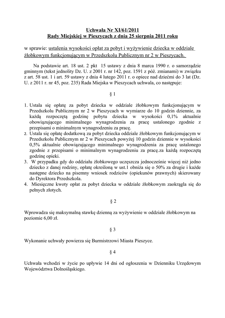 Uchwała Nr XI/61/2011 Rady Miejskiej w Pieszycach z dnia 25