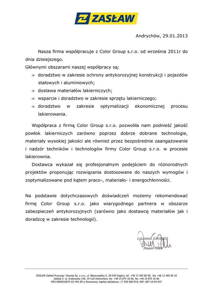 Andrychów, 29.01.2013 Nasza firma współpracuje z Color Group s.r.o. od września 2011r do dnia dzisiejszego. Głównymi obszarami naszej współpracy są: • doradztwo w zakresie ochrony antykorozyjnej konstrukcji i pojazdów stalowych i aluminiowych; • dostawa materiałów lakierniczych; • wsparcie i doradztwo w zakresie sprzętu lakierniczego; • doradztwo w zakresie optymalizacji ekonomicznej procesu lakierowania. Współpraca z firmą Color Group s.r.o. pozwoliła nam podnieść jakość powłok lakierniczych zarówno poprzez dobrze dobrane technologie, materiały wysokiej jakości ale również przez bezpośrednie zaangażowanie i nadzór techników i technologów firmy Color Group s.r.o. w procesie lakierownia. Dostawca wykazał się profesjonalnym podejściem do różnorodnych projektów proponując rozwiązania dostosowane do naszych wymogów i zoptymalizowane pod kątem praco-, materiało- i energochłonności. Na podstawie dotychczasowych doświadczeń możemy rekomendować firmę Color Group s.r.o. jako wiarygodnego partnera w obszarze zabezpieczeń antykorozyjnych (zarówno jako dostawcę materiałów jak i doradzcę w zakresie technologii). ZASŁAW Zakład Przyczep i Naczep Sp. z o.o., ul. Bieszczadzka 5, 38-540 Zagórz; tel. +48 13 465 60 00, fax +48 13 465 60 10 Zakład 2: ul. Krakowska 140, 34-120 Andrychów; tel. +48 33 875 16 06, fax +48 33 875 16 66 KRS 0000016875 XII WG SR w Rzeszowie; kapitał zakładowy: 17 500 000 PLN; NIP: 687-10-04-547