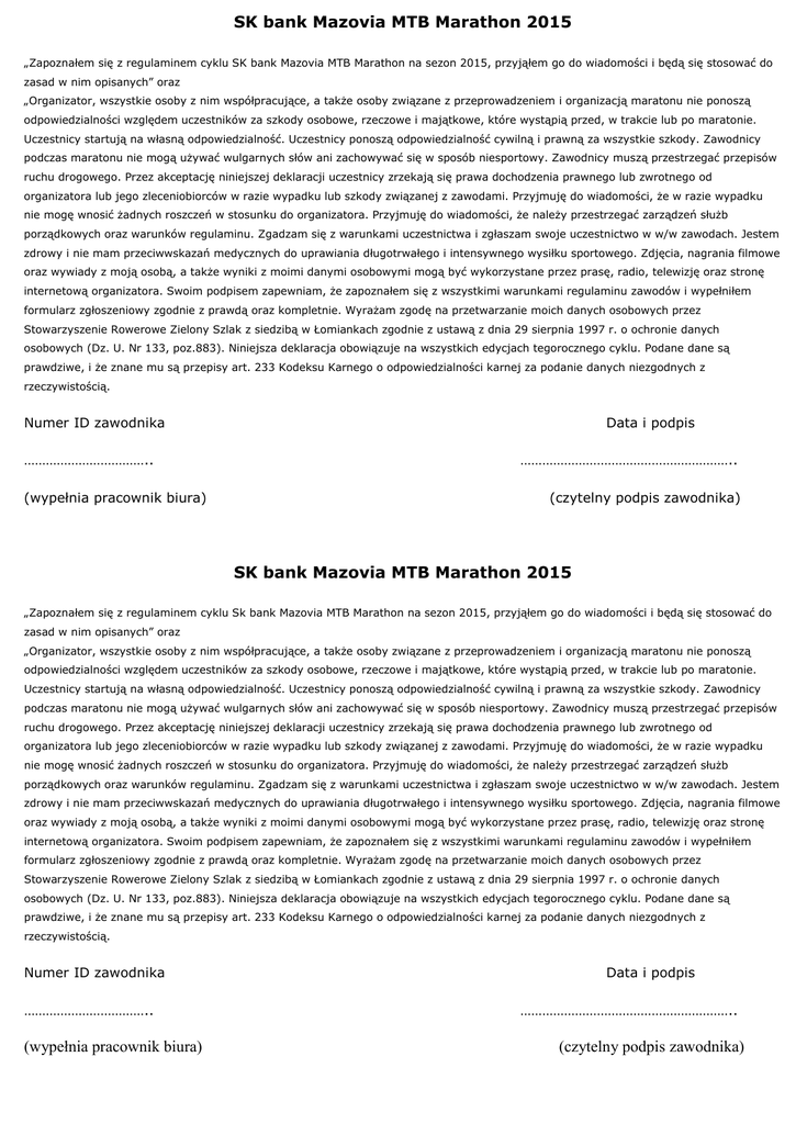 SK bank Mazovia MTB Marathon 2015 „Zapoznałem się z regulaminem cyklu SK bank Mazovia MTB Marathon na sezon 2015, przyjąłem go do wiadomości i będą się stosować do zasad w nim opisanych” oraz „Organizator, wszystkie osoby z nim współpracujące, a także osoby związane z przeprowadzeniem i organizacją maratonu nie ponoszą odpowiedzialności względem uczestników za szkody osobowe, rzeczowe i majątkowe, które wystąpią przed, w trakcie lub po maratonie. Uczestnicy startują na własną odpowiedzialność. Uczestnicy ponoszą odpowiedzialność cywilną i prawną za wszystkie szkody. Zawodnicy podczas maratonu nie mogą używać wulgarnych słów ani zachowywać się w sposób niesportowy. Zawodnicy muszą przestrzegać przepisów ruchu drogowego. Przez akceptację niniejszej deklaracji uczestnicy zrzekają się prawa dochodzenia prawnego lub zwrotnego od organizatora lub jego zleceniobiorców w razie wypadku lub szkody związanej z zawodami. Przyjmuję do wiadomości, że w razie wypadku nie mogę wnosić żadnych roszczeń w stosunku do organizatora. Przyjmuję do wiadomości, że należy przestrzegać zarządzeń służb porządkowych oraz warunków regulaminu. Zgadzam się z warunkami uczestnictwa i zgłaszam swoje uczestnictwo w w/w zawodach. Jestem zdrowy i nie mam przeciwwskazań medycznych do uprawiania długotrwałego i intensywnego wysiłku sportowego. Zdjęcia, nagrania filmowe oraz wywiady z moją osobą, a także wyniki z moimi danymi osobowymi mogą być wykorzystane przez prasę, radio, telewizję oraz stronę internetową organizatora. Swoim podpisem zapewniam, że zapoznałem się z wszystkimi warunkami regulaminu zawodów i wypełniłem formularz zgłoszeniowy zgodnie z prawdą oraz kompletnie. Wyrażam zgodę na przetwarzanie moich danych osobowych przez Stowarzyszenie Rowerowe Zielony Szlak z siedzibą w Łomiankach zgodnie z ustawą z dnia 29 sierpnia 1997 r. o ochronie danych osobowych (Dz. U. Nr 133, poz.883). Niniejsza deklaracja obowiązuje na wszystkich edycjach tegorocznego cyklu. Podane dane są prawdziwe, i że znane mu są przepisy art. 233 Kodeksu Karnego o odpowiedzialności karnej za podanie danych niezgodnych z rzeczywistością. Numer ID zawodnika …………………………….. (wypełnia pracownik biura) Data i podpis ………………………………………………….. (czytelny podpis zawodnika) SK bank Mazovia MTB Marathon 2015 „Zapoznałem się z regulaminem cyklu Sk bank Mazovia MTB Marathon na sezon 2015, przyjąłem go do wiadomości i będą się stosować do zasad w nim opisanych” oraz „Organizator, wszystkie osoby z nim współpracujące, a także osoby związane z przeprowadzeniem i organizacją maratonu nie ponoszą odpowiedzialności względem uczestników za szkody osobowe, rzeczowe i majątkowe, które wystąpią przed, w trakcie lub po maratonie. Uczestnicy startują na własną odpowiedzialność. Uczestnicy ponoszą odpowiedzialność cywilną i prawną za wszystkie szkody. Zawodnicy podczas maratonu nie mogą używać wulgarnych słów ani zachowywać się w sposób niesportowy. Zawodnicy muszą przestrzegać przepisów ruchu drogowego. Przez akceptację niniejszej deklaracji uczestnicy zrzekają się prawa dochodzenia prawnego lub zwrotnego od organizatora lub jego zleceniobiorców w razie wypadku lub szkody związanej z zawodami. Przyjmuję do wiadomości, że w razie wypadku nie mogę wnosić żadnych roszczeń w stosunku do organizatora. Przyjmuję do wiadomości, że należy przestrzegać zarządzeń służb porządkowych oraz warunków regulaminu. Zgadzam się z warunkami uczestnictwa i zgłaszam swoje uczestnictwo w w/w zawodach. Jestem zdrowy i nie mam przeciwwskazań medycznych do uprawiania długotrwałego i intensywnego wysiłku sportowego. Zdjęcia, nagrania filmowe oraz wywiady z moją osobą, a także wyniki z moimi danymi osobowymi mogą być wykorzystane przez prasę, radio, telewizję oraz stronę internetową organizatora. Swoim podpisem zapewniam, że zapoznałem się z wszystkimi warunkami regulaminu zawodów i wypełniłem formularz zgłoszeniowy zgodnie z prawdą oraz kompletnie. Wyrażam zgodę na przetwarzanie moich danych osobowych przez Stowarzyszenie Rowerowe Zielony Szlak z siedzibą w Łomiankach zgodnie z ustawą z dnia 29 sierpnia 1997 r. o ochronie danych osobowych (Dz. U. Nr 133, poz.883). Niniejsza deklaracja obowiązuje na wszystkich edycjach tegorocznego cyklu. Podane dane są prawdziwe, i że znane mu są przepisy art. 233 Kodeksu Karnego o odpowiedzialności karnej za podanie danych niezgodnych z rzeczywistością. Numer ID zawodnika …………………………….. (wypełnia pracownik biura) Data i podpis ………………………………………………….. (czytelny podpis zawodnika)