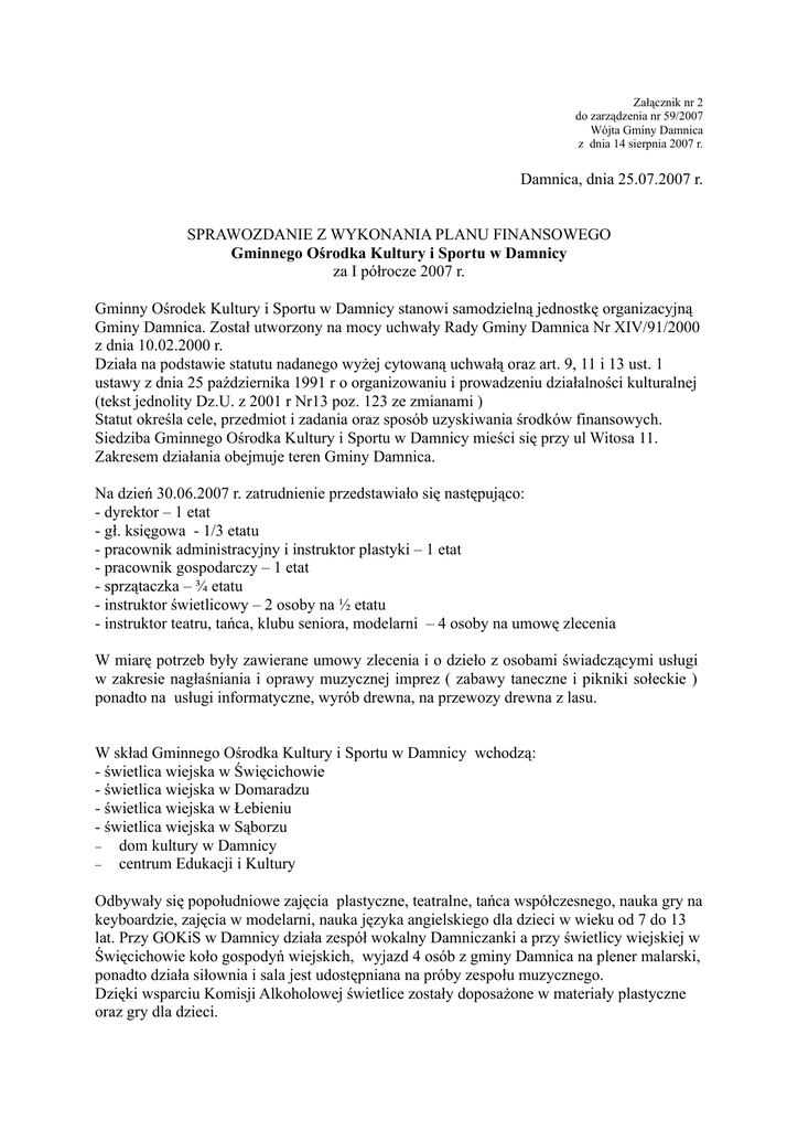 Załącznik nr 2 do zarządzenia nr 59/2007 Wójta Gminy Damnica z dnia 14 sierpnia 2007 r. Damnica, dnia 25.07.2007 r. SPRAWOZDANIE Z WYKONANIA PLANU FINANSOWEGO Gminnego Ośrodka Kultury i Sportu w Damnicy za I półrocze 2007 r. Gminny Ośrodek Kultury i Sportu w Damnicy stanowi samodzielną jednostkę organizacyjną Gminy Damnica. Został utworzony na mocy uchwały Rady Gminy Damnica Nr XIV/91/2000 z dnia 10.02.2000 r. Działa na podstawie statutu nadanego wyżej cytowaną uchwałą oraz art. 9, 11 i 13 ust. 1 ustawy z dnia 25 października 1991 r o organizowaniu i prowadzeniu działalności kulturalnej (tekst jednolity Dz.U. z 2001 r Nr13 poz. 123 ze zmianami ) Statut określa cele, przedmiot i zadania oraz sposób uzyskiwania środków finansowych. Siedziba Gminnego Ośrodka Kultury i Sportu w Damnicy mieści się przy ul Witosa 11. Zakresem działania obejmuje teren Gminy Damnica. Na dzień 30.06.2007 r. zatrudnienie przedstawiało się następująco: - dyrektor – 1 etat - gł. księgowa - 1/3 etatu - pracownik administracyjny i instruktor plastyki – 1 etat - pracownik gospodarczy – 1 etat - sprzątaczka – ¾ etatu - instruktor świetlicowy – 2 osoby na ½ etatu - instruktor teatru, tańca, klubu seniora, modelarni – 4 osoby na umowę zlecenia W miarę potrzeb były zawierane umowy zlecenia i o dzieło z osobami świadczącymi usługi w zakresie nagłaśniania i oprawy muzycznej imprez ( zabawy taneczne i pikniki sołeckie ) ponadto na usługi informatyczne, wyrób drewna, na przewozy drewna z lasu. W skład Gminnego Ośrodka Kultury i Sportu w Damnicy wchodzą: - świetlica wiejska w Święcichowie - świetlica wiejska w Domaradzu - świetlica wiejska w Łebieniu - świetlica wiejska w Sąborzu − dom kultury w Damnicy − centrum Edukacji i Kultury Odbywały się popołudniowe zajęcia plastyczne, teatralne, tańca współczesnego, nauka gry na keyboardzie, zajęcia w modelarni, nauka języka angielskiego dla dzieci w wieku od 7 do 13 lat. Przy GOKiS w Damnicy działa zespół wokalny Damniczanki a przy świetlicy wiejskiej w Święcichowie koło gospodyń wiejskich, wyjazd 4 osób z gminy Damnica na plener malarski, ponadto działa siłownia i sala jest udostępniana na próby zespołu muzycznego. Dzięki wsparciu Komisji Alkoholowej świetlice zostały doposażone w materiały plastyczne oraz gry dla dzieci. W okresie od I do VI odbyły się następujące imprezy zorganizowane przez GOKiS w Damnicy: - turniej szachowy 4 pory roku – I/2007, VI/2007 – 2 edycje - Karnawałowy Bal seniora i Karnawałowy Bal Rolnika - oficjalne otwarcie Centrum Edukacji i Kultury przy współpracy z biblioteką, - organizacja zajęć podczas ferii zimowych ( min. - spotkanie przy muzyce - Karaoke, oraz dyskoteki dla dzieci i zajęcia świetlicowe) - amatorski turniej wyciskania sztangi leżąc - Dzień Kobiet - Powiatowe Spotkanie z Poezja (Nie)Profesjonalną - Tryptyk wielkopostny - Gminne Obchody Świąt Majowych, - rajd pieszy i rowerowy RINO – przy współpracy z gminami Potegowo-Damnica (współpraca z Głosem Pomorza Nadleśnictwem Damnica oraz domem kultury w Potęgowie i sołectwem Strzyżyno) - dni Damnicy-600-lecie Damnicy - koncert Punktu Edukacji Muzycznej - czerwiec - sołeckie pikniki rodzinne Podstawą gospodarki finansowej Gminnego Ośrodka Kultury i Sportu w Damnicy jest plan przychodów i wydatków. W planie przychodów i wydatków określono zasoby osobowe, rzeczowe i finansowe GOKiS. Szczegółowe sprawozdanie z realizacji przychodów i wydatków za I półrocze 2007 przedstawia poniższa tabela. Lp. Wyszczególnienie 1. Przychody - dotacje otrzymane z budżetu gminy -odsetki bankowe - przychody własne - wpływy z lat ubiegłych (reund. PUP) - stan konta na początek roku Przychody Wydatki 146.467,93 137.500,00 120,11 7.770,00 333,53 744,29 2. Wynagrodzenia -wynagrodzenia z osobowego fund płac - wynagrodz z bezosobowego fund płac 77.661,40 53.271,40 24.390,00 3. Ubezpieczenia społeczne i inne świadcz. - składki ZUS pokr przez pracodawcę - badania okresowe pracowników 11.232,78 11.176,78 56,00 Wydatki rzeczowe: 25.808,69 4. - energia - olej opałowy - gaz i oleje - materiały budowlane - materiały biurowe - środki czystości -pozostałe wydatki – organizacja imprez własnych, pikników sołeckich - zakup odtwarzaczy DVD, mikrofonów, statyw, wyrzynarki 5. 3.123,77 3.270,00 1.735,65 481,68 1.801,86 222,72 14.277,01 896,00 Usługi obce: - remont żuka - usługi telefoniczne - usługi bankowe - usługi pocztowe - pobór wody - odprowadzenie ścieków - usługi kominiarskie - ochrona obiektów GOKiS i Ceik -wywóz nieczystości i wynajm toalet - usługi związane z organizacja imprez - przegląd kserokopiarki - nagłośnienie imprez - zabezpieczenie medyczne imprez - pozostałe usługi ( akredytacje, naprawy sprzętu, regeneracja gaśnic i inne ) - nagrody w konkursie tanecznym i wokalnym 23.323,05 1.140,46 2.987,76 279,36 301,25 527,80 365,98 1.104,15 1.410,20 1.198,36 4.118,43 429,44 1.000,00 450,00 Pozostałe wydatki - ubezpieczenia majątkowe (4 świetlice, budynek GOKiS, budynek Ceik, wyposażenie, imprezy plenerowe i OC Zuka) - używanie samochodu prywatnego do celów służbowych - program antywirusowy KACPERSKI 3.994,37 7. Świadczenia na rzecz pracowników - świadczenie urlopowe 1.625,80 8. Stan gotówki na rachunku bankowym i w kasie na dzień 30.06.2007 r. 6. X OGÓŁEM 3.899,86 4.110,00 2.820,00 1.059,20 115,17 2.821,84 146.467,93 146.467,93 Stan należności i zobowiązań na dzień 30.06.2007 r.: 1. Zobowiązania wobec ZUS – płatne do 15.07.2007 r. 2. Zobowiązania wobec Urzędu Skarbowego płatne do 20.07.2007 r. - podatek dochodowy od osób fizycznych – 3. Należności - RUCH Słupsk - Dawidowska M – Soborze – 4. Zobowiązania i należności wymagalne nie występują. Sporządził: Łata Katarzyna 3.259,29 1.167,00 400,00 250,00