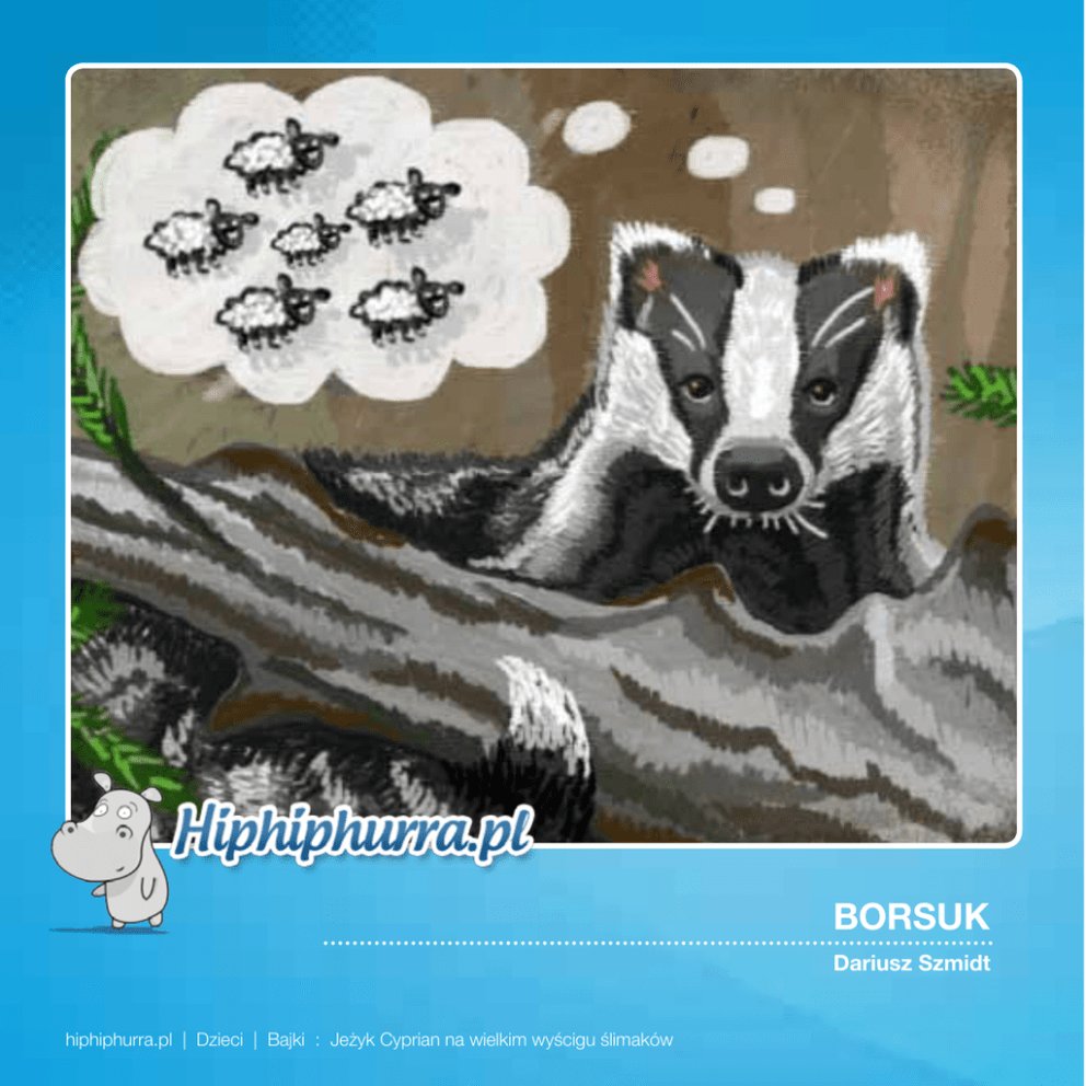 BORSUK Dariusz Szmidt hiphiphurra.pl | Dzieci | Bajki : Jeżyk Cyprian na wielkim wyścigu ślimaków BORSUK : Dariusz Szmidt Doktor wkładał nowy sweter, Co na porę miał jesienną, Kiedy wszedł pan Borsuk Mietek Chorujący na bezsenność. “Idzie zima mój doktorze. Ległbym chętnie na podłogę. Kiedy jednak się położę, To w ogóle spać nie mogę. Przeliczyłem owiec stado, W końcu baran mnie wybudził. Już za sowy idąc radą Przed zaśnięciem liczę ludzi. Jednak słabe są wyniki. Krucho będzie z moją pracą. Ja po śnie piszę senniki. Gdy nie piszę, wszyscy tracą.” Borsuk zaczął opowiadać Sennych marzeń swych tysiące. Do tej pory jeszcze gada, Choć minęły dwa miesiące. Doktor ledwie zapamiętał Sam początek tej przemowy. Myślał jeszcze: “Co tam święta...” Wreszcie zapadł w sen zimowy. hiphiphurra.pl | Dzieci | Bajki : Borsuk