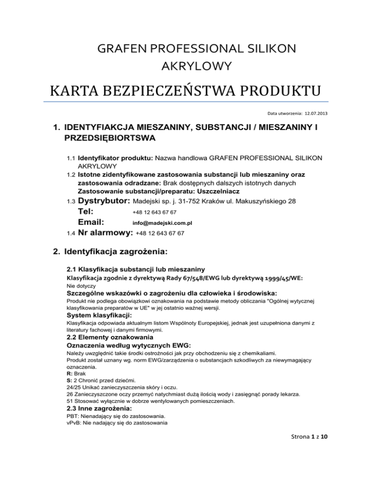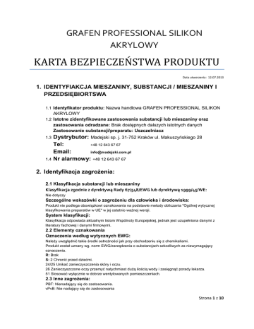 GRAFEN PROFESSIONAL SILIKON AKRYLOWY KARTA BEZPIECZEŃSTWA PRODUKTU Data utworzenia: 12.07.2013 1. IDENTYFIAKCJA MIESZANINY, SUBSTANCJI / MIESZANINY I PRZEDSIĘBIORTSWA 1.1 Identyfikator produktu: Nazwa handlowa GRAFEN PROFESSIONAL SILIKON AKRYLOWY 1.2 Istotne zidentyfikowane zastosowania substancji lub mieszaniny oraz zastosowania odradzane: Brak dostępnych dalszych istotnych danych Zastosowanie substancji/preparatu: Uszczelniacz Dystrybutor: Madejski sp. j. 31-752 Kraków ul. Makuszyńskiego 28 Tel: +48 12 643 67 67 Email: [email protected] 1.4 Nr alarmowy: +48 12 643 67 67 1.3 2. Identyfikacja zagrożenia: 2.1 Klasyfikacja substancji lub mieszaniny Klasyfikacja zgodnie z dyrektywą Rady 67/548/EWG lub dyrektywą 1999/45/WE: Nie dotyczy Szczególne wskazówki o zagrożeniu dla człowieka i środowiska: Produkt nie podlega obowiązkowi oznakowania na podstawie metody obliczania "Ogólnej wytycznej klasyfikowania preparatów w UE" w jej ostatnio ważnej wersji. System klasyfikacji: Klasyfikacja odpowiada aktualnym listom Wspólnoty Europejskiej, jednak jest uzupełniona danymi z literatury fachowej i danymi firmowymi. 2.2 Elementy oznakowania Oznaczenia według wytycznych EWG: Należy uwzględnić takie środki ostrożności jak przy obchodzeniu się z chemikaliami. Produkt został uznany wg. norm EWG/zarządzenia o substancjach szkodliwych za niewymagający oznaczenia. R: Brak S: 2 Chronić przed dziećmi. 24/25 Unikać zanieczyszczenia skóry i oczu. 26 Zanieczyszczone oczy przemyć natychmiast dużą ilością wody i zasięgnąć porady lekarza. 51 Stosować wyłącznie w dobrze wentylowanych pomieszczeniach. 2.3 Inne zagrożenia: PBT: Nienadający się do zastosowania. vPvB: Nie nadający się do zastosowania Strona 1 z 10 GRAFEN PROFESSIONAL SILIKON AKRYLOWY KARTA BEZPIECZEŃSTWA PRODUKTU Data utworzenia: 12.07.2013 3. Skład/informacja o składnikach: Opis: Mieszanka z niżej wymienionych składników z bezpiecznymi domieszkami. Classification of Substance Substance Name CAS Number EINECS/ELINCS Number Classification in Mixture Hazard Symbol R phrases(*) R: 65 Solvent refined middle distillate (petroleum)* 64741-91-9 265-093-4 Xn; T 2-Butoxyethanol 111-76-2 203-905-0 Xn Mixture of: 5-chloro-2-methyl-4isothiazolin-3-one [EC no. 247500-7] and 2-methyl-2H -isothiazol-3-one [EC no. 220-239-6] (3:1); 55965-84-9 Sodium Acrylate 7446-81-3 Sodium 2-(2dodecyloxyethoxy)ethyl sulphate - R: 20/21/22-36/38 - T; C; N; R: 23/24/25-34-4350/53 - 231-209-7 Xi R 36/38: R 22: - 3088-31-1 221-416-0 Xi R 36/38: R 22: - Ammonia 1336-21-6 215–647–6 C; N; C; N R: 34-50 - Chloroalkanes C14-17 85535-85-9 287-477-0 N R64 - R66 ;R50-53 R 64 Ethane-1,2-diol 107-21-1 203-473-3 Xn R22 - * Nota N nie ma zastosowania do ww. złożonej ropopochodnej. Substancja ta nie jest klasyfikuje się jako rakotwórczej, gdyż znany jest pełny proces rafinacji i wykazano, że substancja, z której została otrzymana, nie jest rakotwórcza. Pełna treść przytoczonych wskazówek dotyczących zagrożeń znajduje się w rozdziale 16. Strona 2 z 10 GRAFEN PROFESSIONAL SILIKON AKRYLOWY KARTA BEZPIECZEŃSTWA PRODUKTU Data utworzenia: 12.07.2013 4. Środki pierwszej pomocy: 4.1 W przypadku kontaktu z oczami: Trzymać oczy otwarte i przemywać dużą ilością letniej wody, przez (co najmniej 10 minut) zasięgnąć porady lekarza. 4.2 W przypadku kontaktu ze skórą: Zetrzeć. Przemyć dużą ilością wody z mydłem. Jeśli podrażnienie nie ustępuje, zasięgnąć porady lekarza. 4.3 W przypadku połknięcia: Nie wywoływać u pacjenta wymiotów.. Nigdy nie podawać niczego doustnie osobie nieprzytomnej. Zasięgnąć porady lekarza. 4.4 W przypadku wdychania: Weź osobę na świeże powietrze 5. Postępowanie w przypadku pożaru: 5.1 Przydatne środki gaśnicze: CO2, proszek gaśniczy lub strumień wody. Większy pożar zwalczać strumieniem wody lub pianą odporną na działanie alkoholu. 5.2 Szczególne zagrożenia związane z substancją lub mieszaniną Przy ogrzewaniu lub w wypadku pożaru możliwe jest tworzenie się trujących gazów. Tlenek węgla (CO), Dwutlenek krzemu, Formaldehyd, (Ślady) Zagrożenie podczas walki z ogniem: Nieznane 5.3 Informacje dla straży pożarnej Specjalne wyposażenie ochronne: Nosić pełne ubranie ochronne. Nosić urządzenie ochrony dróg oddechowych niezależnie od powietrza otoczenia. Nie odpowiednie środki gaśnicze Nieznane 6. Postępowanie w przypadku niezamierzonego uwolnienia do środowiska: 6.1. Indywidualne środki ostrożności, wyposażenie ochronne i procedury w sytuacjach awaryjnych: Nosić osobistą odzież ochronną. Nie wdychać pary/rozpylonej cieczy. Zadbać o wystarczające wietrzenie. 6.2. Środki ostrożności w zakresie ochrony środowiska: Szczególne środki nie są konieczne. 6.3. Metody i materiały zapobiegające rozprzestrzenianiu się skażenia i służące do usuwania skażenia: Zdjąć mechanicznie. Materiał skażony usunąć, jako odpad wg punktu 13. 6.4. Odniesienia do innych sekcji Informacje na temat bezpiecznej obsługi patrz rozdział 7. Informacje na temat osobistego wyposażenia oc Strona 3 z 10 GRAFEN PROFESSIONAL SILIKON AKRYLOWY KARTA BEZPIECZEŃSTWA PRODUKTU Data utworzenia: 12.07.2013 7. Transport i przechowywanie Sposób transportu: 7.1 Środki ostrożności dotyczące bezpiecznego postępowania: W trakcie aplikacji i utwardzania produktu wydziela się kwas octowy, który działa drażniąco na oczy i skórę. Wskazówki dla ochrony przeciwpożarowej i przeciwwybuchowej: Nie są potrzebne szczególne zabiegi. 7.2 Warunki bezpiecznego magazynowania, łącznie z informacjami dotyczącymi wszelkich wzajemnych niezgodności Składowanie: Wymagania w stosunku do pomieszczeń składowych i zbiorników: Brak szczególnych wymagań. Wskazówki odnośnie wspólnego składowania: Nie konieczne. Dalsze wskazówki odnośnie warunków składowania: Składować w dobrze zamkniętych pojemnikach w chłodnym i suchym miejscu. Chronić przed mrozem. Przechowyw