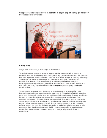 Cze g o się n au c z yl i śm y w A u st r al ii i cz y m si ę ch c em y p od zi el i ć? St re sz c z en ie w y kł ad u C ath y D ay Sla j d 1 -4 D ek la ra cj a nas z eg o s t a no w is k a T e n d ok u m e nt p ow s ta ł w c elu z a p oz na n i a na uc z yc ie li z nas z y m pod ej ś c ie m d o M edy ta c j i Ch rz eś c ij a ńs k i ej i uś w ia d om ie nia , ż e j es t t o dl a na s s pr aw a p r ior yt et ow a. J es t t o w y ra ź na w iz j a w nas z e j d iec ez j i. Zna j d uj e s ię ta m in fo rm ac j a o d na s z eg o Bis k upa , m ó wim y o k at olic k im k ont e kś c ie m ed y ta cj i, o c hrz e ś c ij a ńs k iej t ra d yc j i k ont em p l at yw nej , d a je my wy ra ź n e ws k az ó w k i, j ak uc z yć M ed y ta c j i Chr z eś c ij a ńs k iej i p od k reś lam y i n kl u zy wn ą na t u rę t ej pr a k ty k i m od l it e w n ej . Ta os t at nia s p raw a j es t j ed n ym z p ods t a w ow yc h p o w od ów , d la k t ó ry c h w yb ra liś m y prom ow a nie M ed yt a c j i Chrz eś c ij a ńs k iej . W e d łu g na s z eg o d ośw ia dc z eni a j es t t o na j ba rdz iej e ga lita rna f orm a m od lit w y . D z iec i z z es p o łem D ow n ' a m ogą b ez p rob lem ów m e dy t o wa ć z e s wo im i k ol eg am i. D z iec i, kt ór e p o ws z elic h f o rm ac h w y k orz y s ta nia z na j d uj ą u k oj e nie w m ed y ta c j i, m ed yt ac j a r ów n ie d ob rz e od nos i s ię do uc z niów b a rdz o z d oln yc h j a k i t y m m niej z d o lny c h. U cz n iow ie m ów ią na m , ż e j es t t o j ed y n e z aj ęc i e w s z ko le, gd z i e nie c z uj ą s ię oc e nia ni lu b dy s k ry m inow a n i. J eś li ma j ą t r ud n oś c i z cz y t a nie m, m og ą b ez t rud u m ed yt owa ć , w s z y s c y c z uj ą s ię r ów n i, k ie d y m ed yt uj ą . Ern i e Ch ri sti e Sla j d 5 M ed yt y jem y p op rz ez wy ci sz en i e i b e zru c h P rz ek az uj em y w ied z ę w sp os ó b pros t y . M ed y t ac j a j es t p ros t a , t o my j es t eś m y s k om p lik ow a n i. N iec h na uc z a nie b ędz ie p ros t e i k ons e k w ent ne. Sla j d 6 W Me d y t ac ji Ch rze śc i j ań ski e j kon c en tru je my si ę n a n as ze j m an t rz e i n ic zy m wi ę c ej . Jes z cz e j ed n o p od k reś l eni e p r os t ot y na sz ej p ra kt yk i. M a nt ra M a - ra na -t ha j est ś w ięt y m m s low em -m od l it w ą c hrz eś c ij a n. Ty lk o t eg o s łow a ucz y m y i j e g o s ię t rz y m am y . Sla j d 7 M a r an at h a je st je d n a z n a js t ar sz yc h m od l it w c h r ze ś c i j ań ski c h i zn ac zy P rz y jd ź P an ie Na w et m a łe d z iec i m og ą p rz yj ą ć p r os t ot ę t ej c h rz eś c ij a ńs k i ej m a nt ry . Sla j d 8 Usp o ka j a m si ę i si ad a m W yp r o sto wu ję krę g os łu p P rz y m y ka m o cz y i kł ad ę d ł on i e n a ko l an a W yc i sz am si ę od d yc h a ją c woln o i g ł ęb o ko, j este m sp o ko jn y a l e też u w aż n y Z ac z y n a m p o wt a rz ać ci c h o m an t r ę Ni e p rz e st a ję p o w ta rz an i a m an t ry i sku p i a m si ę n a ni e j Je śli mn i e c o ś r oz p ro szy , p o wr a c am d o p owt a rz an i a m an t ry J a k z a b rz mi d zwo n e k p om a łu ot wi er a m oc z y Dz i ę ku ję B og u za b y ci e p rz y mn ie w ci szy Ta p ros ta ins t r uk c ja p ow ta rz a na j est p rz ed m ed yt ac ją . Wa ż ny j est pr os t y pr z ek az , p ow ta rz a l noś ć i p r ób u j m y n ie k om p lik ow ać c z as u m od l it w y . Sla j d 9 W aż n e je st , a b y n a we t m a ł e d zi ec i n au c z y ły si ę p rz eb y wać w b ez ru ch u , a n ie t y lk o by ć c ic h o. Bez ru ch to c o in n e go n i ż n i eod z y wa n ie si ę . W b ez ru ch u Bó g p rz e m a wi a d o se rc d zi ec i i od kr y w a j ą on e Je g o m iło ś ć, ja k ą d a rzy k a żd e z n i c h o sob i ści e . (Bi s ku p M ic h ael P ut n ey ) Jes t ba rd z o wa ż n e, ż eb y z d ob yć p o pa rc ie p as t erz y tw oj eg o K ośc io ła . Nas z b is k up M ic ha e l P ut ne y j est ws pa ni a łym p a t r onem M ed y t ac j i Chr z eś c ij a ńs k iej . Cz ęs t o w iz y t uj e s z k o ły i m ed y t uj e z uc z nia m i. D ob rz e j es t w ięc p oin fo rm ow ać lok a l neg o b is k up a i ks ięż y , ż e c hc es z uc z y ć m ed yt ac j i i uz y s ka ć ic h w s pa rc ie. W ie lu k s ięży w nas z ej di ec ezj i z ap ra s za ło nas b y p rz y jś ć d o ic h pa r af ii by p op ro w a dz ić d la pa ra fia n r ek ole kc j e i s p ot k a n ia in fo rm ac y j n e. C ath y Sla j d 10 T y z aś, g d y ch c e sz się m o d li ć , we jdź d o swe j i z d eb ki , z a m kn i j d rz wi i m ód l si ę d o Ojc a t we g o, kt ó r y je st w u kr y ci u . A Ojci ec tw ó j, któ ry wi d zi w u kr y ci u , o dd a t o b ie . (M t 6, 6) M edy ta c j a Chrz eś c ij ańs k a m a s w e k orz en ie w P iś m ie Św ięt y m. L ek t u ra P is m a Św ię t eg o m oż e b y ć w z b og ac o na p rz ez M ed y t a c je Chr z eś c ij a ńs k ą . P ra w ie k a ż dą m ed y t a c ję p op rz edz a m y n aw i ąz a nie m do P is m a Św i ęt eg o. Ern i e Sla j d 11 ,1 2 ,1 3 K o nt e m p la c j a j es t p o ko rn y m i ub og im p ow ier z e niem s ię N ie z a ws z e m oż na roz m y ś lać , a le z a ws z e m oż na w ej ś ć w k ont em p l ac j ę, niez a leż nie od wa run k ów z dr ow ia , p ra c y c z y uc z uc iow oś c i. K o nt e m p la c j a j es t m ilc z eni em , "s y mb ole m ś w iat a, kt óry na dc ho dz i", lu b "m i lc z ąc ą m iłoś c ią " . S łow a w k o nt em pla c j i n ie m aj ą c ha ra k t e ru dy s k u rs y w ne go , lec z s ą n ic z y m is k ry , k tó re za p a la j ą o g ie ń m iłoś c i. W ia r yg od n e na uc z a n ie na t em a t m od litw y k ont em p lac y jn ej z na j d uj em y w Kat ec hiz m ie . Nas t ęp ne 3 s la j dy s ą za c z erp nię te z Ka t ec hiz m u . Ca ły p r og ra m ed uk ac j i re li gij n ej m us i n aw iąz y wa ć d o Ka t ec hiz m u i c hc ieli b yś m y p 