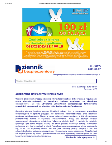 21.03.2013 Dziennik Ubezpieczeniowy :: Zapomniana sztuka formułowania myśli Nr (3177) 2013-02-07 Ten egzemplarz został wysłany na adres: [email protected]. Wokół likwidacji Data publikacji: 2013-02-07 Dz.U. nr: 3177 Zapomniana sztuka formułowania myśli Ważnym elementem procesu szkolenia likwidatorów jest nie tylko wiedza o regulacjach ustaw ubezpieczeniowych, o meandrach kodeksu cywilnego czy aktualnym orzecznictwie, ale też utrwalanie umiejętności samodzielnego formułowania uzasadnień kierowanych do klientów. - Monika Borowiecka-Paczkowska Ostatnim etapem każdego procesu likwidacji szkody jest przygotowanie stanowiska ubezpieczyciela w sprawie przyjęcia lub odrzucenia odpowiedzialności oraz wysokości należnego odszkodowania. Pisma te mogą dotyczyć spraw prostych, w których wystarczy poinformować klienta o wysokości odszkodowania, mogą też dotyczyć kwestii wymagających dokładnego wyjaśnienia "dlaczego właśnie tak?". I właśnie te ostatnie sprawiają tyle samo kłopotu każdej ze stron procesu likwidacji szkody. Likwidator zastanawia się, jak to napisać, a klient / poszkodowany po przeczytaniu pisma zastanawia się, o co tak naprawdę chodzi. Bo nie jest filozofią podjąć decyzję - nie ma odpowiedzialności, ustalamy przyczynienie, nie uznajemy całego roszczenia. Filozofią jest tak napisać pismo, by klient / poszkodowany zrozumiał argumenty ubezpieczyciela i z tymi konkretnymi argumentami polemizował. Napisanie dobrego pisma to dziennikubezpieczeniowy.pl/druk.php5 1/3 21.03.2013 Dziennik Ubezpieczeniowy :: Zapomniana sztuka formułowania myśli Nie jest łatwo połowa sukcesu. Rozpoczynając pracę jako likwidator, usłyszałam kiedyś, że napisanie dobrego pisma to połowa sukcesu. I do dziś zgadzam się z tym twierdzeniem. Zdarza mi się bowiem nadal spotykać z przypadkami, w których klient, odwołując się od wydanej przez ubezpieczyciela decyzji, swoje pismo zaczyna od słów "nie rozumiem dlaczego....". A przecież można było uniknąć odwołania gdyby w piśmie przywołać konkretne argumenty opisane językiem zrozumiałym dla zwykłego śmiertelnika. A nie jest to łatwe. Regulacje dotyczące sposobu ustalania odpowiedzialności, ustalania wysokości należnego odszkodowania najeżone są artykułami, paragrafami, wyrokami, uchwałami i chyba naturalnym jest by się na nie powoływać. Ale rozpoczynanie pisma decyzyjnego od przytoczenia wszystkich paragrafów nie jest dobrym rozwiązaniem. Bo już po pierwszym akapicie klient wyrzuca pismo do kosza, mówiąc "no tak, znowu mnie oszukali". By proces likwidacji był szybszy przygotowywane są Całkiem niedawno prowadziłam szkolenie, na którym szablony decyzji i jednym z elementów było samodzielne napisanie odpowiedzi. Brak słów decyzji. Na czas szkolenia ustaliliśmy z uczestnikami, że zapominamy o szablonach i sami piszemy decyzję. I co się okazało? Że trudno jest się pozbyć złych nawyków w tym zakresie. Pierwsze pisma przypominały decyzje urzędów skarbowych lub innych organów administracyjnych, czyli po prostu odstraszały. Dodatkowo odczytane przez autorów na głos były negatywnie odbierane przez innych uczestników. Na moje pytanie - czy klient zrozumiał dlaczego ustalono w sprawie przyczynienie? - padała odpowiedź "nie". Jeżeli widzą to doświadczeni likwidatorzy, to co dopiero ma powiedzieć klient. Jestem osobą, która przerażona jest degradacją, jaka zachodzi w kulturze języka polskiego. Coraz częściej nie potrafimy jasno sformułować myśli. Dlatego szukamy różnego typu gotowych rozwiązań takich jak szablony życzeń świątecznych, imieninowych, urodzinowych itp. To samo dzieje się w likwidacji szkód. By proces likwidacji był szybszy przygotowywane są szablony decyzji i odpowiedzi, do których system sam wstawia dane poszkodowanego i gotowe. Problem powstaje wtedy, gdy trzeba wydać decyzję nieszablonową. I nie chodzi o to, że likwidator nie wie dlaczego podejmuje taką decyzję, ale nie potrafi napisać pisma powołującego się na właściwe argumenty. Nie potrafi przedstawić klientowi przyczyn wydania właśnie takiej decyzji. Poza schemat Problem powstaje, gdy trzeba wydać decyzję nieszablonową. Dlatego ważnym elementem procesu szkolenia likwidatorów jest nie tylko wiedza o regulacjach ustaw ubezpieczeniowych, o meandrach kodeksu cywilnego czy aktualnym orzecznictwie, ale też utrwalanie umiejętności samodzielnego formułowania uzasadnień kierowanych do klientów. By pismo ubezpieczyciela nie było kolejnym dokumentem zawierającym niezrozumiały urzędniczy bełkot, który wywoływać będzie tylko irytację i składanie kolejnych odwołań. A przecież każde odwołanie to czas poświęcony na jego przeczytanie i przygotowanie odpowiedzi, to niepotrzebnie wydane pieniądze. Identyczne przemyślenia kieruję do pełnomocników, którzy też wybierają szablonową drogę na skróty. Nie zawsze skuteczną, a równie irytującą (tym razem dla likwidatorów). W tym obszarze również przydałoby się trochę staranności w aspekcie indywidualnego podejścia do opracowywanych spraw. Monika Borowiecka-Paczkowska MBP Szkolenia Ubezpieczeniowe Archiwum: Wokół likwidacji dziennikubezpieczeniowy.pl/druk.php5 2/3 21.03.2013 Dziennik Ubezpieczeniowy :: Zapomniana sztuka formułowania myśli Strona przygotowana przez Ogma Sp. z o.o. dziennikubezpieczeniowy.pl/druk.php5 3/3