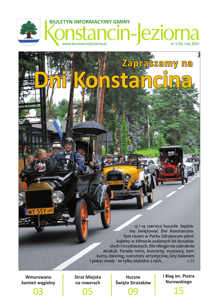 BIULETYN INFORMACYJNY GMINY www.konstancinjeziorna.pl nr 5 (9), maj 2015 Zapraszamy na Dni Konstancina 13 i 14 czerwca hucznie będziemy świętować Dni Konstancina. Tym razem w Parku Zdrojowym piknikujemy w klimacie szalonych lat dwudziestych i trzydziestych. Dla nikogo nie zabraknie atrakcji. Parada retro, koncerty, wystawy, konkursy, dancing, warsztaty artystyczne, loty balonem i pokaz mody - to tylko niektóre z nich. s.13 Wmurowano kamień węgielny 03 Straż Miejska na rowerach 05 Huczne Święto Strażaków 09 I Bieg im. Piotra Nurowskiego 15 /2/ Sprawozdanie z VII sesji Rady Miejskiej Podczas VII sesji Rady Miejskiej, która odbyła się 29 kwietnia, radni zatwierdzili sprawozdanie finansowe za 2014 rok m.in. Konstancińskiego Domu Kultury i Bilblioteki Publicznej. Przyjęty został także program opieki nad zwierzętami bezdomnymi. Budżet Rada podjęła następujące uchwały: n w sprawie zmian uchwały budżetowej na rok 2015 (uchwała nr 69/ VII/5/2015) n w sprawie zmiany Wieloletniej Prognozy Finansowej Gminy Konstancin-Jeziorna na lata 2015-2020 (uchwała nr 70/VII/5/2015) n w sprawie udzielenia pomocy finansowej województwu mazowieckiemu (uchwała nr 71/VII/5/2015) n w sprawie udzielenia pomocy finansowej w formie dotacji celowej dla powiatu piaseczyńskiego (uchwała nr 72/VII/5/2015) Roczne sprawozdania finansowe Radni zatwierdzili roczne sprawozdania finansowe za 2014 rok: n Biblioteki Publicznej w Konstancinie-Jeziornie (uchwała nr 77/ VII/5/2015) n Konstancińskiego Domu Kultury w Konstancinie-Jeziornie (uchwała nr 78/VII/5/2015) n Samodzielnego Publicznego Zespołu Zakładów Opieki Zdrowotnej w Konstancinie-Jeziornie (uchwała nr 79/VII/5/2015) Nieruchomości n Rada Miejska wyraziła zgodę na aktualizację obliczonych udziałów w nieruchomości wspólnej, stanowiącej prawo własności gruntu oraz części budynku i urządzeń, które nie służą wyłącznie do użytku właścicieli lokali usytuowanych w budynku przy ul. Wilanowskiej 4A w Konstancinie-Jeziornie (uchwała nr 80/VII/5/2015) n Radni wyrazili także zgodę na użyczenie nieruchomości przy ul. Pocztowej 6 w Konstancinie-Jeziornie, oznaczonej w ewidencji gruntów i budynków jako działka nr ew. Wydawca: Urząd Miasta i Gminy 05-520 Konstancin-Jeziorna ul. Warszawska 32 tel. 22 756-48-10 www.konstancinjeziorna.pl 93 z obrębu 01-04 (uchwała nr 81/ VII/5/2015) Służebność przesyłu na rzecz PGE Radni wyrazili zgodę: n na ustanowienie przez gminę Konstancin-Jeziorna służebności przesyłu na rzecz PGE Dystrybucja Spółka Akcyjna z siedzibą w Lublinie, na działce ewidencyjnej numer 440/1 w obrębie 0014 Łęg, gmina Konstancin-Jeziorna(uchwała nr 82/ VII/5/2015) n na ustanowienie przez gminę Konstancin-Jeziorna służebności przesyłu na rzecz PGE Dystrybucja Spółka Akcyjna z siedzibą w Lublinie, na działce ewidencyjnej numer 17/2 w obrębie 01-27, położonej w Konstancinie-Jeziornie przy ulicy Kołobrzeskiej (uchwała nr 83/ VII/5/2015) Rada Miejska n Radna Jadwiga Magdziarz została nowym członkiem Komisji Uzdrowiskowej, Zdrowia i Opieki Społecznej. W związku z powyższym zmianie uległa uchwała nr 6/ VII/2/2014 z dnia 8 grudnia 2014 r. w sprawie powołania radnych do stałych Komisji Rady Miejskiej Konstancin-Jeziorna (uchwała nr 84/ VII/5/2015) n Radni podjęli uchwałę w sprawie przekazania do rozpatrzenia skargi radnego Cezarego Żeglińskiego na przewodniczącego Rady Miejskiej Redakcja: Wydział Promocji i Współpracy z Organizacjami Społecznymi (Arkadiusz Jaskółowski, Patryk Siepsiak) Konstancin-Jeziorna (uchwała nr 85/ VII/5/2015) n Rada Miejska upoważniła wiceprzewodniczących Rady Miejskiej Konstancin-Jeziorna – radne Grażynę Chojnowską oraz Alfredę Konopkę do udzielenia odpowiedzi na pismo LEX.I.1410.9.2015.GH Wojewody Mazowieckiego w sprawie ustosunkowania się do zarzutów zawartych w skardze radnego Cezarego Żeglińskiego na przewodniczącego Rady Miejskiej Konstancin-Jeziorna (uchwała nr 86/VII/5/2015) ponadto: n Rada Miejska przyjęła uchwałę określającą wzór deklaracji o wysokości opłaty za gospodarowanie odpadami komunalnymi, składanej przez właściciela nieruchomości. Określenie wzoru ma zapewnienić możliwość prawidłowego obliczenia wysokości opłaty. Wzór deklaracji zawiera objaśnienia dotyczące sposobu wypełnienia dokumentu oraz pouczenie, że deklaracja stanowi podstawę do wystawienia tytułu wykonawczego (uchwała nr 75/ VII/5/2015) n Uchwalony został Program opieki nad zwierzętami bezdomnymi oraz zapobiegania bezdomności zwierząt na terenie gminy Konstancin-Jeziorna w 2015 roku. Program obejmuje realizację takich zadań jak m.in.: zapewnienie bezdomnym zwierzętom miejsca w schronisku; czipowanie; opieka nad wolno żyjącymi kotami, odławianie bezdomnych zwierząt, sterylizacja, promowanie prawidłowych postaw i zachowań człowieka w stosunku do zwierząt. (uchwała nr 74/VII/5/2015) n Przyjęta została uchwała w sprawie nadania imienia Jana Mejstera Szkole Podstawowej nr 4 w Słomczynie oraz Gimnazjum nr 4 w Słomczynie, wchodzących w skład Zespołu Szkół nr 4 (uchwała nr 76/VII/5/2015) Redaktor naczelny: Joanna Muszyńska-Dziurny e-mail redakcji: [email protected] Za treść listów i ogłoszeń redakcja nie odpowiada. Adres redakcji: Warszawska 23, 05-520 Konstancin-Jeziorna Druk: drukowalnia.pl Nakład: 6 000 egz. Redakcja zastrzega sobie prawo do skracania niezamówionych materiałów. /3/ Gmina prawidłowo zarządza pieniędzmi Regionalna Izba Obrachunkowa sprawdziła gospodarkę finansową gminy Konstancin-Jeziorna. Kontrola potwierdziła, że samorząd prawidłowo zarządza publicznymi pieniędzmi. K ompleksowa kontrola gospodarki finansowej gminy Konstancin-Jeziorna obejmowała okres od 1 stycznia do 31 grudnia 2014 r. Regionalna Izby Obrachunkowa w Warszawie przeprowadza ją raz na cztery lata. Ostatnia była w 2011 r. Tegoroczna prowadzona była od 27 lutego do 5 maja. Jej wyniki nie by