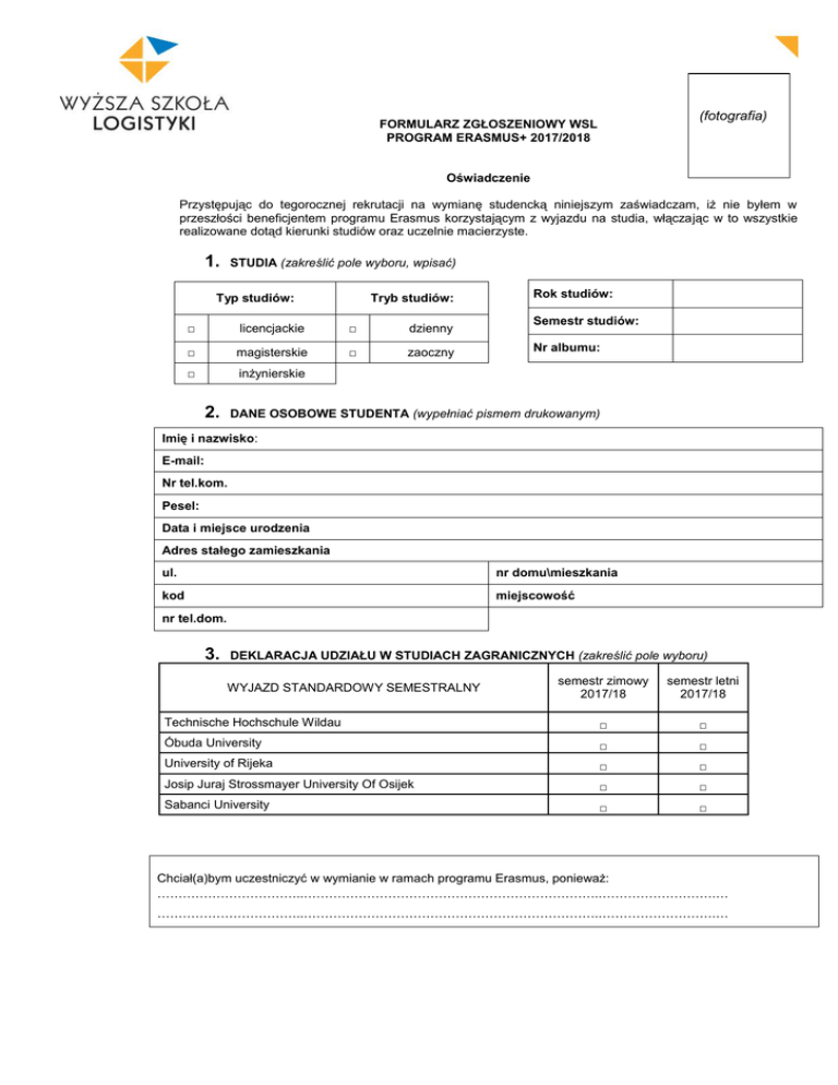 (fotografia) FORMULARZ ZGŁOSZENIOWY WSL PROGRAM ERASMUS+ 2017/2018 Oświadczenie Przystępując do tegorocznej rekrutacji na wymianę studencką niniejszym zaświadczam, iż nie byłem w przeszłości beneficjentem programu Erasmus korzystającym z wyjazdu na studia, włączając w to wszystkie realizowane dotąd kierunki studiów oraz uczelnie macierzyste. 1. STUDIA (zakreślić pole wyboru, wpisać) Typ studiów: Tryb studiów: □ licencjackie □ dzienny □ magisterskie □ zaoczny □ inżynierskie 2. Rok studiów: Semestr studiów: Nr albumu: DANE OSOBOWE STUDENTA (wypełniać pismem drukowanym) Imię i nazwisko: E-mail: Nr tel.kom. Pesel: Data i miejsce urodzenia Adres stałego zamieszkania ul. nr domu\mieszkania kod miejscowość nr tel.dom. 3. DEKLARACJA UDZIAŁU W STUDIACH ZAGRANICZNYCH (zakreślić pole wyboru) semestr zimowy 2017/18 semestr letni 2017/18 Technische Hochschule Wildau □ □ Óbuda University □ □ University of Rijeka □ □ Josip Juraj Strossmayer University Of Osijek □ □ Sabanci University □ □ WYJAZD STANDARDOWY SEMESTRALNY Chciał(a)bym uczestniczyć w wymianie w ramach programu Erasmus, ponieważ: ……………………………..…………………………………………………………….……………………….… ……………………………..…………………………………………………………….……………………….… 4. ZNAJOMOŚĆ JĘZYKÓW OBCYCH Języki obce Aktualnie studiuję ten język Mam wystarczającą znajomość języka by nadążać za wykładami Miał(a)bym wystarczającą znajomość języka by nadążać za wykładami gdybym otrzymał(a) dodatkowe przygotowanie tak nie tak nie tak nie ANGIELSKI NIEMIECKI 5. CERTYFIKATY (proszę wymienić posiadane certyfikaty językowe/ukończone kursy językowe) ……………………………..…………………………………………………………….……………………… 6. DOTYCHCZASOWY PRZEBIEG STUDIÓW – WYPEŁNIA DZIEKANAT Student(ka) zaliczył(a) ..................... semestr w roku akademickim………………………………. Semestr I Semestr II Semestr III Semestr IV Średnia łącznie Oceny z języka Średnia ocen Data………………… Podpis pracownika Dziekanatu..................................... Pieczęć 7. DOTYCHCZASOWE DOŚWIADCZENIA Czy odbywałeś już naukę za granicą?........................................................................................................ Jeśli tak, podaj nazwę instytucji przyjmującej, kraj, czas realizacji nauk ..……………………………...…........................................................................................................... 8. AKTYWNOŚĆ STUDENTA (koła naukowe, samorząd studencki, osiągnięcia sportowe, inne) 1. 2. 3. 4. Poznań, dnia ............................. 61-755 POZNAŃ, UL. E. ESTKOWSKIEGO 6 NIP 778-13-89-372 Regon 300124247 Bank Zachodni WBK S.A. nr 82 1090 1362 0000 0000 3603 4303 Rektorat tel. 61 850 47 81 Dziekanat tel. 61 850 47 64 Księgowość tel. 61 850 47 79 Kadry tel. 61 850 47 71 fax 61 850 47 89 [email protected] www.wsl.com.pl Podpis studenta ......................................