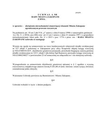 projekt U C H W A Ł A NR RADY MIASTA ZAKOPANE Z DNIA w sprawie : obciążenia nieruchomości stanowiącej własność Miasta Zakopane ograniczonym prawem rzeczowym Na podstawie art. 18 ust 2 pkt 9 lit „a” ustawy z dnia 8 marca 1990r o samorządzie gminnym (t.j. Dz. U. z 2016r, poz.446) oraz art.13 ust.1 ustawy z dnia 21 sierpnia 1997 r o gospodarce nieruchomościami /tekst jedn. Dz. U z 2015 r poz. 1774 z pózn. zm. / RADA MIASTA ZAKOPANE uchwala co następuje §1 Wyraża się zgodę na ustanowienie na rzecz każdoczesnych właścicieli działki ewidencyjnej nr 527 obręb 5 położonej w Zakopanem przy ulicy Krupówki objętej księgą wieczystą nr NS1Z/00010134/9 , służebności gruntowej przejazdu, przechodu biegnącej częścią gminnej działki ewidencyjnej nr 525/1 obręb 5 dla której Sąd Rejonowy prowadzi księgę wieczystą nr NS1Z/00023802/7 o powierzchni 23 m2oznaczonej na załączniku nr 1 do niniejszej uchwały. §2 Wynagrodzenie za ustanowienie służebności gruntowej opisanej w § 1 zgodnie z wyceną rzeczoznawcy majątkowego stanowi kwotę 8 281,00 zł netto /słownie: osiem tysięcy dwieście osiemdziesiąt jeden złotych). §3 Wykonanie Uchwały powierza się Burmistrzowi Miasta Zakopane . §4 Uchwała wchodzi w życie z dniem podjęcia . UZASADNIENIE do uchwały w sprawie: obciążenia nieruchomości stanowiącej własność Miasta Zakopane ograniczonym prawem rzeczowym . Zgodnie z art. 13 ust 1 ustawy o gospodarce nieruchomościami nieruchomości gminne mogą być obciążane ograniczonymi prawami rzeczowymi między innymi prawem służebności gruntowej. Część nieruchomości, która jest obciążana służebnością gruntową leży poza pasem drogowym ulicy Krupówki. Ze względu na zmianę zagospodarowania nieruchomości dojazd do działka ewidencyjnej nr 527 obr. 5 odbywa się przez działkę stanowiącą własność Gminy Miasto Zakopane. W związku z czym właściciele nieruchomości złożyli wniosek do Burmistrza Miasta Zakopane o ustanowienie służebności gruntowej, która zapewni dostęp do drogi publicznej oraz ureguluje stan prawny na gruncie.