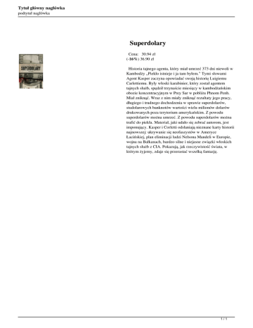 Tytuł główny nagłówka podtytuł nagłówka Superdolary Cena: 30.94 zł (-16%) 36.90 zł Historia tajnego agenta, który miał umrzeć 373 dni niewoli w Kambodży „Piekło istnieje i ja tam byłem.” Tymi słowami Agent Kasper zaczyna opowiadać swoją historię Luigiemu Carlettiemu. Były włoski karabinier, który został agentem tajnych służb, spędził trzynaście miesięcy w kambodżańskim obozie koncentracyjnym w Prey Sar w pobliżu Phnom Penh. Miał zniknąć. Wraz z nim miały zniknąć rezultaty jego pracy, długiego i trudnego dochodzenia w sprawie superdolarów, studolarowych banknotów wartości wielu milionów dolarów drukowanych poza terytorium amerykańskim. Z powodu superdolarów można umrzeć. Z powodu superdolarów można trafić do piekła. Materiał, jaki udało się zebrać autorom, jest imponujący. Kasper i Corletti odsłaniają nieznane karty historii najnowszej: ukrywanie się neofaszystów w Ameryce Łacińskiej, plan eliminacji ludzi Nelsona Mandeli w Europie, wojna na Bałkanach, bardzo silne i niejasne związki włoskich tajnych służb z CIA. Pokazują, jak rzeczywistość świata, w którym żyjemy, zdaje się przerastać wszelką fantazję. 1/1 Powered by TCPDF (www.tcpdf.org)