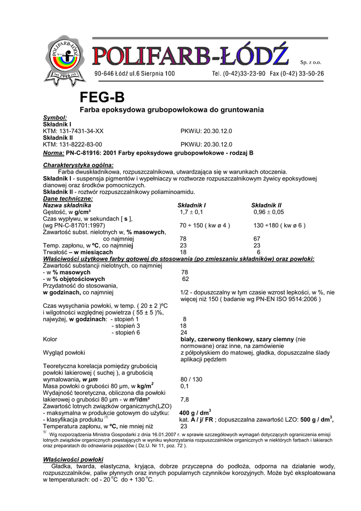 FEG-B Farba epoksydowa grubopowłokowa do gruntowania Symbol: Składnik I KTM: 131-7431-34-XX PKWiU: 20.30.12.0 Składnik II KTM: 131-8222-83-00 PKWiU: 20.30.12.0 Norma: PN-C-81916: 2001 Farby epoksydowe grubopowłokowe - rodzaj B Charakterystyka ogólna: Farba dwuskładnikowa, rozpuszczalnikowa, utwardzająca się w warunkach otoczenia. Składnik I - suspensja pigmentów i wypełniaczy w roztworze rozpuszczalnikowym żywicy epoksydowej dianowej oraz środków pomocniczych. Składnik II - roztwór rozpuszczalnikowy poliaminoamidu. Dane techniczne: Nazwa składnika Składnik I Składnik II Gęstość, w g/cm³ 1,7 ± 0,1 0,96 ± 0,05 Czas wypływu, w sekundach [ s ], (wg PN-C-81701:1997) 70 ÷ 150 ( kw ø 4 ) 130 ÷180 ( kw ø 6 ) Zawartość subst. nielotnych w, % masowych, co najmniej 78 67 Temp. zapłonu, w ºC, co najmniej 23 23 Trwałość – w miesiącach 18 6 Właściwości użytkowe farby gotowej do stosowania (po zmieszaniu składników) oraz powłoki: Zawartość substancji nielotnych, co najmniej - w % masowych 78 - w % objętościowych 62 Przydatność do stosowania, w godzinach, co najmniej 1/2 - dopuszczalny w tym czasie wzrost lepkości, w %, nie więcej niż 150 ( badanie wg PN-EN ISO 9514:2006 ) Czas wysychania powłoki, w temp. ( 20 ± 2 )ºC i wilgotności względnej powietrza ( 55 ± 5 )%, najwyżej, w godzinach: - stopień 1 8 - stopień 3 18 - stopień 6 24 Kolor biały, czerwony tlenkowy, szary ciemny (nie normowane) oraz inne, na zamówienie Wygląd powłoki z półpołyskiem do matowej, gładka, dopuszczalne ślady aplikacji pędzlem Teoretyczna korelacja pomiędzy grubością powłoki lakierowej ( suchej ), a grubością wymalowania, w µm 80 / 130 2 Masa powłoki o grubości 80 µm, w kg/m 0,1 Wydajność teoretyczna, obliczona dla powłoki lakierowej o grubości 80 µm - w m²/dm³ 7,8 Zawartość lotnych związków organicznych(LZO) 3 - maksymalna w produkcie gotowym do użytku: 400 g / dm /1 3 - klasyfikacja produktu kat. A / j/ FR ; dopuszczalna zawartość LZO: 500 g / dm , Temperatura zapłonu, w ºC, nie mniej niż 23 1/ Wg rozporządzenia Ministra Gospodarki z dnia 16.01.2007 r. w sprawie szczegółowych wymagań dotyczących ograniczenia emisji lotnych związków organicznych powstających w wyniku wykorzystania rozpuszczalników organicznych w niektórych farbach i lakierach oraz preparatach do odnawiania pojazdów ( Dz.U. Nr 11, poz. 72 ). Właściwości powłoki Gładka, twarda, elastyczna, kryjąca, dobrze przyczepna do podłoża, odporna na działanie wody, rozpuszczalników, paliw płynnych oraz innych popularnych czynników korozyjnych. Może być eksploatowana o o w temperaturach: od - 20 C do + 130 C. Przeznaczenie Do wykonywania grubopowłokowych zabezpieczeń antykorozyjnych konstrukcji stalowych - w tym ocynkowanych oraz podłoży betonowych i tynków; grubość pojedynczej warstwy wymalowania - do 250 µm. Środowisko Powłoki FEG-B mogą być eksploatowane w środowisku przemysłowym, nadmorskim, miejskim i wiejskim, na zewnątrz i wewnątrz pomieszczeń, w atmosferze suchej i wilgotnej (wg PN-EN ISO 129442:2001 - kategoria korozyjności: C2 ÷ C5-M ). Przygotowanie podłoża do malowania Podłoże stalowe 1 Malowanie pierwsze – powierzchnię oczyścić do Sa 2 /2 wg PN-ISO 8501-1:1996. 1 Malowanie renowacyjne - powierzchnię oczyścić do PSa 2 /2, dopuszczalny PSt 2, wg PN-ISO 8501-2:1998 (stan podłoża: nieusunięta silnie przylegająca powłoka lakierowa, usunięta zgorzelina walcownicza, rdza, słabo przyczepne powłoki lakierowe i obce zanieczyszczenia ). Oczyszczone podłoże pomalować w czasie do 6 godzin - zapobiegnie to wystąpieniu rdzy nalotowej. Podłoże betonowe i tynki Nowe podłoże sezonować, co najmniej, 21 dni – licząc od daty wykonania. Wymagane właściwości podłoża do malowania: - zakończone procesy utwardzania i karbonizacji; - wilgotność powierzchniowej warstwy – poniżej 4 %; - mocne i gładkie – bez rys, występów i szczelin; - suche i czyste – odtłuszczone i oczyszczone dokładnie z wszelkich zanieczyszczeń oraz słabo związanego materiału konstrukcyjnego, w szczególności mleczka cementowego (wapiennego); - stabilne - nie powinno pylić i ścierać się po potarciu dłonią. Przygotowanie farby Farba dostarczana jest w kompletach, na które składają się: opakowanie ze składnikiem I oraz opakowanie(-a) ze składnikiem II. Opakowania ze składnikiem I napełniane są do pojemności umożliwiającej dodanie potrzebnej ilości składnika II. Zawartości opakowań w kompletach odpowiada podanemu w poniższej tabeli składowi farby gotowej do stosowania. Nazwa Skład objętościowy Skład masowy składnika ( w częściach objętościowych ) ( w częściach wagowych ) Składnik I 1,00 1,00 Składnik II ( utwardzacz ) 0,25 0,135 Razem: 1,25 1,135 Składnik I farby wymieszać. Do składnika I dodać potrzebną ilość składnika II ( utwardzacza ) i całość starannie zmieszać. W razie potrzeby rozcieńczyć. Odczekać 15 minut – po tym czasie farba jest gotowa do stosowania. Stosowanie farby Stosować 1÷2 warstw dla powłok gruntowych, 2÷3 warstw dla pokryć samodzielnych. Czas praktycznej przydatności farby do aplikacji w temperaturze 20ºC wynosi co najmniej 8 godzin, w temperaturach wyższych czas ten ulega skróceniu. Podłoża betonowe i tynki gruntować farbą rozcieńczoną do około 40 sek. ( PN-C-81701: 1997 – kubek pomiarowy o średnicy otworu wypływowego 4 mm); zapotrzebowanie na rozcieńczalnik - około 5% objętościowych farby gotowej. Malować pędzlem, wałkiem, natryskiem powietrznym lub hydrodynamicznym. Postępujący wzrost lepkości ( gęstnienie ) farby redukować poprzez sukcesywne rozcieńczanie. Kolejne warstwy farby nakładać w czasie od 6 godzin do 1 miesiąca. Świeżo wykonaną powłokę chronić przed roszeniem oraz opadami atmosferycznymi. Powłoka FEG-B uzyskuje pełne właściwości eksploatacyjne po 7 ÷ 14 dniach suszenia, w warunkach otoczenia