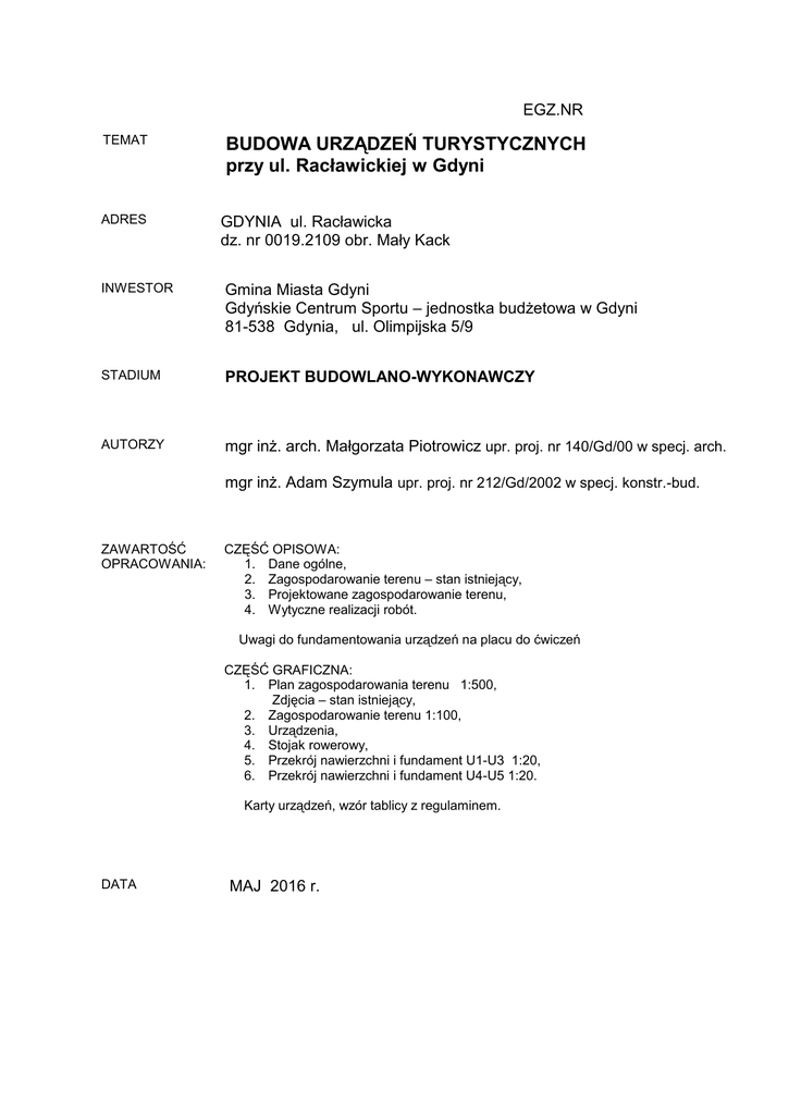 EGZ.NR TEMAT ADRES BUDOWA URZĄDZEŃ TURYSTYCZNYCH przy ul. Racławickiej w Gdyni GDYNIA ul. Racławicka dz. nr 0019.2109 obr. Mały Kack INWESTOR Gmina Miasta Gdyni Gdyńskie Centrum Sportu – jednostka budżetowa w Gdyni 81-538 Gdynia, ul. Olimpijska 5/9 STADIUM PROJEKT BUDOWLANO-WYKONAWCZY AUTORZY mgr inż. arch. Małgorzata Piotrowicz upr. proj. nr 140/Gd/00 w specj. arch. mgr inż. Adam Szymula upr. proj. nr 212/Gd/2002 w specj. konstr.-bud. ZAWARTOŚĆ OPRACOWANIA: CZĘŚĆ OPISOWA: 1. Dane ogólne, 2. Zagospodarowanie terenu – stan istniejący, 3. Projektowane zagospodarowanie terenu, 4. Wytyczne realizacji robót. Uwagi do fundamentowania urządzeń na placu do ćwiczeń CZĘŚĆ GRAFICZNA: 1. Plan zagospodarowania terenu 1:500, Zdjęcia – stan istniejący, 2. Zagospodarowanie terenu 1:100, 3. Urządzenia, 4. Stojak rowerowy, 5. Przekrój nawierzchni i fundament U1-U3 1:20, 6. Przekrój nawierzchni i fundament U4-U5 1:20. Karty urządzeń, wzór tablicy z regulaminem. DATA MAJ 2016 r. 1. DANE OGÓLNE. 1.1. Inwestor: Gmina Miasta Gdyni – Gdyńskie Centrum Sportu – jednostka budżetowa w Gdyni 81-538 Gdynia, ul. Olimpijska 5/9 1.2. Autorzy. mgr inż. arch. Małgorzata Piotrowicz – upr. bud. do proj. b.o. w specj. arch. nr 140/Gd/00 mgr inż. Adam Szymula - upr. proj. do proj. b.o. nr 212/Gd/2002 w specj. konstr.-bud. 1.3. Podstawa opracowania - umowa z zamawiającym nr 193/JB/2016 z dnia 20.04.2016r., - mapa do celów informacyjnych w skali 1:500, - inwentaryzacja w terenie, - uzgodnienia robocze z inicjatorem i inwestorem, - „Standardy dostępności dla Miasta Gdyni” określające zasady projektowania uniwersalnego w przestrzeni publicznej. 1.4. Zakres i cel opracowania Projekt obejmuje lokalizację pięciu nowych urządzeń na terenie istniejącego placu zabaw wraz z niezbędnymi nawierzchniami i elementami towarzyszącymi. Opracowywany projekt budowlano-wykonawczy Budowy urządzeń turystycznych przy ul.Racławickiej w Gdyni, zawiera opisy i rysunki, na podstawie których, możliwe jest przeprowadzenie postępowania w celu wyłonienia dostawców i wykonawców robót budowlanych oraz przeprowadzenie robót zgodnie z obowiązującymi normami i przepisami. 2. ZAGOSPODAROWANIE TERENU – STAN ISTNIEJĄCY. 2.1. LOKALIZACJA Opracowywany teren znajduje się w Gdyni, w dzielnicy Mały Kack, przy ulicy Racławickiej, na części działki nr 0019.2109, na terenie lasów gminnych. Przeznaczony na urządzenia teren od zachodu graniczy z działką drogową ul.Racławickiej, od północy z użytkowanym, ogrodzonym fragmentem tej samej działki, od wschodu z lasem, od południa z niezalesionym fragmentem działki. Teren dostępny jest od ul. Racławickiej z chodnika wykonanego z kostki betonowej. 2.2. UKSZTAŁTOWANIE TERENU Zagospodarowywany teren znajduje się poniżej przylegającego chodnika biegnącego wzdłuż ul.Racławickiej, następnie wznosi się w kierunku lasu, w kierunku wschodnim. 2.3. ISTNIEJĄCE ELEMENTY PRZESTRZENNE I ZIELEŃ. Przedmiotowy fragment działki jest niezagospodarowany. Wzdłuż ulicy Racławickiej na całej długości przedmiotowego terenu ciągnie się szpaler świerków. Przy granicy południowej teren ograniczony jest kilkoma drzewami liściastymi i dwoma świerkami. Przeznaczony pod urządzenia fragment pokryty jest trawą. 2.4. ISTNIEJĄCE ELEMENTY UZBROJENIA Przez teren przebiega rura z wodą wA600. Na mapie zaznaczona jest napowietrzna linia elektryczna – linia nie istnieje. „BUDOWA URZĄDZEŃ TURYSTYCZNYCH” przy ul. Racławickiej dz.nr 0019.2109 obręb Mały Kack PROJEKT BUDOWLANO-WYKONAWCZY 2 3. PROJEKTOWANE ZAGOSPODAROWANIE TERENU 3.1. DANE LICZBOWE Powierzchnia terenu zagospodarowywanego Powierzchnia dojścia z pospółki Powierzchnia nawierzchni z pospółki Powierzchnia nawierzchni żwirowej Powierzchnia nawierzchni trawiastej P Pdp Pnp Pżw Ptr = 310,0 m2 = 5,2 m2 = 15,6 m2 = 43,6 m2 = 245,6 m2 3.2. OGÓLNE ZAŁOŻENIA PROJEKTOWE Projektowane urządzenia turystyczne zostały zlokalizowane na niezagospodarowanym terenie lasów gminnych przy ul. Racławickiej. Wejście umieszczono w południowozachodnim narożniku, pomiędzy istniejącymi drzewami. Na terenie zlokalizowano trzy urządzenia ruchome do ćwiczeń wzdłuż zieleni przy południowej granicy. Pod urządzeniami zastosowano podłoże z pospółki. Po stronie wschodniej umieszczono dwa urządzenia sprawnościowe na nawierzchni żwirowej. Przy krańcu północnym zaprojektowano stół pingpongowy. Wzdłuż szpaleru świerków oddzielających teren od ul.Racławickiej znalazł się stół do gry w szachy i pozostałe elementy przestrzenne. Większość placu pokryta jest nawierzchnią trawiastą. 3.3. KOLIZJA PROJEKTOWANEGO ZAGOSPODAROWANIA Z ISTNIEJĄCYMI ELEMENTAMI UZBROJENIA TERENU Fundamenty zastosowanych urządzeń zostaną zlokalizowane poza przebiegiem istniejącej rury z wodą, w odległości powyżej 50cm. Biorąc pod uwagę sposób wykonania i głębokość fundamentowania nie zachodzi kolizja posadowienia projektowanych urządzeń z istniejącymi elementami uzbrojenia. Montowane obiekty są lekkie, z możliwością szybkiego demontażu. Punktowe posadowienie o wymiarach 60x60cm, 30x30cm i na głębokości około 100cm poniżej powierzchni gruntu, wykonuje się ręcznie bez użycia ciężkich lub wibrujących maszyn i narzędzi – tak by na etapie budowy i eksploatacji urządzeń nie było zagrożenia uszkodzenia sieci. 3.4. ZASTOSOWANE URZĄDZENIA i ELEMENTY MAŁEJ ARCHITEKTURY Na terenie zlokalizowano: - trzy urządzenia ruchome do ćwiczeń, dwa pojedyncze na słupku (U1, U3), jedno podwójne na pylonie (U2) U1. Wioślarz na słupku Wymiary urządzenia – 110 x 84 cm Wymiary strefy bezpieczeństwa – 410 x 384 cm U2. Wyciąg górny + narty biegowe na pylonie Wymiary urządzenia – 270 x 74 cm Wymiary strefy bezpieczeństwa – 570 x 374 cm U3. Orbitrek Wymiary urządzenia – 146 x 58 cm „BUDOWA URZĄDZEŃ TURYSTYCZNYCH” przy ul. Racławickiej dz.nr 0019.2