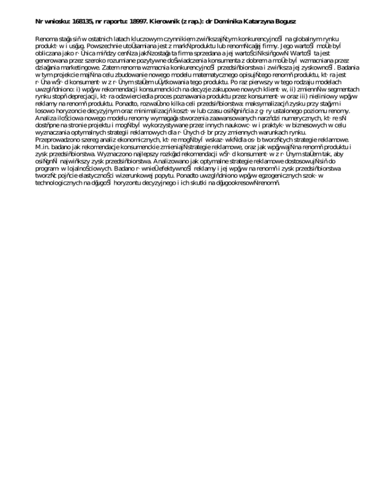Nr wniosku: 168135, nr raportu: 18997. Kierownik (z rap.): dr