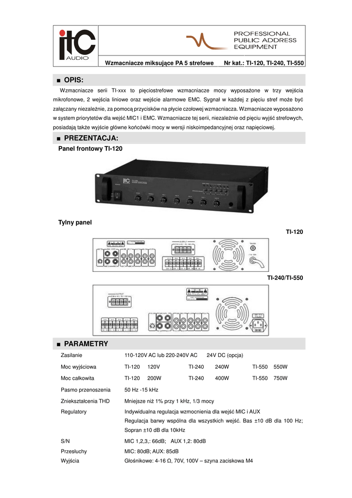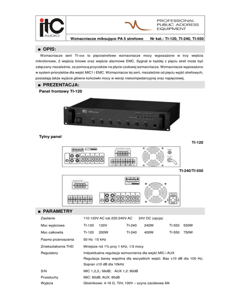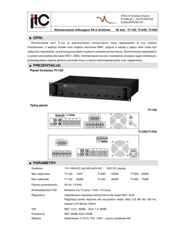 Wzmacniacze miksujące PA 5 strefowe Nr kat.: TI-120, TI-240, TI-550 ■ OPIS: Wzmacniacze serii TI-xxx to pięciostrefowe wzmacniacze mocy wyposażone w trzy wejścia mikrofonowe, 2 wejścia liniowe oraz wejście alarmowe EMC. Sygnał w każdej z pięciu stref może być załączany niezależnie, za pomocą przycisków na płycie czołowej wzmacniacza. Wzmacniacze wyposażono w system priorytetów dla wejść MIC1 i EMC. Wzmacniacze tej serii, niezależnie od pięciu wyjść strefowych, posiadają także wyjście główne końcówki mocy w wersji niskoimpedancyjnej oraz napięciowej. ■ PREZENTACJA: Panel frontowy TI-120 Tylny panel TI-120 TI-240/TI-550 ■ PARAMETRY Zasilanie 110-120V AC lub 220-240V AC 24V DC (opcja) Moc wyjściowa TI-120 120V TI-240 240W TI-550 550W Moc całkowita TI-120 200W TI-240 400W TI-550 750W Pasmo przenoszenia 50 Hz -15 kHz Zniekształcenia THD Mniejsze niż 1% przy 1 kHz, 1/3 mocy Regulatory Indywidualna regulacja wzmocnienia dla wejść MIC i AUX Regulacja barwy wspólna dla wszystkich wejść. Bas ±10 dB dla 100 Hz; Sopran ±10 dB dla 10kHz S/N MIC 1,2,3,: 66dB; AUX 1,2: 80dB Przesłuchy MIC: 80dB; AUX: 85dB Wyjścia Głośnikowe: 4-16 Ω, 70V, 100V – szyna zaciskowa M4 Wzmacniacze miksujące PA 5 strefowe Wejścia Nr kat.: TI-120, TI-240, TI-550 MIC (1,2,3,4): 5mV-200mV/600 Ω, symetryczne Aux (1,2): 250mV/47 kΩ, niesymetryczne Zasilanie Phantom MIC (1,2,3,4) 9V DC (opcja) Wybór napięcia (bez obciążenia): +6V, +12V, +24V, +48V Sygnalizacja Sieć (LED), poziom wyjściowy (LED), zabezpieczenie Zabezpieczenia Bezpiecznik AC, zwarcie wyjścia, temperatura Wykonanie Panel frontowy: aluminium kolor czarny lub złoty (opcja) Obudowa: stal kolor czarny Masa (kg) TI-120 13 Wymiary (mm) TI-120 484 * 435 *88 TI-240 (19”/2U) TI-240/TI-550 484 * 435 *132 ■ APLIKACJE Wzmacniacz miksuj¹ cy T-6203 Generator EMC 1 IN MIC2 CD/MP3/AM/FM MIC3 15 (19”/3U) TI-550 24,5