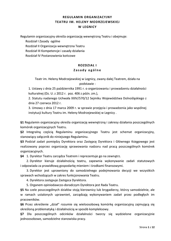 REGULAMIN ORGANIZACYJNY TEATRU IM. HELENY MODRZEJEWSKIEJ W LEGNICY Regulamin organizacyjny określa organizację wewnętrzną Teatru i obejmuje: Rozdział I Zasady ogólne Rozdział II Organizacja wewnętrzna Teatru Rozdział III Kompetencje i zasady działania Rozdział IV Postanowienia końcowe ROZDZIAŁ I Zasady ogólne Teatr im. Heleny Modrzejewskiej w Legnicy, zwany dalej Teatrem, działa na podstawie : 1. Ustawy z dnia 25 października 1991 r. o organizowaniu i prowadzeniu działalności kulturalnej (Dz. U. z 2012 r. poz. 406 z późn. zm.), 2. Statutu nadanego Uchwała XXIV/570/12 Sejmiku Województwa Dolnośląskiego z dnia 27 czerwca 2012 r. 3. Umowy z dnia 17 marca 2009 r. w sprawie przejęcia i prowadzenia jako wspólnej instytucji kultury Teatru im. Heleny Modrzejewskiej w Legnicy . §1 Regulamin organizacyjny określa organizację wewnętrzną i zakresy działania poszczególnych komórek organizacyjnych Teatru. §2 Integralną częścią Regulaminu organizacyjnego Teatru jest schemat organizacyjny, stanowiący załącznik do niniejszego Regulaminu. §3 Podział zadań pomiędzy Dyrektora oraz Zastępcę Dyrektora i Głównego Księgowego jest realizowany poprzez organizację sprawowania nadzoru nad pracą poszczególnych komórek organizacyjnych. §4 1. Dyrektor Teatru zarządza Teatrem i reprezentuje go na zewnątrz. 2. Dyrektor kieruje działalnością teatru, zapewnia wykonywanie zadań statutowych i odpowiada za prawidłową gospodarkę mieniem i środkami finansowymi. 3. Dyrektor jest uprawniony do samodzielnego podejmowania decyzji we wszystkich sprawach wchodzących w zakres funkcjonowania Teatru. 4. Dyrektora zastępuje Zastępca Dyrektora. 5. Organem opiniodawczo-doradczym Dyrektora jest Rada Teatru. §5 Na czele poszczególnych działów stoją kierownicy lub brygadierzy, którzy samodzielnie, ale w ramach ustalonych uprawnień, zarządzają wykonywaniem zadań przez podległych im pracowników. §6 Przez określenie „dział” rozumie się wieloosobową komórkę organizacyjną zajmującą się określoną problematyką i działalnością w sposób kompleksowy. §7 Dla poszczególnych odcinków działalności tworzy się wydzielone organizacyjnie jednoosobowe, samodzielne stanowiska pracy. Strona 1 z 12 §8 Kierownik działu, brygadier, pracownik na samodzielnym stanowisku pracy jest bezpośrednio odpowiedzialny przed przełożonym wyższego szczebla za całokształt powierzonych mu zadań oraz wyniki pracy podległych pracowników. §9 1. Każdy kierownik i brygadier - oprócz szczegółowych uprawnień wynikających ze specyfiki zadań odpowiednich dla kierowanego przezeń działu - posiada następujące uprawnienia: a) żądania od swego przełożonego określenia planowanych zadań dla kierowanego działu w terminach zapewniających możliwość ich organizacji, i wykonania, b) żądania, aby wszelkie zarządzenia przełożonego dotyczące kierowanego przez niego działu były mu przekazane, c) zgłaszania potrzeb działu, którym kieruje, d) wydawania podległym pracownikom poleceń wynikających z toku pracy działu, e) przedkładania swojemu przełożonemu: wniosków odnośnie wyróżniania i karania, wniosków dotyczących przyznawania premii, nagród. §10 1. Każdy kierownik, brygadier i pracownik na samodzielnym stanowisku pracy zobowiązany jest do: a) znajomości schematu organizacyjnego Teatru oraz ogólnych zakresów ich zadań, b) znajomości i przestrzegania przepisów, instrukcji i zarządzeń dotyczących ich pracy i swojego działu, c) opracowywania planu pracy oraz harmonogramów wykonywanych prac i czynności, d) zapewnienia utrzymania w stanie aktualnym zakresów czynności w celu zapewnienia prawidłowej organizacji pracy, e) dokonywania podziału zadań między podległych pracowników oraz instruowania, nadzorowania, i kontrolowania ich pracy, f) kontroli dyscypliny i wykorzystania czasu pracy, g) zabezpieczenia właściwych warunków pod względem BHP i P.POŻ., h) zgłaszania przełożonemu w przypadków wykroczeń ze strony podległych pracowników nie wykonujących swoich obowiązków lub nie przestrzegających stosownych regulaminów. §11 1. Każdy kierownik, brygadier i pracownik na samodzielnym stanowisku jest odpowiedzialny za: a) wykonywanie zadań wynikających z zajmowanego stanowiska, b) wyniki pracy, c) powierzony majątek, a w szczególności zabezpieczenie powierzonego mienia przed kradzieżą, zniszczeniem i pożarem, d) umiejętne wykorzystanie potencjału kadrowego. §12 1. Każdy kierownik, brygadier i pracownik na samodzielnym stanowisku ponosi odpowiedzialność wynikającą z obowiązujących przepisów. Brakiem odpowiedzialności jest: a) niewykonanie obowiązku służbowego i naruszenie obowiązujących przepisów, b) wina umyślna (wynikająca z zamiaru niewykonania obowiązku lub naruszania przepisu), c) wina nieumyślna (wynikająca z lekkomyślności lub niedbalstwa). §13 1. Dla zapewnienia pełnej i prawidłowej realizacji zadań działu lub stanowiska pracy konieczna jest współpraca między poszczególnymi działami lub stanowiskami. Współpraca w tym zakresie polega na: Strona 2 z 12 a) udzielaniu względnie otrzymywaniu informacji i materiałów źródłowych, b) uzgadnianiu całokształtu spraw związanych z realizacja zadania, c) udzielaniu względnie otrzymywaniu instruktażu. §14 Wszystkie działy organizacyjne obowiązuje zasada wzajemnego współdziałania i koordynacji pracy. Pracownicy poszczególnych działów nie posiadają uprawnień do wydawania poleceń pracownikom innych działów. §15 1. Aby zapewnić sprawną realizację zadań, które ze względu na ich znaczenie muszą być wykonywane w sposób jednolity. Dyrektor wydaje akty takie jak: a) zarządzenie, b) komunikat, c) postanowienie (decyzja), d) polecenie służbowe, e) pisma wg rozdzielnika. §16 Dla zwiększenia odpowiedzialności pracowników za wykonaną pracę oraz w celu zapobiegania powstawaniu sporów kompetencyjnych i 