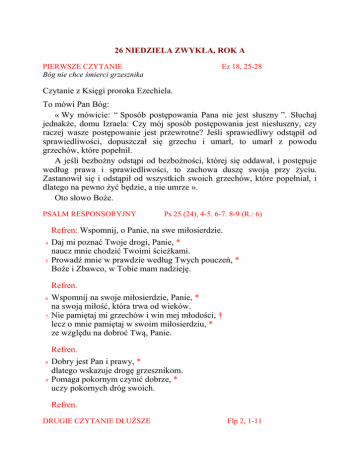 26 NIEDZIELA ZWYKŁA, ROK A PIERWSZE CZYTANIE Bóg nie chce śmierci grzesznika Ez 18, 25-28 Czytanie z Księgi proroka Ezechiela. To mówi Pan Bóg: « Wy mówicie: “ Sposób postępowania Pana nie jest słuszny ”. Słuchaj jednakże, domu Izraela: Czy mój sposób postępowania jest niesłuszny, czy raczej wasze postępowanie jest przewrotne? Jeśli sprawiedliwy odstąpił od sprawiedliwości, dopuszczał się grzechu i umarł, to umarł z powodu grzechów, które popełnił. A jeśli bezbożny odstąpi od bezbożności, której się oddawał, i postępuje według prawa i sprawiedliwości, to zachowa duszę swoją przy życiu. Zastanowił się i odstąpił od wszystkich swoich grzechów, które popełniał, i dlatego na pewno żyć będzie, a nie umrze ». Oto słowo Boże. PSALM RESPONSORYJNY 4 5 6 7 8 9 Ps 25 (24), 4-5. 6-7. 8-9 (R.: 6) Refren: Wspomnij, o Panie, na swe miłosierdzie. Daj mi poznać Twoje drogi, Panie, * naucz mnie chodzić Twoimi ścieżkami. Prowadź mnie w prawdzie według Twych pouczeń, * Boże i Zbawco, w Tobie mam nadzieję. Refren. Wspomnij na swoje miłosierdzie, Panie, * na swoją miłość, która trwa od wieków. Nie pamiętaj mi grzechów i win mej młodości, † lecz o mnie pamiętaj w swoim miłosierdziu, * ze względu na dobroć Twą, Panie. Refren. Dobry jest Pan i prawy, * dlatego wskazuje drogę grzesznikom. Pomaga pokornym czynić dobrze, * uczy pokornych dróg swoich. Refren. DRUGIE CZYTANIE DŁUŻSZE Flp 2, 1-11 KRÓTSZE Jezus Chrystus wzorem pokory Flp 2, 1-5 Czytanie z Listu świętego Pawła Apostoła do Filipian. Bracia: Jeśli jest jakieś napomnienie w Chrystusie, jeśli jakaś moc przekonująca Miłości, jeśli jakiś udział w Duchu, jeśli jakieś serdeczne współczucie, dopełnijcie mojej radości przez to, że będziecie mieli te same dążenia: tę samą miłość i wspólnego ducha, pragnąc tylko jednego, a niczego nie pragnąc dla niewłaściwego współzawodnictwa ani dla próżnej chwały, lecz w pokorze oceniając jedni drugich za wyżej stojących od siebie. Niech każdy ma na oku nie tylko swoje własne sprawy, ale też i drugich. Niech was ożywia to dążenie, które było w Chrystusie Jezusie. Koniec krótszej perykopy. On, istniejąc w postaci Bożej, nie skorzystał ze sposobności, aby na równi być z Bogiem, lecz ogołocił samego siebie, przyjąwszy postać sługi, stawszy się podobnym do ludzi. A w tym co zewnętrzne, uznany za człowieka, uniżył samego siebie, stawszy się posłusznym aż do śmierci, i to śmierci krzyżowej. Dlatego też Bóg wywyższył Go nad wszystko i darował Mu imię ponad wszelkie imię, aby na imię Jezusa zgięło się każde kolano istot niebieskich i ziemskich, i podziemnych, i aby wszelki język wyznał, że Jezus Chrystus jest Panem, ku chwale Boga Ojca. Oto słowo Boże. ŚPIEW PRZED EWANGELIĄ Aklamacja: Alleluja, alleluja, alleluja. Moje owce słuchają mojego głosu, Ja znam je, a one idą za Mną. J 10, 27 Aklamacja: Alleluja, alleluja, alleluja. EWANGELIA Nawrócenie prowadzi do zbawienia Mt 21, 28-32 Słowa Ewangelii według świętego Mateusza. Jezus powiedział do arcykapłanów i starszych ludu: « Co myślicie? Pewien człowiek miał dwóch synów. Zwrócił się do pierwszego i rzekł: “ Dziecko, idź dzisiaj i pracuj w winnicy ”. Ten odpowiedział: “ Idę, Panie ”, lecz nie poszedł. Zwrócił się do drugiego i to samo powiedział. Ten odparł: “ Nie chcę ”. Później jednak opamiętał się i poszedł. Któryż z tych dwóch spełnił wolę ojca? ». Mówią Mu: « Ten drugi ». Wtedy Jezus rzekł do nich: « Zaprawdę powiadam wam: Celnicy i nierządnice wchodzą przed wami do królestwa niebieskiego. Przyszedł bowiem do was Jan drogą sprawiedliwości, a wyście mu nie uwierzyli. Celnicy zaś i nierządnice uwierzyli mu. Wy patrzyliście na to, ale nawet później nie opamiętaliście się, żeby mu uwierzyć ». Oto słowo Pańskie.