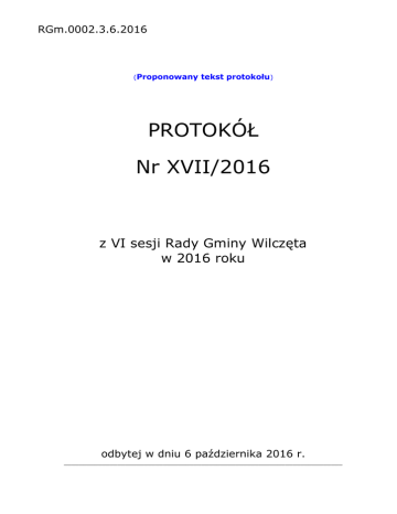 RGm.0002.3.6.2016 (Proponowany tekst protokołu) PROTOKÓŁ Nr XVII/2016 z VI sesji Rady Gminy Wilczęta w 2016 roku odbytej w dniu 6 października 2016 r. _________________________________________________________________________ PROTOKÓŁ Nr XVII/2016 z sesji Rady Gminy Wilczęta odbytej w dniu 6 października 2016 r. Ad. pkt. 1 – otwarcie obrad. Otwarcia sesji dokonała Przewodnicząca Rady Gminy Pani Krystyna Kaczyńska, która powitała radnych oraz zaproszonych gości: Panią Beatę Jarosz – Wójta Gminy, Panią Monikę Gońca – Skarbnika Gminy, Pana Tadeusza Wysockiego – Sekretarza Gminy, kierowników jednostek organizacyjnych Gminy, sołtysów sołectw oraz przybyłą na salę publiczność. Ad. pkt. 2. – stwierdzenie prawomocności obrad. Na podstawie listy obecności radnych Przewodnicząca Rady stwierdziła, że sesja jest prawomocna, ponieważ na 15 radnych w obradach uczestniczy 11 – lista obecności sta nowi załącznik Nr 1 do niniejszego protokołu. Ad. pkt. 3. – Zatwierdzenie porządku posiedzenia. Przewodnicząca Rady przedstawiła porządek sesji, który przyjęto jednogłośnie w głosowaniu jawnym (w głosowaniu udział wzięło 11 radnych) w brzmieniu jak niżej: 1. 2. 3. 4. 5. Otwarcie sesji i powitanie zebranych. Stwierdzenie prawomocności sesji. Rozpatrzenie wniosków w sprawie zmiany porządku obrad. Przyjęcie protokołu z poprzednich sesji. Dyskusja i podjęcie uchwał w sprawie: 5.1. zmiany w Wieloletniej Prognozie Finansowej Gminy Wilczęta na lata 2016-2025, 5.2. zmiany w budżecie gminy na 2016 r., 5.3. przyjęcia Strategii Rozwoju Gminy Wilczęta, 5.4. ustalenia stawek podatku od nieruchomości na 2017 rok, 5.5. ustalenia stawek podatku od środków transportowych na 2017 rok. 6. Interpelacje, wnioski i zapytania. 7. Zakończenie sesji. Ad. pkt. 4. – przyjęcie protokołu z poprzedniej sesji. Protokół z poprzedniej sesji: Nr XVI/2016 z dnia 13 września 2016 r. przyjęto jedno głośnie w głosowaniu jawnym (w głosowaniu udział wzięło 11 radnych), bez odczytywania. Ad. pkt. 5.1. – zmiany Wieloletniej Prognozy Finansowej Gminy Wilczęta na lata 20162025. Z treścią projektu uchwały w sprawie zmiany Wieloletniej Prognozy Finansowej Gminy Wilczęta na lata 2016-2025 zapoznała zebranych Pani Monika Gońca – Skarbnik Gminy. Projekt uchwały stanowi załącznik Nr 2 do niniejszego protokołu. Wnioski komisji rady do projektu tej uchwały przedstawili: Komisja Rewizyjna nie obradowała nad projektami uchwał – brak kworum. Radna Elżbieta Skubij Przewodnicząca Komisji Oświaty, Kultury ... – komisja opiniuje pozytywnie powyższy projekt uchwały. Radny Ryszard Adamczyk Przewodniczący Komisji Inicjatyw Gospodarczych i Rolnictwa – komisja opiniuje pozytywnie powyższy projekt uchwały. Proszę o zgłaszanie się do zadawania pytań. Czy ktoś z Pań i Panów radnych chciałby zgłosić zmiany do uchwały? Dyskusji i wniosków nie było. Z uwagi na brak głosów w dyskusji Przewodnicząca Rady odczytała i poddała pod głosowanie powyższy projekt uchwały, który przyjęto jednogłośnie w głosowaniu jawnym (w głosowaniu udział wzięło 11 radnych) jako uchwałę Nr XVII/110/16 stanowiącą załącznik Nr 3 do niniejszego protokołu. Ad. pkt. 5.2. – zmiany w budżecie gminy na 2016 r. Z treścią projektu uchwały w sprawie zmiany w budżecie gminy na 2016 r. zapoznała zebranych Pani Monika Gońca – Skarbnik Gminy. Projekt uchwały stanowi załącznik Nr 4 do niniejszego protokołu. Dyskusji i wniosków nie było. Wnioski komisji rady do projektu tej uchwały przedstawili: Radna Elżbieta Skubij Przewodnicząca Komisji Oświaty, Kultury ... – komisja opiniuje pozytywnie powyższy projekt uchwały. Radny Ryszard Adamczyk Przewodniczący Komisji Inicjatyw Gospodarczych i Rolnictwa – komisja opiniuje pozytywnie powyższy projekt uchwały. Przewodnicząca Rady odczytała i poddała pod głosowanie powyższy projekt uchwały, który przyjęto jednogłośnie w głosowaniu jawnym (w głosowaniu udział wzięło 11 radnych) jako uchwałę Nr XVII/111/16 stanowiącą załącznik Nr 5 do niniejszego protokołu. Ad. pkt. 5.3. – Strategia Rozwoju Gminy Wilczęta. Z treścią projektu uchwały w sprawie przyjęcia Strategii Rozwoju Gminy Wilczęta na lata 2016-2026 zapoznał zebranych Pan Tadeusz Wysocki – Sekretarz Gminy. Projekt uchwały stanowi załącznik Nr 6 do niniejszego protokołu. Pani Dagmara Bielawska – przedstawiciel firmy AD REM wykonawca projektu – Opracowanie tego dokumentu to jest właściwie wynik państwa pracy i polegało na spotkaniach zespołu. Strategia wyznacza kierunki pracy przez najbliższe 10 lat. To wszystko co się znajduje w dokumencie było opracowywane przez reprezentantów państwa Gminy. Strategia składa się z dwóch części: I część to jak wygląda to dzisiaj. Wzięto pod uwagę uwarunkowania geograficzne, środowisko naturalne to gdzie państwo jesteście. Wzięto pod uwagę również kapitał społeczny ale też i sferę gospodarczą. II część pokazuje państwu cele i kierunki którymi chcielibyście państwo podążać. Wskazane są też możliwości, które wiążą się z tą strategią – cele, działania i możliwości do pozyskania środków. Gratuluję przyjęcia takiego dokumentu, ponieważ dzięki niemu wiecie w jakim kierunku należy podążać. Wskazane jest też skąd pozyskiwać środki na realizację tych celów. Pan Andrzej Nowosielski – Mam pytanie. Co poza cmentarzem przez 10 lat będzie się rozwijało na terenie naszej Gminy? Co przewidujecie w sprawie oświaty? Wójt Gminy – Przygotowanie strategi polegało na cyklu kilku spotkań na które zapraszani byli sołtysi, mieszkańcy Gminy. Strategia jest dokumentem elastycznym i zmiany poprzez uchwałę są możliwe. Jest to decyzja w którą stronę mamy iść. Cele ujęte w tym dokumencie mają pozwolić Gminie na pozyskiwanie środków. Tam nie ma odpowiedzi na pana pytanie ile ma być szkół na ter