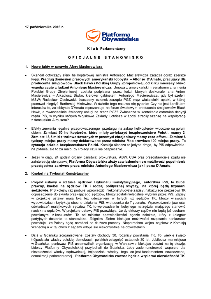 17 października 2016 r. K l u b Parlamentarny O F I C J A L N E S T A N O W I S K O 1. Nowe fakty w sprawie Afery Macierewicza Skandal dotyczący afery helikopterowej ministra Antoniego Macierewicza zatacza coraz szersze kręgi. Według doniesień prasowych amerykański lobbysta – Alfonse D’Amato, pracujący dla producenta śmigłowców Black Hawk i Polskiej Grupy Zbrojeniowej, od kilku miesięcy blisko współpracuje z ludźmi Antoniego Macierewicza. Umowa z amerykańskim senatorem z ramienia Polskiej Grupy Zbrojeniowej została podpisana przez ludzi, których doskonale zna Antoni Macierewicz – Arkadiusz Siwko, kierował gabinetem Antoniego Macierewicza, gdy był szefem MSW; Radosław Obolewski, ówczesny członek zarządu PGZ, mąż właścicielki apteki, w której pracował niegdyś Bartłomiej Misiewicz. W świetle tego nasuwa się pytanie: Czy nie jest konfliktem interesów to, że lobbysta D’Amato reprezentuje na forum światowym producenta śmigłowców Black Hawk, a równocześnie świadczy usługi na rzecz PGZ? Zwłaszcza w kontekście ostatnich decyzji rządu PiS, w wyniku których Wojskowe Zakłady Lotnicze w Łodzi straciły szansę na współprac ę z francuskim Airbusem? Efekty zerwania legalnie przeprowadzonego przetargu na zakup helikopterów widoczne są gołym okiem. Zamiast 50 helikopterów, które miały zwiększyć bezpieczeństwo Polski, mamy 2. Zamiast 13,5 mld zł zainwestowanych w przemysł zbrojeniowy mamy zero offsetu. Zamiast 6 tysięcy miejsc pracy mamy deklarowane przez ministra Macierewicza 100 miejsc pracy. Ta sytuacja osłabia bezpieczeństwo Polski. Komisja śledcza to jedyna droga, by PiS odpowiedział na pytania, ale to za mało, by Polacy czuli się bezpiecznie. Jeżeli w ciągu 24 godzin organy państwa: prokuratura, ABW, CBA oraz przedstawiciele rządu nie zainteresują się sprawą Platforma Obywatelska złoży zawiadomienie o możliwości popełnienia przestępstwa zarówno przez ministra Antoniego Macierewicza jak i pana D’Amato. 2. Knebel na Trybunał Konstytucyjny Projekt ustawy o statusie sędziów Trybunału Konstytucyjnego, autorstwa PiS, to bubel prawny, knebel na sędziów TK i rodzaj politycznej smyczy, na której będą trzymani sędziowie. PiS kolejny raz próbuje wprowadzić niekonstytucyjne zapisy, nakazujące prezesowi TK dopuszczenie do składu orzekającego sędziów, którzy zostali nielegalnie wybrani przez PiS. Zapisy w projekcie ustawy mają być też uderzeniem w byłych już sędziów TK, którzy w swoich wypowiedziach krytykują obecne działania PiS, w stosunku do Trybunału. Wprowadzenie jawności oświadczeń majątkowych sędziów TK, to wprowadzenie kolejnego narzędzia, mającego stanowić nacisk na sędziów. W projekcie ustawy PiS przewiduje, że dyrektorzy sądów nie będą już osobami powołanymi z konkursów. To od ministra sprawiedliwości będzie zależało, który z kolegów partyjnych dostanie to stanowisko. Zbigniew Ziobro blokując możliwości rozpisania konkursów powoduje, że Polacy będą narażeni na dłuższe procesy. Niepotrzebna wojna najpierw z Komisją Wenecką a w tej chwili z sądami odbije się niekorzystnie na obywatelach. Dziś w Gdańsku zorganizowane zostały obchody 30. rocznicy powstania TK. To wielkie święto trójpodziału władzy polskiej demokracji, polskich osiągnięć ostatnich 30 lat. Jubileusz ma miejsce w Gdańsku, ponieważ PiS uniemożliwił organizację w Warszawie blokując budżet na tę okazję. Liderzy Platformy Obywatelskiej przyjechali do Gdańska, żeby zademonstrować wsparcie dla niezależności władzy sądowniczej, trójpodziału władzy, tego, co jest fundamentem nowoczesnej demokracji parlamentarnej. Platforma Obywatelska zawsze będzie wspierać niezależność TK.