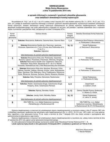 OBWIESZCZENIE Wójta Gminy Moszczenica z dnia 15 października 2014 roku w sprawie informacji o numerach i granicach obwodów głosowania oraz siedzibach obwodowych komisji wyborczych Na podstawie art. 16 § 1, art. 61 a § 1 i art. 61 b ustawy z dnia 5 stycznia 2011 roku Kodeks wyborczy (Dz. U. z 2014 r. Nr 21, poz. 112 z późn. zm.) podaję do wiadomości wyborców informację o numerach i granicach obwodów głosowania, wyznaczonych siedzibach obwodowych komisji wyborczych, lokalach obwodowych komisji wyborczych dostosowanych do potrzeb wyborców niepełnosprawnych, możliwości głosowania korespondencyjnego oraz przez pełnomocnika w wyborach do rad gmin, rad powiatów i sejmików województw oraz w wyborach wójtów, burmistrzów i prezydentów miast, zarządzonych na dzień 16 listopada 2014 r. Numer obwodu głosowania Granice obwodu Numery okręgów wyborczych Siedziba Obwodowej Komisji Wyborczej 1 Sołectwa: Moszczenica, Białkowice, Gazomia Nowa, Gazomia Stara 1, 4 Ochotnicza Straż Pożarna w Moszczenicy, ul. Piotrkowska 4, Moszczenica 2 Sołectwo Moszczenica Osiedle ulice: Dworcowa, Jaworowa, Wrzosowa, Spacerowa od nr 7 do nr 30 oraz ulica Piotrkowska od nr 11 do 21 c; Sołectwo: Gajkowice 10, 12 Szkoła Podstawowa, ul. Dworcowa 9, Moszczenica lokal dostosowany do potrzeb wyborców niepełnosprawnych 3 Sołectwo Moszczenica Wola ulice: Piotrkowska, Gazomska, Rzeczna, Łąkowa, Proszeńska, Południowa, Wiśniowa, Smugowa; Sołectwo Moszczenica Osiedle ulice: Cegielniana, Fabryczna, Hodowlana, Nowy Świat, Spacerowa od nr 1 do nr 6, Wesoła, Kosowska, Rzemieślnicza oraz z Woli Moszczenickiej ulica Kosowska 2, 11 Gimnazjum, ul. Piotrkowska 13, Moszczenica 4 Sołectwo Moszczenica Wola ulice: Akacjowa, Brzozowa, Cicha, Dębowa, Dworska, Jodłowa, Klonowa, Krzywa, Leśna, Modrzewiowa, Nowa, Ogrodowa, Plac Włókniarzy, Polna, Projektowana, Robotnicza, Rolna, Słoneczna, Sosnowa, Zaciszna, Zielona, Wiosenna, Miodowa 3 Gimnazjum, ul. Piotrkowska 13, Moszczenica 5 Sołectwa: Baby, Pomyków, Kiełczówka, Raciborowice 5, 7 Szkoła Podstawowa, ul. Piotrkowska 20, Baby lokal dostosowany do potrzeb wyborców niepełnosprawnych 6 Sołectwa: Podolin, Gościmowice Drugie, Gościmowice Drugie Powęziny, Srock, Gościmowice Pierwsze 6, 8 Zespół Szkół ul. Łódzka 5, Srock 7 Sołectwa: Rękoraj, Sierosław, Kosów 9, 13 Gminny Ośrodek Pomocy Społecznej ul. Główna 23, Kosów 8 Sołectwa: Jarosty, Karlin, Michałów, Raków 14, 15 Szkoła Podstawowa, ul. Leśna 14, Jarosty lokal dostosowany do potrzeb wyborców niepełnosprawnych 9 HELP-MED Sp. z o.o. Zakład Opiekuńczo-Leczniczy i Rehabilitacyjny w Raciborowicach 66 HELP-MED Sp. z o.o. Zakład Opiekuńczo-Leczniczy i Rehabilitacyjny w Raciborowicach 66, 97-310 Moszczenica Wyborca niepełnosprawny o znacznym lub umiarkowanym stopniu niepełnosprawności w rozumieniu ustawy z dnia 27 sierpnia 1997 roku o rehabilitacji zawodowej i społecznej oraz zatrudnianiu osób niepełnosprawnych (Dz. U. z 2010 r. Nr 214, poz. 1407 z późn. zm.) oraz wyborca, który najpóźniej w dniu głosowania kończy 75 lat, może w terminie do dnia 7 listopada 2014 roku złożyć wniosek o sporządzenia aktu pełnomocnictwa do głosowania w jego imieniu. Wyborca niepełnosprawny o znacznym lub umiarkowanym stopniu niepełnosprawności w rozumieniu ww. ustawy może w terminie do dnia 27 października 2014 roku zgłosić zamiar głosowania korespondencyjnego. Do celów głosowania korespondencyjnego wyznaczone zostały lokale Obwodowych Komisji Wyborczych Nr 1 – 8. Lokale wyborcze będą otwarte w dniu głosowania 16 listopada 2014 r. (niedziela) w godzinach od 7:00 do 21:00. Wójt Gminy Moszczenica /-/ Marceli Piekarek