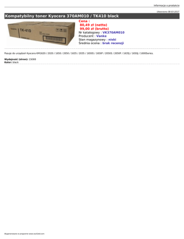Informacje o produkcie Utworzono 08-03-2017 Kompatybilny toner Kyocera 370AM010 / TK410 black Cena : 80,49 zł (netto) 99,00 zł (brutto) Nr katalogowy : VK370AM010 Producent : Vanke Stan magazynowy : niski Średnia ocena : brak recenzji Pasuje do urządzeń Kyocera KM1620 / 2020 / 1650 / 2050 / 1635 / 2035 / 1650S / 1650F / 2050S / 2050F / 1635J / 1650J / 1600Series. Wydajność (stron): 15000 Kolor: black Wygenerowano w programie www.oscGold.com
