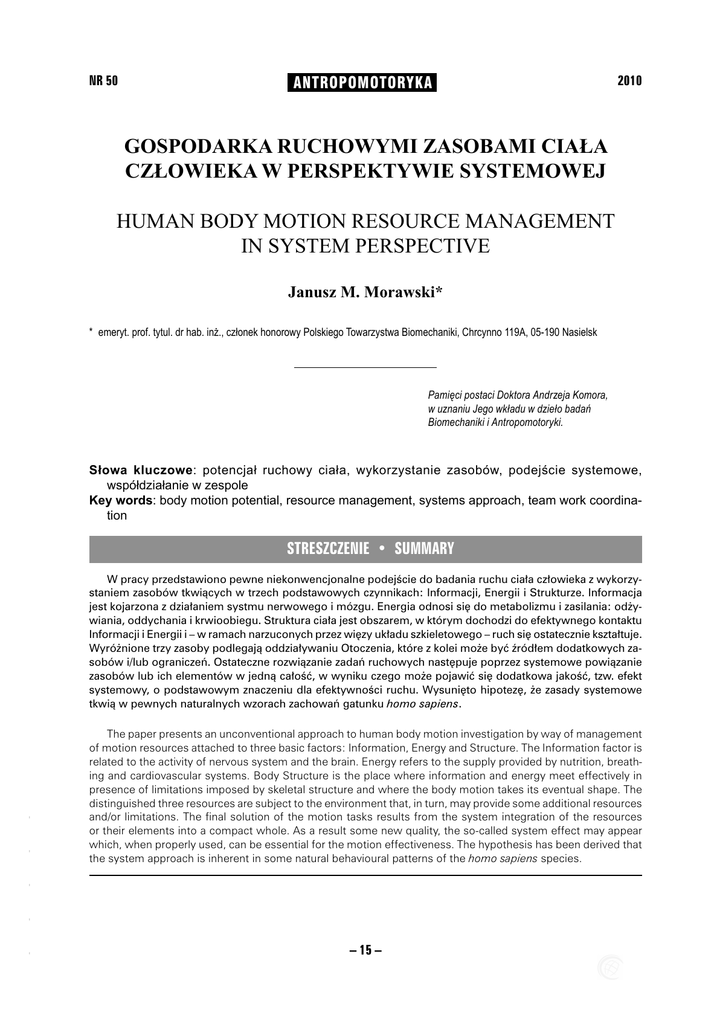 NR 50 AN TRO PO MO TO RY KA 2010 GOSPODARKA RUCHOWYMI ZASOBAMI CIAŁA CZŁOWIEKA W PERSPEKTYWIE SYSTEMOWEJ HUMAN BODY MOTION RESOURCE MANAGEMENT IN SYSTEM PERSPECTIVE Janusz M. Morawski* * emeryt. prof. tytul. dr hab. inż., członek honorowy Polskiego Towarzystwa Biomechaniki, Chrcynno 119A, 05-190 Nasielsk Pamięci postaci Doktora Andrzeja Komora, w uznaniu Jego wkładu w dzieło badań Biomechaniki i Antropomotoryki. Słowa kluczowe: potencjał ruchowy ciała, wykorzystanie zasobów, podejście systemowe, współdziałanie w zespole Key words: body motion potential, resource management, systems approach, team work coordination STRESZCZENIE • SUMMARY The paper presents an unconventional approach to human body motion investigation by way of management of motion resources attached to three basic factors: Information, Energy and Structure. The Information factor is related to the activity of nervous system and the brain. Energy refers to the supply provided by nutrition, breathing and cardiovascular systems. Body Structure is the place where information and energy meet effectively in presence of limitations imposed by skeletal structure and where the body motion takes its eventual shape. The distinguished three resources are subject to the environment that, in turn, may provide some additional resources and/or limitations. The final solution of the motion tasks results from the system integration of the resources or their elements into a compact whole. As a result some new quality, the so-called system effect may appear which, when properly used, can be essential for the motion effectiveness. The hypothesis has been derived that the system approach is inherent in some natural behavioural patterns of the homo sapiens species. - - - - - W pracy przedstawiono pewne niekonwencjonalne podejście do badania ruchu ciała człowieka z wykorzystaniem zasobów tkwiących w trzech podstawowych czynnikach: Informacji, Energii i Strukturze. Informacja jest kojarzona z działaniem systmu nerwowego i mózgu. Energia odnosi się do metabolizmu i zasilania: odżywiania, oddychania i krwioobiegu. Struktura ciała jest obszarem, w którym dochodzi do efektywnego kontaktu Informacji i Energii i – w ramach narzuconych przez więzy układu szkieletowego – ruch się ostatecznie kształtuje. Wyróżnione trzy zasoby podlegają oddziaływaniu Otoczenia, które z kolei może być źródłem dodatkowych zasobów i/lub ograniczeń. Ostateczne rozwiązanie zadań ruchowych następuje poprzez systemowe powiązanie zasobów lub ich elementów w jedną całość, w wyniku czego może pojawić się dodatkowa jakość, tzw. efekt systemowy, o podstawowym znaczeniu dla efektywności ruchu. Wysunięto hipotezę, że zasady systemowe tkwią w pewnych naturalnych wzorach zachowań gatunku homo sapiens. – 15 – Janusz M. Morawski - - - - - Wprowadzenie Ostatnio pojawia się coraz więcej projektów organizacyjnych i badawczych (te drugie też wymagają osłony organizacyjnej), których celem jest efektywne i skuteczne rozwiązywanie pojawiających się problemów, ważnych dla praktyki, przy optymalnym wykorzystaniu dysponowanych środków. Te środki mogą dotyczyć następujących sfer: finansowej, infrastruktury i wyposażenia, potencjału i umiejętności ludzi, informacji itp. i z reguły podlegają określonym ograniczeniom. Takie projekty wchodzą w zakres wyodrębniającej się gałęzi wiedzy, której przypisywane jest określenie: resource management. Termin: resource jest jednoznacznie rozumiany jako zasób. Słowo: management jest słownikowo tłumaczone na polski jako zarządzanie. Zarządzanie w domniemaniu zakłada istnienie pewnego podmiotu zarządzającego, działającego w trybie autorytatywnym i obiektu podlegającego zarządzaniu. Mówiąc o zarządzaniu mamy na myśli mniej lub bardziej sformalizowane działania człowieka, warunkowane rygorami prawnymi, fiskalnymi i politycznymi. Obiekt zarządzany, w domyśle, zachowuje się biernie. Bliższym naszym rozważaniom odpowiednikiem określenia: management wydaje się termin: gospodarka, który dosłownie tłumaczony na angielski brzmiałby: economics, z charakterystyczną dla anglosaskiej liczby mnogiej końcówką „s”. Określenie: gospodarka kojarzy się z teleologicznie ukierunkowanym współdziałaniem między równorzędnymi podmiotami, bez jakiegokolwiek odgórnie wyodrębnionego podmiotu zarządzającego. Podłożem gospodarki jest swoisty „bilans” pomiędzy spodziewanymi efektami i poniesionymi kosztami pozyskania tych efektów. Zwrot: resource management ma różne odniesienia. I tak energy management będzie oznaczał najbardziej efektywną, a jednocześnie oszczędną gospodarkę zasobami energii, information management – wykorzystanie zasobów informacji z uwzględnieniem jej dostępności i wiarygodności [1], risk management – optymalne rozstrzygnięcie kontrowersji między zagrożeniami i kosztami dla uniknięcia lub ograniczenia tych zagrożeń [2], a crew/cockpit resource management – wykorzystanie zasobów ludzkich i technologicznych w kokpicie samolotu [1, 3, 4, 5]. W szczególności w studiach nad szeroko rozumianym ruchem ciała człowieka można mówić o gospodarce ruchowymi zasobami ciała człowieka, GRZCC. (W języku angielskim byłoby to określenie: human body motion resource management, HBMRM). Należy zwrócić uwagę na ukierunkowanie tak sformułowanego zadania na osiągnięcie konkretnego celu; nie idzie o „badanie czegoś … u kogoś …”, z koncentracją na samej czynności badania, ale o rozwiązanie istotnego dla praktyki problemu. Zasoby wykorzystywane dla realizacji ruchu mogą być, najogólniej biorąc, przypisane trzem głównym czynnikom: Informacji, Energii i Strukturze, uwarunkowanym przez Otoczenie. Te trzy główne czynniki są tak ściśle wzajemnie uzależnione, że trudno przypisać jednemu z nich funkcję zarządzania. To uzasadnia stosowanie w tym przypadku określenia: gospodark