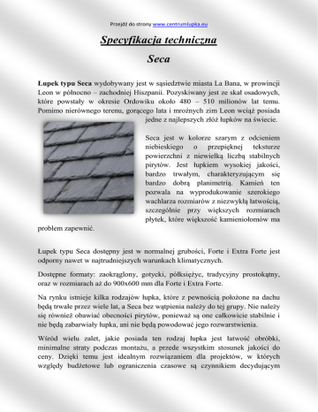 Przejdź do strony www.centrumlupka.eu Specyfikacja techniczna Seca Łupek typu Seca wydobywany jest w sąsiedztwie miasta La Bana, w prowincji Leon w północno – zachodniej Hiszpanii. Pozyskiwany jest ze skał osadowych, które powstały w okresie Ordowiku około 480 – 510 milionów lat temu. Pomimo nierównego terenu, gorącego lata i mroźnych zim Leon wciąż posiada jedne z najlepszych złóż łupków na świecie. Seca jest w kolorze szarym z odcieniem niebieskiego o przepięknej teksturze powierzchni z niewielką liczbą stabilnych pirytów. Jest łupkiem wysokiej jakości, bardzo trwałym, charakteryzującym się bardzo dobrą planimetrią. Kamień ten pozwala na wyprodukowanie szerokiego wachlarza rozmiarów z niezwykłą łatwością, szczególnie przy większych rozmiarach płytek, które większość kamieniołomów ma problem zapewnić. Łupek typu Seca dostępny jest w normalnej grubości, Forte i Extra Forte jest odporny nawet w najtrudniejszych warunkach klimatycznych. Dostępne formaty: zaokrąglony, gotycki, półksiężyc, tradycyjny prostokątny, oraz w rozmiarach aż do 900x600 mm dla Forte i Extra Forte. Na rynku istnieje kilka rodzajów łupka, które z pewnością położone na dachu będą trwałe przez wiele lat, a Seca bez wątpienia należy do tej grupy. Nie należy się również obawiać obecności pirytów, ponieważ są one całkowicie stabilnie i nie będą zabarwiały łupka, ani nie będą powodować jego rozwarstwienia. Wśród wielu zalet, jakie posiada ten rodzaj łupka jest łatwość obróbki, minimalne straty podczas montażu, a przede wszystkim stosunek jakości do ceny. Dzięki temu jest idealnym rozwiązaniem dla projektów, w których względy budżetowe lub ograniczenia czasowe są czynnikiem decydującym podczas realizacji projektu, nie powodując jednocześnie utraty na jakości w stosunku do ceny. Łupek ten spełnia wymogi Europejskiej normy EN:12326-1 - A1 S1 T1. Specyfikacja techniczna: TEST* OTRZYMANE WYNIKI Absorpcja wody Ekspozycja na dwutlenek siarki (SO2) Cykl termiczny Zawartość węgla niewęglanowego Zawartość węglanów Odporność na ogień Reakcja na ogień Uwalnianie substancji niebezpiecznych Odporność mechaniczna wzdłużna Odporność mechaniczna poprzeczna A1 S1 T1 0,26 % (≤1,5 %) 0,04 % (≤1,5 %) Zgodne Zgodne, klasa A1 Brak w określonych stosowania 54 MPa 49 MPa warunkach *Wyniki otrzymane z próbek testowych zgodnie z EN 12326 -2: 2000. Łupek i inne wyroby z kamienia naturalnego do zakładkowych pokryć dachowych i okładzin elewacyjnych. Tabela pokryć łupkiem: Ułożenie zakładkowe – head lap mm Rozmiar mm 600x300 500x300 500x250 460x225 400x250 400x200 75mm 12,5 15,4 18,5 17,5 24,1 30 80mm 12,6 15,6 18,7 17,7 24,5 30,5 85mm 12,7 15,8 18,9 18 24,9 31 90mm 12,9 16 19,1 18,2 25,3 31,5 95mm 13 16,2 19,4 18,5 25,7 32 100mm 13,1 16,4 19,6 18,7 26,1 32,5 105mm 13,2 16,6 19,9 19 26,6 33,1 110mm 13,4 16,8 20,1 19,3 27 33,6 115mm 13,4 17 20,4 19,6 27,5 34,2 Minimalne zalecane ułożenie zakładkowe zależne od kąta nachylenia dachu: Rozmiar mm Minimalne nachylenie dachu – Severe exposure (56.5 L/M2 or greater per spell) 20◦ 600x300 500x300 500x250 460x225 400x250 400x200 Rozmiar mm 600x300 500x300 500x250 460x225 400x250 400x200 22,5◦ 25◦ 27,5◦ 130 120 110 30◦ 100 100 100 100 100 100 35◦ 90 90 90 90 90 90 40◦ 80 80 80 80 80 80 45◦ - 75◦ 70 70 70 70 70 70 85◦ 65 65 65 65 Minimalne nachylenie dachu – Moderate exposure (Less than 56.5 L/M2 per spell) 20◦ 22,5◦ 115 105 25◦ 95 95 95 27,5◦ 85 85 85 30◦ 80 80 80 80 80 80 35◦ 70 70 70 70 70 70 40◦ 60 60 60 60 60 60 45◦ - 75◦ 55 55 55 55 55 55 85◦ 50 50 50 50 W celu uzyskania pomocy technicznej lub innych pytań prosimy o kontakt [email protected] lub pod numerem telefonu 511 – 596 – 988. AWR & BHP Sp. z o.o. www.centumlupka.eu