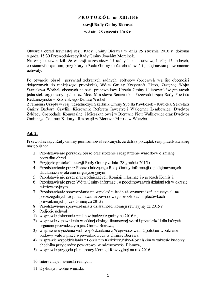 P R O T O K Ó Ł nr XIII /2016 z sesji Rady Gminy Bierawa w dniu 25 stycznia 2016 r. Otwarcia obrad trzynastej sesji Rady Gminy Bierawa w dniu 25 stycznia 2016 r. dokonał o godz. 15:30 Przewodniczący Rady Gminy Joachim Morcinek. Na wstępie stwierdził, że w sesji uczestniczy 15 radnych na ustawową liczbę 15 radnych, co stanowiło quorum, przy którym Rada Gminy może obradować i podejmować prawomocne uchwały. Po otwarciu obrad przywitał zebranych radnych, sołtysów (obecnych wg list obecności dołączonych do niniejszego protokołu), Wójta Gminy Krzysztofa Ficoń, Zastępcę Wójta Stanisława Wróbel, obecnych na sesji pracowników Urzędu Gminy i kierowników gminnych jednostek organizacyjnych oraz Mec. Mirosława Semeniuk i Przewodniczącą Rady Powiatu Kędzierzyńsko – Kozielskiego Danutę Wróbel. Z ramienia Urzędu w sesji uczestniczyli Skarbnik Gminy Sybilla Pawliczek – Kubicka, Sekretarz Gminy Barbara Gawlik, Kierownik Referatu Inwestycji Waldemar Lembowicz, Dyrektor Zakładu Gospodarki Komunalnej i Mieszkaniowej w Bierawie Piotr Walkiewicz oraz Dyrektor Gminnego Centrum Kultury i Rekreacji w Bierawie Mirosław Wierzba. Ad. 2. Przewodniczący Rady Gminy poinformował zebranych, że dalszy porządek sesji przedstawia się następująco: 2. Przedstawienie porządku obrad oraz złożenie i rozpatrzenie wniosków o zmianę porządku obrad. 3. Przyjęcie protokołu z sesji Rady Gminy z dnia 28 grudnia 2015 r. 4. Przedstawienie przez Przewodniczącego Rady Gminy informacji o podejmowanych działaniach w okresie międzysesyjnym. 5. Przedstawienie przez przewodniczących Komisji informacji o pracach Komisji. 6. Przedstawienie przez Wójta Gminy informacji o podejmowanych działaniach w okresie międzysesyjnym. 7. Przedstawienie sprawozdania nt. wysokości średnich wynagrodzeń nauczycieli na poszczególnych stopniach awansu zawodowego w szkołach i placówkach prowadzonych przez Gminę za 2015 r. 8. Przedstawienie sprawozdania z działalności komisji rewizyjnej za 2015 r. 9. Podjęcie uchwał: 1) w sprawie dokonania zmian w budżecie gminy na 2016 r., 2) w sprawie zapewnienia wspólnej obsługi finansowej szkół i przedszkoli dla których organem prowadzącym jest Gmina Bierawa, 3) w sprawie wyrażenia woli współdziałania z Województwem Opolskim w zakresie budowy wałów przeciwpowodziowych w Gminie Bierawa, 4) w sprawie współdziałania z Powiatem Kędzierzyńsko-Kozielskim w zakresie budowy chodnika przy drodze powiatowej w miejscowości Bierawa, 5) w sprawie przyjęcia planu pracy Komisji Rewizyjnej na rok 2016. 10. Interpelacje i wnioski radnych. 11. Dyskusja i wolne wnioski. 1 12. Zakończenie obrad. Wniosków o zmianę porządku obrad nie zgłoszono. Przewodniczący Rady Gminy poinformował, że Rada Gminy będzie obradowała według przedstawionego porządku obrad. ad. 3. Przewodniczący Rady Gminy poinformował, że został wyłożony na sali obrad protokół z dwunastej sesji Rady Gminy z 28 grudnia 2015 r. i w celu jego przyjęcia zgodnie z § 29 statutu gminy zostanie przeprowadzone głosowanie. Następnie zwrócił się z zapytaniem czy radni mają uwagi do protokołu? Uwag do protokołu nie zgłoszono. Przewodniczący Rady Gminy przeprowadził głosowanie w sprawie przyjęcia protokołu. Za przyjęciem protokołu opowiedziało się 14 radnych, na 14 obecnych na sali obrad, przy braku głosów przeciwnych i wstrzymujących. Przewodniczący Rady Gminy stwierdził, że protokół nr XII/2015 z sesji Rady Gminy z 28 grudnia 2015 r. został przyjęty. ad. 4. Przewodniczący Rady Gminy poinformował, że w okresie międzysesyjnym podejmował takie działania jak : 1) brał udział w posiedzeniu komisji ds. oświaty, kultury, zdrowia, wychowania fizycznego i sportu w dniu 18 stycznia 2016 r., 2) brał udział w posiedzeniu komisji ds. budżetu i rozwoju gospodarczego w dniu 20 stycznia 2016 r., 3) w dniu 18 stycznia br. brał udział w spotkaniu z Dyrektorem Firmy Przewozowej Ariva w Kędzierzynie-Koźlu, tematem którego było omówienie możliwości przedłużenia kursów autobusowych z Kotlarni w kierunku Sierakowic i Gliwic, 4) uczestniczył w przygotowaniu sesji oraz w organizowaniu bieżącej pracy Rady Gminy Bierawa, 5) pełnił dyżury w każdy drugi i czwarty poniedziałek miesiąca, 6) uczestniczył w zebraniach wiejskich - w dniu 18 stycznia br. w Goszycach, 19 stycznia br. w Starym Koźlu i 21 stycznia br. w Bierawie. Poinformował, że do Rady Gminy wpłynęły pisma: 1) Rady Miejskiej w Prószkowie w sprawie wyrażenia sprzeciwu wobec działań Prezydenta Miasta Opola mających na celu powiększenie terytorium Opola, 2) Rady Gminy Łubniany w sprawie wyrażenia stanowiska sprzeciwu wobec działań Prezydenta Miasta Opola mających na celu powiększenie terytorium Opola, 3) Dyrektora Zespołu Szkół Dwujęzycznych w Solarni w sprawie zmiany nazwy Zespołu i szkół wchodzących w skład Zespołu, 4) Polskiego Stowarzyszenia na rzecz osób z upośledzeniem umysłowym o dofinansowanie kosztów utrzymania Warsztatów Terapii Zajęciowej w Kędzierzynie-Koźlu, 5) z Wojewódzkiego Inspektoratu Ochrony Środowiska w Opolu w sprawie sprawozdania z realizacji zadań z zakresu gospodarki odpadami. 2 ad. 5. Radny P. Szewerda - poinformował, że komisja rewizyjna obradowała w dniu 15 stycznia br. Tematem posiedzenia było przygotowanie sprawozdania z działalności komisji za 2015 r. oraz planu pracy na 2016 r. Radny R. Skotarczyk - poinformował, że komisja ds. budżetu i rozwoju gospodarczego spotkała się na jednym posiedzeniu w dniu 20 stycznia br. celem omówienia projektów uchwał na dzisiejszą sesję. Radny P. Musioł - poinformował, że komisja ds. porządku publicznego, bezpieczeństwa, rolnictwa i ochrony środowiska w okresie międzysesyjnym nie obradowała. Radna J. Szewerda - poinformowała, że komisja spotkała się na posiedzeniu w dniu 18 stycznia br. Pierwszym tematem posiedzenia było omówienie sprawozdania na temat wysokoś