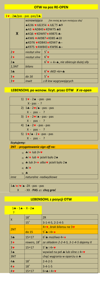 OTW na poz RE-OPEN 1 - 2 /pas - pas -pas/2 wznawiająca /im mniej tym mniejsza siła/ A3 AD843 KDW75 8 KQ6 KDW97 A9875 KW6 AK987 KD85 10 KD76 KD843 KDW7 K975 AW843 KW96 X 2 niezbyt silne 5+ 2 niezbyt silne 6+ 6+ 2 2,3NT nie obiecuje dużej siły bilans 6+ AKD +kr= 3 3 3 5+ 8 lew wygrywających do 16 inwit LEBENSOHL po wznow. licyt. przez OTW X re-open 1) 1 - 2 - pas - pas X - pas - ? 2) 1 - 2 / - pas - pas X - pas - ? 3) 1 - 2 - pas - pas X - pas - ? 4) 1 - 2 - pas - pas X - pas - ? 5) 1 / - 2 -pas - pas X - pas - ? licytujemy: 2NT - przygotowanie sign off na: 1) lub 3= 2) lub 3) lub 3= jeżeli było 2 albo jeżeli było 2 4) 5) inne naturalne -nadwyżkowe 1 -2X - pas - pas - XX - PAS chcę grać X LEBENSOHL z pozycji OTW 1 -1 - X-2 ? 18+ ZR 15+ 3-1-4-5, 2-2-4-5 4= , brak bilansu na 3 do 15 5+ i 4= 3 15÷17 6+ możliwa 4= 3 rewers, 18+ ze składem 2-2-4-5, 3-1-4-5 dajemy X 3 3 3NT 15÷17 5+ i 4= wywiad na peł. lub silne z 4= chęć wygrania w oparciu o 4 18+ 2-4-2-5 4 4 + X 2NT 18 15÷17 3-4-1-5 6= i 4= 1 -1 - X-2 2NT - pas- ? 3 do gry inne FF negatywny wybór koloru natur.forsujące 1 -1 - X-2 ? 18+ X ZR + 3-1-4-5, 2-2-4-5 2 15 rewers 2NT inne 11÷15 FF 5+ i 4= naturalne 1 - pas - 1NT - 2 ? 2NT X 11÷15 nadwyżka 5+ i 4= ZR 1 -1 -X-2 ? 5+ i 4= 2NT 5 + i5 + brak bilansu na 3 sign off + X 3 3 inne 1 - pas - 1 ? 2NT X 1 - pas - 1 ? 2NT 3 inne 1 - pas - 1 ? 6 sign off nadwyżka ZR FF NAT inwit FF nadwyżkowe -2 / 5+ i 4 + sign off + 6 sign off nadwyżka ZR -2 5+ i 5 + FF sign off 6+ dobry kolor nadwyżkowe -2 5+ i 5 + 2NT sign off + 3 / FF 6 dobry kolor NAT 3 inne FF FF 6+ dobry kolor nadwyżkowe 1 - pas - 1 ? 2NT 3 inne -2 5+ i 5 + FF FF sign off + 6 dobry kolor nadwyżkowe reasumując: 2NT zawsze słabe! Inform. o longerze bocznym, 6+ w kol otwarcia lub 4= po kontrze sputnik nowy kolor forsuje ( F, FF ) skok kol.otw inwit kontra nadwyżka ZR,propozycyjna 3 w kol.wroga - FF, ręka jednokolor. lub z fitem w kol.partnera