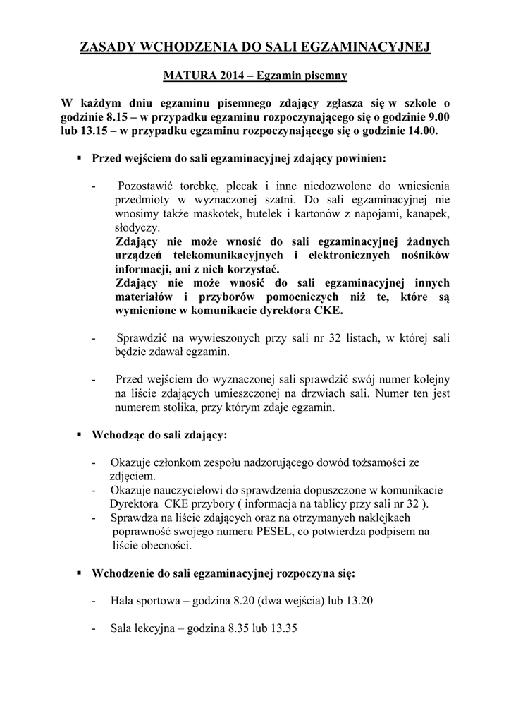 ZASADY WCHODZENIA DO SALI EGZAMINACYJNEJ MATURA 2014 – Egzamin pisemny W każdym dniu egzaminu pisemnego zdający zgłasza się w szkole o godzinie 8.15 – w przypadku egzaminu rozpoczynającego się o godzinie 9.00 lub 13.15 – w przypadku egzaminu rozpoczynającego się o godzinie 14.00. Przed wejściem do sali egzaminacyjnej zdający powinien: - Pozostawić torebkę, plecak i inne niedozwolone do wniesienia przedmioty w wyznaczonej szatni. Do sali egzaminacyjnej nie wnosimy także maskotek, butelek i kartonów z napojami, kanapek, słodyczy. Zdający nie może wnosić do sali egzaminacyjnej żadnych urządzeń telekomunikacyjnych i elektronicznych nośników informacji, ani z nich korzystać. Zdający nie może wnosić do sali egzaminacyjnej innych materiałów i przyborów pomocniczych niż te, które są wymienione w komunikacie dyrektora CKE. - Sprawdzić na wywieszonych przy sali nr 32 listach, w której sali będzie zdawał egzamin. - Przed wejściem do wyznaczonej sali sprawdzić swój numer kolejny na liście zdających umieszczonej na drzwiach sali. Numer ten jest numerem stolika, przy którym zdaje egzamin. Wchodząc do sali zdający: - Okazuje członkom zespołu nadzorującego dowód tożsamości ze zdjęciem. Okazuje nauczycielowi do sprawdzenia dopuszczone w komunikacie Dyrektora CKE przybory ( informacja na tablicy przy sali nr 32 ). Sprawdza na liście zdających oraz na otrzymanych naklejkach poprawność swojego numeru PESEL, co potwierdza podpisem na liście obecności. Wchodzenie do sali egzaminacyjnej rozpoczyna się: - Hala sportowa – godzina 8.20 (dwa wejścia) lub 13.20 - Sala lekcyjna – godzina 8.35 lub 13.35 Po wejściu do sali egzaminacyjnej zdający zajmuje stolik z numerem odpowiadającym numerowi na liście zdających. ZASADY WCHODZENIA DO SALI EGZAMINACYJNEJ MATURA 2014 – Egzamin ustny W dniu egzaminu ustnego wszyscy zdający w danej grupie zgłaszają się w szkole 15 minut przed wyznaczoną godziną pierwszego zdającego w tej grupie. Zdający oczekują na egzamin w sali nr 28. Pod salą egzaminacyjną przebywa tylko 1 osoba, kolejna z listy. Przed wejściem do sali egzaminacyjnej zdający powinien: - Pozostawić torebkę, plecak i inne niedozwolone do wniesienia przedmioty w wyznaczonej szatni. Do sali egzaminacyjnej nie wnosimy także maskotek. Zdający nie może wnosić do sali egzaminacyjnej żadnych urządzeń telekomunikacyjnych i elektronicznych nośników informacji, ani z nich korzystać. Zdający nie może wnosić do sali egzaminacyjnej innych materiałów i przyborów pomocniczych niż te, które są wymienione w komunikacie dyrektora CKE. W przypadku języka polskiego zdający wnosi na salę ramowy plan prezentacji oraz wymienione w bibliografii pomoce. - Sprawdzić na listach wywieszonych w sali nr 28 kolejność zdających w danej grupie. Kolejność ta obowiązuje przy przystępowaniu do egzaminu. Wchodząc do sali zdający: - Okazuje członkom zespołu nadzorującego dowód tożsamości ze zdjęciem. Okazuje nauczycielowi – członkowi PZE ramowy plan prezentacji oraz wnoszone pomoce, wymienione w bibliografii. Po wejściu do sali egzaminacyjnej postępuje zgodnie z odpowiednimi procedurami.