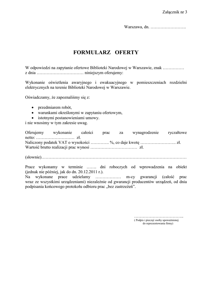 Załącznik nr 3 Warszawa, dn. ……………………. FORMULARZ OFERTY W odpowiedzi na zapytanie ofertowe Biblioteki Narodowej w Warszawie, znak …………… z dnia …………………………… niniejszym oferujemy: Wykonanie oświetlenia awaryjnego i ewakuacyjnego w pomieszczeniach rozdzielni elektrycznych na terenie Biblioteki Narodowej w Warszawie. Oświadczamy, Ŝe zapoznaliśmy się z: • przedmiarem robót, • warunkami określonymi w zapytaniu ofertowym, • istotnymi postanowieniami umowy. i nie wnosimy w tym zakresie uwag. Oferujemy wykonanie całości prac za wynagrodzenie ryczałtowe netto: ……………………… zł. Naliczony podatek VAT o wysokości …………. %, co daje kwotę ……………………. zł. Wartość brutto realizacji prac wynosi …………………………… zł. (słownie)………………………………………………………………………………………… Prace wykonamy w terminie ……. dni roboczych od wprowadzenia na obiekt (jednak nie później, jak do dn. 20.12.2011 r.). Na wykonane prace udzielamy ……………… m-cy gwarancji (całość prac wraz ze wszystkimi urządzeniami) niezaleŜnie od gwarancji producentów urządzeń, od dnia podpisania końcowego protokołu odbioru prac „bez zastrzeŜeń”. …………………………….. ( Podpis i pieczęć osoby upowaŜnionej do reprezentowania firmy)