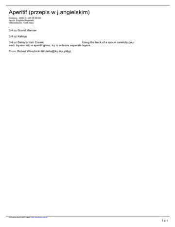 Aperitif (przepis w j.angielskim) Dodano: 2000-01-01 00:00:00 Język: English/Angielski Odwiedzono: 1235 razy. 3/4 oz Grand Marnier 3/4 oz Kahlua 3/4 oz Bailey's Irish Cream Using the back of a spoon carefully pour each liqueur into a aperitif glass, try to achieve separate layers. From: Robert Wierzbicki <[email protected]> Wirtualna Kuchni@ Polska - http://kuchnia.now.pl przepis nr 3614, plik wygenerowano 2017.03.08 19:02 1z1