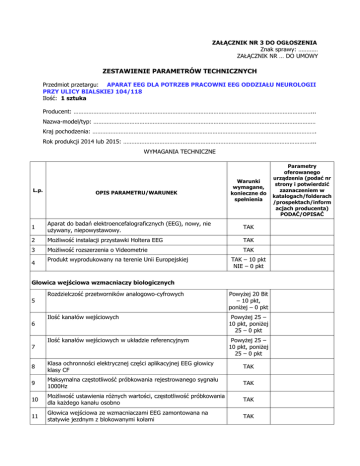 ZAŁĄCZNIK NR 3 DO OGŁOSZENIA Znak sprawy: ………… ZAŁĄCZNIK NR … DO UMOWY ZESTAWIENIE PARAMETRÓW TECHNICZNYCH Przedmiot przetargu: APARAT EEG DLA POTRZEB PRACOWNI EEG ODDZIAŁU NEUROLOGII PRZY ULICY BIALSKIEJ 104/118 Ilość: 1 sztuka Producent: ………………………………………………………………………………………………………………………………... Nazwa-model/typ: ……………………………………………………………………………………………………………………… Kraj pochodzenia: ………………………………………………………………………………………………………………………. Rok produkcji 2014 lub 2015: ……………………………………………………………………………………………………... WYMAGANIA TECHNICZNE L.p. OPIS PARAMETRU/WARUNEK Warunki wymagane, konieczne do spełnienia 1 Aparat do badań elektroencefalograficznych (EEG), nowy, nie używany, niepowystawowy. TAK 2 Możliwość instalacji przystawki Holtera EEG TAK 3 Możliwość rozszerzenia o Videometrie TAK 4 Produkt wyprodukowany na terenie Unii Europejskiej TAK – 10 pkt NIE – 0 pkt Głowica wejściowa wzmacniaczy biologicznych 5 Rozdzielczość przetworników analogowo-cyfrowych Powyżej 20 Bit – 10 pkt, poniżej – 0 pkt Ilość kanałów wejściowych Powyżej 25 – 10 pkt, poniżej 25 – 0 pkt Ilość kanałów wejściowych w układzie referencyjnym Powyżej 25 – 10 pkt, poniżej 25 – 0 pkt 6 7 8 Klasa ochronności elektrycznej części aplikacyjnej EEG głowicy klasy CF TAK 9 Maksymalna częstotliwość próbkowania rejestrowanego sygnału 1000Hz TAK 10 Możliwość ustawienia różnych wartości, częstotliwość próbkowania dla każdego kanału osobno TAK 11 Głowica wejściowa ze wzmacniaczami EEG zamontowana na statywie jezdnym z blokowanymi kołami TAK Parametry oferowanego urządzenia (podać nr strony i potwierdzić zaznaczeniem w katalogach/folderach /prospektach/inform acjach producenta) PODAĆ/OPISAĆ 12 Głowica posiada wbudowane gniazdo wielopinowe do podłączenia czepków elektrodowych TAK 13 Wyjście sygnałów elektrofizjologicznych z głowicy wzmacniaczy do jednostki rejestrującej realizowane za pomocą kabla USB TAK 14 Ilość niezależnych kanałów wejściowych w układzie symetrycznym: 2 TAK 15 Wyjście i wejście wyzwalające TTL TAK 16 Impedancja wejściowa ≥ 100MΩ TAK 17 Poziom szumów: ≤ 0,3 μV RMS TAK 18 Współczynnik tłumienia sygnałów współbieżnych CMRR ≥ 114dB TAK Stymulatory 19 Fotostymulator LED zamontowany na ramieniu z podłączeniem USB bezpośrednio do jednostki rejestrującej PC z czerwonym filtrem TAK Oprogramowanie diagnostyczne do jednostki rejestrującej 20 Oprogramowanie specjalistyczne działające w 64-bitowym systemie operacyjnym MS Windows 7 lub nowszym. Stworzone w oparciu o platformę programistyczną Microsoft.NET TAK 21 Wstawianie znaczników zdarzeń w badaniu EEG w miejscu wystąpienia zdarzenia, brak opóźnień pomiędzy zdarzeniem, a znacznikiem w trybie rejestracji badania. TAK 22 Możliwość zatrzymania obrazu EEG na ekranie bez zatrzymania rejestracji badania TAK 23 Baza pacjentów i badań oparta na bazie SQL server TAK 24 Oprogramowanie umożliwiające rejestrację i gromadzenie danych i ich wyszukiwanie według różnych kryteriów, prowadzenie archiwizacji TAK 25 Oprogramowanie umożliwiające zapis, przeglądanie badań EEG z funkcją dowolnych montaży, pomiaru czasu i amplitudy, płynnego przeglądania, powiększania wybranych fragmentów, automatyczną analizę z określeniem dominującej częstotliwości. TAK 26 Możliwość definiowania min. 10 szablonów raportów o pacjencie z użyciem dowolnych danych znajdujących się w bazie danych. Każdy z szablonów wywoływany z listy wyboru w programie diagnostycznym. W raporcie aktywna korekcja błędów ortograficznych podczas wypełniania przez lekarza TAK 27 Możliwość definiowania przez użytkownika dodatkowych, niezależnych pól informacji o pacjencie lub badaniu w bazie danych. Dane z tych pól będą automatycznie przesyłane do szablonu opisu. TAK 28 Możliwość definiowania min. 10 szablonów opisów badań niezależnych od raportów o pacjencie z użyciem dowolnych danych znajdujących się w bazie danych. Każdy z szablonów wywoływany z listy wyboru. Każdy z szablonów wywoływany z listy wyboru w programie diagnostycznym. W opisie badań aktywna korekcja błędów ortograficznych podczas wypełniania TAK przez lekarza Pozostałe 29 Konstrukcja mechaniczno-elektryczna: przewoźna, stacyjna. TAK 30 Wózek metalowy o specjalizowanej, solidnej budowie na ogumionych kołach z blokadami, wbudowanym komputerem PC, metalowa półka na klawiaturę, mysz, drukarkę TAK System komputerowy jednostki sterującej 31 Procesor min. Intel i5 2,5 GHz TAK 32 Pamięć RAM: SDD3 min 8GB TAK 33 Dysk HDD: min 1TB lub większy TAK 34 Napęd DVD/RW TAK 35 System operacyjny: Windows 7 Professional lub nowszy TAK 36 Oprogramowanie Microsoft Office 2010 lub nowszy TAK 37 Monitor LCD min 24” o rozdzcielczości min. 1920 x 1080 zintegrowany z wózkiem TAK 38 Drukarka laserowa monochromatyczna TAK Oprogramowanie diagnostyczne jednostki PC do opisu i analizy EEG 39 Oprogramowanie specjalistyczne działające w 64-bitowym systemie operacyjnym MS Windows 7 lub nowszym. Stworzenie w oparciu o platformę programistyczną Microsoft.NET TAK 40 Podgląd na stacji do odczytu w trybie On-line (na żywo) aktualnie rejestrowanych badań. TAK 41 System kompatybilny z protokołem HL-7 TAK 42 Oprogramowanie umożliwiające rejestrację i gromadzenie danych i ich wyszukiwanie według różnych kryteriów, prowadzenie archiwizacji. TAK 43 Baza pacjentów i badań oparta na bazie SQL TAK 44 Oprogramowanie służące do analizy zapisów metodą mapowania 2D i 3D i analizę spektralną. TAK 45 Oprogramowanie umożliwiające zapis, przeglądanie bada