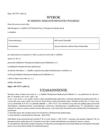 Sygn. akt VII U 1581/15 WYROK W IMIENIU RZECZYPOSPOLITEJ POLSKIEJ Dnia 28 czerwca 2016 roku. Sąd Okręgowy w Lublinie VII Wydział Pracy i Ubezpieczeń Społecznych w składzie: Przewodniczący: SSO Jacek Chaciński Protokolant: starszy sekretarz sądowy Beata Pełczyńska po rozpoznaniu na rozprawie w dniu 14 czerwca 2016 roku w Lublinie sprawy P. M. (1) przeciwko Zakładowi Ubezpieczeń Społecznych Oddziałowi w L. o podleganie ubezpieczeniom społecznym na skutek odwołania (...) Spółki z ograniczoną odpowiedzialnością z siedzibą w Ł. od decyzji Zakładu Ubezpieczeń Społecznych Oddziału w L. z dnia 21 lipca 2015 roku, nr (...) oddala odwołanie. Sygn. akt VII U 1581/15 UZASADNIENIE Decyzją z dnia 21 lipca 2015 roku nr (...), Zakład Ubezpieczeń Społecznych Oddział w L., na podstawie art. 83 ust. 1 pkt 1 w związku z art. 6 ust. 1 pkt 1, art. 11 ust. 1, art. 12 ust. 1, art. 13 pkt 1 ustawy z dnia 13 października 1998 roku o systemie ubezpieczeń społecznych (Dz. U. z 2013 roku, poz. 1442, z późn. zm.) oraz art. 83 §1 ustawy z dnia 23 kwietnia 1964 r. Kodeks cywilny (Dz. U. 2014 r. poz. 121 tj.) stwierdził, że P. M. (1) u płatnika składek (...) SP. Z O.O.” od 1 kwietnia 2015 roku nie podlega jako pracownik obowiązkowo ubezpieczeniom: emerytalnemu, rentowym, chorobowemu, wypadkowemu. W uzasadnieniu organ wskazał, iż umowa o pracę została zawarta dla pozoru, a jej celem było skonstruowanie okoliczności świadczących o pozostaniu w stosunku pracy aby uzyskać prawo do świadczeń z ubezpieczenia społecznego w razie choroby i macierzyństwa (decyzja - akta ZUS). Odwołanie od powyższej decyzji wniosła P. M. (1) oraz firma (...) SP. Z O.O.”, wnosząc o jej zmianę i objęcie P. M. (1) ubezpieczeniem społecznym od 1 kwietnia 2015 roku z tytułu zatrudnienia na podstawie umowy o pracę. W uzasadnieniu odwołania zostało wskazane, iż wolą stron zawierających umowę było faktyczne nawiązanie stosunku pracy oraz rzeczywiście doszło do świadczenia pracy za wynagrodzeniem (odwołanie – k. 2 – 10 akta sprawy). W odpowiedzi na odwołanie organ rentowy wniósł o jego oddalenie podtrzymując argumentację zawartą w zaskarżonej decyzji (odpowiedź na odwołanie – k. 51 – 53 a.s.). Sąd Okręgowy ustalił co następuje : P. M. (1) została zgłoszona przez płatnika (...) SP. Z O.O.” do obowiązkowych ubezpieczeń społecznych i ubezpieczenia zdrowotnego z tytułu umowy o pracę w pełnym wymiarze czasu pracy, od 1 kwietnia 2015 roku z wynagrodzeniem brutto w wysokości 3500,00 zł wykazanym w miesiącu kwiecień 2015 roku. Z danych zawartych w Kompleksowym Systemie Informatycznym ZUS w imiennych raportach, złożonych przez wyżej wskazanego płatnika wynika, że dla P. M. (1) została wskazana podstawa wymiaru składek na ubezpieczenia społeczne za miesiąc kwiecień 2015 roku w wysokości: 3.500.00 zł, za miesiąc maj 2015 roku: 583,33 zł, za miesiąc czerwiec 2015 roku: 0 zł. Ponadto w raportach wykazano wynagrodzenie za czas niezdolności do pracy od 7 maja 2015 roku do 8 czerwca 2015 roku oraz zasiłek chorobowy z ubezpieczenia chorobowego od 9 czerwca 2015 roku do 30 czerwca 2015 roku (uzasadnienie decyzji z 21 lipca 2015 roku - akta ZUS). Wobec powyższego Zakład Ubezpieczeń Społecznych Oddział w L. pismem z dnia 8 czerwca 2015 roku wezwał płatnika składek (...) SP. Z O.O.” do przedłożenia dokumentacji związanej z zatrudnieniem P. M. (1) oraz dokumentów potwierdzających świadczenie przez nią pracy (wezwanie – akta ZUS). W odpowiedzi na powyższe, pismem z dnia 12 czerwca 2015 roku, które wpłynęło do organu 17 czerwca 2015 roku, wezwany płatnik wskazał, iż P. M. (1) została zatrudniona dnia 1 kwietnia 2015 roku w pełnym wymiarze czasu pracy, przesyłając m.in. kopie podpisanych przez pracownicę dokumentów na dowód świadczenia przez nią pracy (pismo – akta ZUS). W tym stanie rzeczy wydana została zaskarżona decyzja z dnia 21 lipca 2015 roku. W celu dokonania niezbędnych ustaleń Sąd dopuścił dowody z dokumentów znajdujących się w aktach sprawy i aktach ZUS oraz dowody osobowe w postaci zeznań skarżącej P. M. (1) (protokół – k. 129v., 67v a.s.), oraz zeznań świadków: T. P. (protokół – k. 69 a.s.), P. J. (protokół – k. 69 a.s.) oraz E. Ś. (protokół – k. 128v. a.s.). P. M. (1) (...) roku otrzymała dyplom ukończenia studiów wyższych na kierunku zarządzanie i inżynieria produkcji o specjalności – zarządzanie przedsiębiorstwem uzyskując tym samym tytuł zawodowy – magister inżynier. Dnia 25 sierpnia 2014 roku została zatrudniona na umowę o pracę na czas zastępstwa w Urzędzie Marszałkowskim Województwa L. w L., na stanowisku podinspektora ds. transferu wiedzy i technologii w Departamencie (...) i (...), z wynagrodzeniem 2.200 zł brutto. Umowa o pracę na okres zastępstwa uległa rozwiązaniu z dniem 31 grudnia 2015 roku (akta osobowe pracownika – k. 89 a.s.). Dnia 1 kwietnia 2015 roku P. M. (1) zawarła umowę o pracę z firmą (...) SP Z O.O”, której zgodnie z danymi zawartymi w Centralnej Informacji Krajowego Rejestru Sądowego jest wspólnikiem. Zatrudniona została na stanowisku kierownika okręgowej stacji kontroli pojazdów z wynagrodzeniem 3.500.00 zł brutto, z miejscem wykonywania pracy K. T. 167 (umowa o pracę – akta osobowe pracownika – k. 91 a.s., Centralna Informacja Krajowego Rejestru Sądowego – akta ZUS). Do zakresu obowiązków wnioskodawczyni należało m.in. przestrzeganie terminów legalizacji urządzeń diagnostycznych, nadzorowanie prowadzonych badań technicznych pojazdów przez diagnostę, kontrola jakości wykonywanych prac diagnosty, dbanie o wizerunek firmy w stosunkach z klientami i partnerami biznesowymi, przyjmowanie i zdawanie pojazdów mechanicznych przekazywanych do naprawy i z naprawy w warsztacie na podstawie obowiązujących dokumentów, wystawianie faktur sprzedaży i zleceń naprawy pojazdów. P. M. (