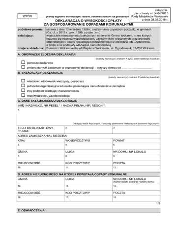 załącznik do uchwały nr IX-64/2015 (należy wypełnić drukowanymi literami, kolorem czarnym lub granatowym) Rady Miejskiej w Wołominie z dnia 28.05.2015 r. DEKLARACJA O WYSOKOŚCI OPŁATY WZÓR ZA GOSPODAROWANIE ODPADAMI KOMUNALNYMI podstawa prawna: ustawa z dnia 13 września 1996 r. o utrzymaniu czystości i porządku w gminach (Dz. U. z 2013 r., poz. 1399, z późn. zm.) składający: właściciele nieruchomości położonych na terenie Gminy Wołomin, przez których rozumie się również współwłaścicieli, użytkowników wieczystych oraz jednostki organizacyjne i osoby posiadające nieruchomości w zarządzie lub użytkowaniu, a także inne podmioty władające nieruchomością miejsce składania: Burmistrz Wołomina-Urząd Miejski w Wołominie, ul. Ogrodowa 4, 05-200 Wołomin A. OBOWIĄZEK ZŁOŻENIA DEKLARACJI (należy zaznaczyć znakiem X tylko jeden właściwy kwadrat) pierwsza deklaracja zmiana danych zawartych w poprzedniej deklaracji – dotyczy okresu od ………………………… B. SKŁADAJĄCY DEKLARACJĘ (należy zaznaczyć znakiem X właściwy kwadrat) właściciel, użytkownik wieczysty, posiadacz jednostka organizacyjna lub osoba posiadająca nieruchomość w zarządzie inny podmiot władający nieruchomością współwłaściciel, współposiadacz C. DANE SKŁADAJĄCEGO DEKLARACJĘ IMIĘ I NAZWISKO, NR PESEL * / NAZWA PEŁNA, NIP, REGON**: 1. (*dotyczy osób fizycznych, **dotyczy podmiotów niebędących osobami fizycznymi) TELEFON KONTAKTOWY / E-MAIL: 2. 3. ADRES ZAMIESZKANIA / SIEDZIBA: KRAJ WOJEWÓDZTWO POWIAT 4. 5. 6. GMINA ULICA NR DOMU, NR LOKALU 7. 8. 9. MIEJSCOWOŚĆ KOD POCZTOWY POCZTA 10. 11. 12. D. ADRES NIERUCHOMOŚCI NA KTÓREJ POWSTAJĄ ODPADY KOMUNALNE GMINA ULICA NR DOMU, NR LOKALU (numer działki jeśli brak numeru domu) 13. 14. 15. MIEJSCOWOŚĆ KOD POCZTOWY POCZTA 16. 17. 18. 1/3 E. OŚWIADCZENIA E.1. Nieruchomość wskazana w części D jest: (należy zaznaczyć znakiem X tylko jeden właściwy kwadrat) nieruchomością, na której zamieszkują mieszkańcy - oświadczam, że na nieruchomości zamieszkuje: 19. (należy podać liczbę mieszkańców) Właściciel takiej nieruchomości wypełnia dział F nieruchomością, na której nie zamieszkują mieszkańcy, a na której powstają odpady komunalne (w szczególności: nieruchomości wykorzystywane do prowadzenia działalności gospodarczej, obiekty użyteczności publicznej, szkoły, szpitale, hotele, ogródki działkowe, cmentarze, targowiska, itp.) Właściciel takiej nieruchomości wypełnia dział G nieruchomością, która w części stanowi nieruchomość, na której zamieszkują mieszkańcy, a w części stanowi nieruchomość, na której nie zamieszkują mieszkańcy, a powstają odpady komunalne Właściciel takiej nieruchomości wypełnia działy F, G, H E.2. Oświadczam, że na nieruchomości wskazanej w części D odpady będą gromadzone i odbierane w sposób selektywny: TAK NIE OBLICZENIE WYSOKOŚCI OPŁATY F. Dotyczy właścicieli nieruchomości, na której zamieszkują mieszkańcy miesięczna stawka opłaty za jednego mieszkańca: 20. 21. 7,00 zł 15,00 zł (należy zaznaczyć znakiem X tylko jeden właściwy kwadrat) - jeżeli zaznaczono TAK w dziale E.2 - jeżeli zaznaczono NIE w dziale E.2 wysokość miesięcznej opłaty: 22. 23. (należy wypełnić tylko jedno pole, podając kwotę w złotych) (poz. 19 x poz. 20) (poz. 19 x poz. 21) poz. 22. - w przypadku odpadów zbieranych i odbieranych w sposób selektywny + odpady zmieszane jest to iloczyn pozycji 19 i 20; poz. 23. - w przypadku wyłącznie odpadów zmieszanych jest to iloczyn pozycji 19 i 21 G. Dotyczy właścicieli nieruchomości, na której nie zamieszkują mieszkańcy, a powstają odpady komunalne I. wielkość pojemników na odpady II. liczba pojemników opróżnianych miesięcznie III. stawka opłaty za pojemnik ustalona Uchwałą Rady Miejskiej w Wołominie IV. miesięczna opłata (iloczyn kolumn II i III) do 60 litrów (SM60) do 80 litrów (SM 80) do 110 litrów (SM 110) do 120 litrów (SM 120) do 140 litrów (SM 140) do 240 litrów (SM 240) do 660 litrów (SM 660) do 770 litrów (SM 770) do 1100 litrów (SM 1100) do 7000 litrów (KP-7) Łączna wysokość miesięcznej opłaty: 24. (suma kwot z kolumny IV, należy podać kwotę w złotych) 2/3 H. Dotyczy właścicieli nieruchomości, która w części stanowi nieruchomość, na której zamieszkują mieszkańcy (Dział F), a w części stanowi nieruchomość, na której nie zamieszkują mieszkańcy, a powstają odpady komunalne (Dział G) Wysokość opłaty miesięcznej za gospodarowanie odpadami: (suma kwot: poz. 22 + poz. 24 lub poz. 23 + poz. 24, należy podać kwotę w złotych) 25. I. OŚWIADCZENIE I PODPIS SKŁADAJĄCEGO DEKLARACJĘ ................................................................... (miejscowość i data) ................................................................... (czytelny podpis) Pouczenie: 1. Niniejsza deklaracja stanowi podstawę prawną do wystawienia tytułu wykonawczego, zgodnie z art. 3a ustawy z dnia 17 czerwca 1996 r. o postępowaniu egzekucyjnym w administracji (Dz. U. z 2014 r. poz. 1619, z późn. zm.). 2. Właściciel nieruchomości jest obowiązany złożyć deklarację o wysokości opłaty za gospodarowanie odpadami komunalnymi do Urzędu Miejskiego w Wołominie, bądź przesłać drogą pocztową, albo w formie elektronicznej na ustalonych zasadach, w terminie 14 dni od dnia zamieszkania na danej nieruchomości pierwszego mieszkańca lub powstania na danej nieruchomości odpadów komunalnych. 3. W przypadku zmiany danych będących podstawą ustalenia wysokości należnej opłaty za gospodarowanie odpadami komunalnymi lub określonej w deklaracji ilości odpadów powstających na danej nieruchomości, właściciel nieruchomości obowiązany jest złożyć nową deklarację do Urzędu Miejskiego w Wołominie, bądź przesłać drogą pocztową, albo w formie elektronicznej w terminie 14 dni od dnia nastąpienia 