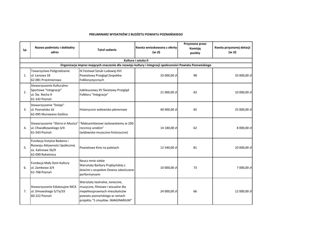 PRELIMINARZ WYDATKÓW Z BUDŻETU POWIATU POZNAŃSKIEGO Lp. Nazwa podmiotu i dokładny adres Tytuł zadania Kwota wnioskowana z oferty (w zł) Przyznane przez Komisję punkty Kwota przyznanej dotacji (w zł) Kultura i sztuka II Organizacja imprez mających znaczenie dla rozwoju kultury i integracji społeczności Powiatu Poznańskiego 1. Towarzystwo Poligrodzianie ul. Łanowa 18 62-081 Przeźmierowo IX Festiwal Sztuki Ludowej-XVI Powiatowy Przegląd Zespołów Folklorystycznych 33 000,00 zł 98 33 000,00 zł 2. Stowarzyszenie KulturalnoSportowe "Integracje" ul. Św. Rocha 9 61-142 Poznań Jubileuszowy XV Światowy Przegląd Folkloru "Integracje" 21 000,00 zł 63 10 000,00 zł 3. Stowarzyszenie "Dzieje" ul. Poznańska 16 62-095 Murowana Goślina Historyczne widowisko plenerowe 40 000,00 zł 65 25 000,00 zł 4. Stowarzyszenie "Gloria in Musica" "Maksymilianowi Jackowskiemu w 200. ul. Chwiałkowskiego 3/4 rocznicę urodzin" 61-543 Poznań (widowisko muzyczno-historyczne) 14 180,00 zł 62 8 000,00 zł 5. Fundacja Instytut Badania i Rozwoju Aktywności Społecznej os. Kalinowe 5b/9 62-090 Rokietnica Powiatowe Kino na paletach 12 540,00 zł 81 10 000,00 zł 6. Fundacja Mały Dom Kultury ul. Zamkowa 3/4 61-768 Poznań Naucz mnie siebie Warsztaty Barbary Prądzyńskiej z dziećmi z zespołem Downa zakończone performansem 10 000,00 zł 73 7 000,00 zł 7. Warsztaty teatralne, taneczne, Stowarzyszenie Edukacyjne MCA muzyczne, filmowe i wizualne dla ul. Dmowskiego 5/7a/33 niepełnosprawnych mieszkańców 60-222 Poznań powiatu poznańskiego w ramach projektu "5 zmysłów. IMAGINARIUM" 24 000,00 zł 66 12 000,00 zł Wydawanie niekomercyjnych, niskonakładowych wydawnictw w postaci drukowanej oraz innych technik zapisu, dot. tradycji i kultury obszaru Powiatu Poznańskiego 8. Związek Harcerstwa Polskiego Chorągiew Wielkopolska-Hufiec Czerwonak ul. Św. Marcin 80/82 61-809 Poznań 9. Stowarzyszenie Forum Antoniego z Napachania Antoni z Napachania 1494-1561 ul. Rokietnicka 7 Rektor Akademii Krakowskiej Napachanie publikacja 62-090 Rokietnica Wydanie książki pt: "Wspomnijmy sobie…" 12 000,00 zł 77 9 000,00 zł 21 040,00 zł 85 18 000,00 zł 132 000,00 zł