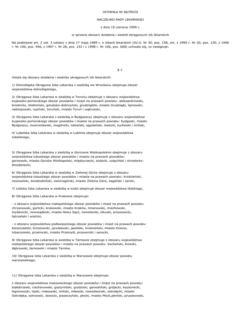 UCHWAŁA Nr 66/99/III NACZELNEJ RADY LEKARSKIEJ z dnia 19 czerwca 1999 r. w sprawie obszaru działania i siedzib okręgowych izb lekarskich Na podstawie art. 2 ust. 3 ustawy z dnia 17 maja 1989 r. o izbach lekarskich (Dz.U. Nr 30, poz. 158, zm. z 1990 r. Nr 20, poz. 120, z 1996 r. Nr 106, poz. 496, z 1997 r. Nr 28, poz. 152 i z 1998 r. Nr 106, poz. 668) uchwala się, co następuje: § 1. Ustala się obszary działania i siedziby okręgowych izb lekarskich: 1/ Dolnośląska Okręgowa Izba Lekarska z siedzibą we Wrocławiu obejmuje obszar województwa dolnośląskiego, 2/ Okręgowa Izba Lekarska w siedzibą w Toruniu obejmuje z obszaru województwa kujawsko-pomorskiego obszar powiatów i miast na prawach powiatu: aleksandrowski, brodnicki, chełmiński, golubsko-dobrzyński, grudziądzki, miasto Grudziądz, lipnowski, radziejowski, rypiński, toruński, miasto Toruń i wąbrzeski, 3/ Okręgowa Izba Lekarska z siedzibą w Bydgoszczy obejmuje z obszaru województwa kujawsko-pomorskiego obszar powiatów i miasta na prawach powiatu: bydgoski, miasto Bydgoszcz, inowrocławski, mogilnicki, nakielski, sępoleński, świecki, tucholski i żniński, 4/ Lubelska Izba Lekarska w siedzibą w Lublinie obejmuje obszar województwa lubelskiego, 5/ Okręgowa Izba Lekarska z siedzibą w Gorzowie Wielkopolskim obejmuje z obszaru województwa lubuskiego obszar powiatów i miasto na prawach powiatów: gorzowski, miasto Gorzów Wielkopolski, międzyrzecki, słubicki, sulęciński i strzeleckodrezdenecki, 6/ Okręgowa Izba Lekarska w siedzibą w Zielonej Górze obejmuje z obszaru województwa lubuskiego obszar powiatów i miasta na prawach powiatu: krośnieński, nowosolski, świebodziński, zielonogórski, miasto Zielona Góra, żagański i żarski, 7/ Łódzka Izba Lekarska w siedzibą w Łodzi obejmuje obszar województwa łódzkiego, 8/ Okręgowa Izba Lekarska w Krakowie obejmuje: - z obszaru województwa małopolskiego obszar powiatów i miast na prawach powiatu: chrzanowski, gorlicki, krakowski, miasto Kraków, limanowski, miechowski, myślenicki, nowosądecki, miasto Nowy Sącz, nowotarski, olkuski, proszowicki, tatrzański i wielicki, - z obszaru województwa podkarpackiego obszar powiatów i miast na prawach powiatu: bieszczadzki, brzozowski, jarosławski, jasielski, krośnieński, miasto Krosno, lubaczowski, przemyski, miasto Przemyśl, przeworski i sanocki, 9/ Okręgowa Izba Lekarska w siedzibą w Tarnowie obejmuje z obszaru województwa małopolskiego obszar powiatów i miasto na prawach powiatu: bocheński, brzeski, dąbrowski, tarnowski i miasto Tarnów, 10/ Okręgowa Izba Lekarska z siedzibą w Warszawie obejmuje obszar powiatu warszawskiego, 11/ Okręgowa Izba Lekarska z siedzibą w Warszawie obejmuje: z obszaru województwa mazowieckiego obszar powiatów i miast na prawach powiatu: białobrzeski, ciechanowski, gostyniński, grodziski, garwoliński, grójecki, kozieniecki, legionowski, lipski, makowski, miński, mławski, nowodworski, ostrołęcki, miasto Ostrołęka, ostrowski, otwocki, piaseczyński, płocki, miasto Płock,płoński, pruszkowski, przemyski, przysuski, pułtuski, radomski, miasto Radom, siedlecki, miasto Siedlce, sochaczewski, sokołowski, szydłowiecki, warszawski zachodni, węgrowski, wołomiński, wyszkowski, zwoleński, żuromiński i żyrardowski, 12/ Okręgowa Izba Lekarska z siedzibą w Opolu obejmuje obszar województwa opolskiego, 13/ Okręgowa Izba Lekarska z siedzibą w Rzeszowie obejmuje z obszaru wojewóztwa podkarpackiego obszar powiatów i miast na prawach powiatu: dębicki, kolbuszowski, leżajski, łańcucki, mielecki, niski, ropczycko-sędziszowski, rzeszowski, miasto Rzeszów, stalowowolski, strzyżewski, tarnobrzeski i miasto Tarnobrzeg, 14/ Podlaska Izba Lekarska z siedzibą w Białymstoku obejmuje obszar województwa podlaskiego, 15/ Pomorska Izba Lekarska z siedzibą w Gdańsku obejmuje obszar województwa pomorskiego, 16/ Okręgowa Izba Lekarska w Katowicach obejmuje z obszaru województwa śląskiego obszar powiatów i miast na prawach powiatu: będziński, miasto Bytom, miasto Chorzów, częstochowski, miasto Częstochowa, miasto Dąbrowa Górnicza, gliwicki, miasto Gliwice, miasto Jastrzębie-Zdrój, miasto Jaworzno, miasto Katowice, kłobucki, lubliniecki, mikołowski, miasto Mysłowice, myszkowski, miasto Piekary Śląskie, pszczyński, raciborski, miasto Ruda Śląska, rybnicki, miasto Rybnik, miasto Siemianowice Śląskie, miasto Sosnowiec, miasto Świętochłowice, tarnogórski, tyski, miasto Tychy, wodzisławski, miasto Zabrze, zawierciański i miasto Żory, 17/ Okręgowa Izba Lekarska z siedzibą w Bielsku-Białej obejmuje: - z obszaru województwa śląskiego obszar powiatów: bielski, miasto BielskoBiała, cieszyński i żywiecki, - z obszaru województwa małopolskiego obszar powiatów i miasto: oświęcimski, suski i wadowicki, 18/ Świętokrzyska Izba Lekarska z siedzibą w Kielcach obejmuje obszar województwa świętokrzyskiego, 19/ Warmińsko-Mazurska Izba Lekarska z siedzibą w Olsztynie obejmuje obszar województwa warmińsko-mazurskiego, 20/ Wielkopolska Izba Lekarska z siedzibą w Poznaniu obejmuje obszar województwa wielkopolskiego, 21/ Okręgowa Izba Lekarska z siedzibą w Szczecinie obejmuje z obszaru województwa zachodniopomorskiego obszar powiatów i miast na prawach powiatu: białogardzki, goleniowski, gryficki, gryfiński, kamiński, myśliborski, policki, pyrzycki, stargardzki, miasto Szczecin i miasto Świnoujście, 22/ Okręgowa Izba Lekarska z siedzibą w Koszalinie obejmuje z obszaru województwa zachodnioporskiego obszar powiatów i miasto na prawach powiatu: choszczeński, drawski, kołobrzeski, koszaliński, miasto Koszalin, sławieński, szczecinecki, świdwiński i wałecki. § 2. Traci moc uchwała Nr 1/89/I Naczelnej Rady Lekarskiej z dnia 18 grudnia 1989 r. w sprawie ustalenia obszaru działania i siedzib okręgowych izb lekarskich (Biuletyn NRL Nr 4/1990, zm. Nr 1/7/1991). § 3. Uchwała wchodzi w życie z dn