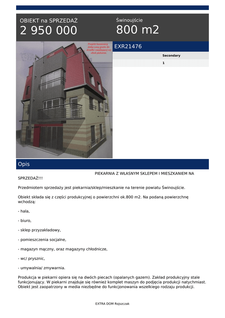 Świnoujście OBIEKT na SPRZEDAŻ 800 m2 2 950 000 EXR21476 Secondary 1 Opis PIEKARNIA Z WŁASNYM SKLEPEM I MIESZKANIEM NA SPRZEDAŻ!!! Przedmiotem sprzedaży jest piekarnia/sklep/mieszkanie na terenie powiatu Świnoujście. Obiekt składa się z części produkcyjnej o powierzchni ok.800 m2. Na podaną powierzchnę wchodzą: - hala, - biuro, - sklep przyzakładowy, - pomieszczenia socjalne, - magazyn mączny, oraz magazyny chłodnicze, - wc/ prysznic, - umywalnia/ zmywarnia. Produkcja w piekarni opiera się na dwóch piecach (opalanych gazem). Zakład produkcyjny stale funkcjonujący. W piekarni znajduje się również komplet maszyn do podjęcia produkcji natychmiast. Obiekt jest zaopatrzony w media niezbędne do funkcjonowania wszelkiego rodzaju produkcji. EXTRA DOM Rojszczak Budynek nadaje się pod każdą działalność. Na działce usadowiona jest również wiata na samochody dostawcze. Cena obejmuje również mieszkanie komfortowe. Część mieszkalna o powierzchni 190 m2 składa się z: * kuchni, * łazienki wraz z WC, * 3 pokoi, * salon z tarasem. Budynek docieplony, w nowej technologii. Nieruchomość wykończona; gdzie na podłodze położone są odpowiednio panele oraz terakota, ściany gładzone, malowane, w kuchni odpowiednio glazura oraz terakota. W części mieszkalnej okna drewniane mahoniowe. Do Nieruchomości jest również dołączona działka z projektem kamienicy na działalności związaną w przyszłości z wynajmem w czasie wakacji-pensjonat. Działka posiada możliwość zabudowy na na całej powierzchni. Cena całej nieruchomości wynosi: 3.700.000,00 zł Polecam i zapraszam na prezentację Opis nieruchomości ma charakter informacyjny, może podlegać aktualizacji, nie stanowi oferty w rozumieniu przepisów art. 66 Kodeksu Cywilnego. W przypadku zainteresowania niniejszą ofertą zapraszamy na spotkanie w dogodnym dla Państwa terminie Prezentujemy nieruchomość wyłącznie osobie, która jest zainteresowana zakupem nieruchomości. Klient otrzymujący adres nieruchomości nie może go przekazywać osobą postronnym. Zgodnie z art. 49 ustawy o ochronie danych osobowych. Współpracę z naszymi Klientami prowadzimy na podstawie umowy pośrednictwa, która wymaga formy pisemnej pod rygorem nieważności, zgodnie z art. 180, pkt 3 Ustawy o gospodarce nieruchomościami. Nasze transakcje objęte są ubezpieczeniem od odpowiedzialności cywilnej na kwotę 200 000,00 EURO. BIURO NIERUCHOMOŚCI EXTRA DOM ROJSZCZAK 72-200 Nowogard ul. Boh. Warszawy 1 (przy placówce Alior Banku) www.extradom.net.pl tel./fax 91 392 22 33 Co robimy dla klienta zainteresowanego zakupem: * Sprawdzamy zdolność kredytową * Wyszukujemy odpowiednią nieruchomość, * Pomagamy w prowadzeniu negocjacji, * Pomagamy w uzyskaniu potrzebnych dokumentów * Pomagamy w uzyskaniu kredytu hipotecznego * Współpracujemy z kancelariami notarialnymi, geodetami Korzystając z naszych usług oszczędzasz swój czas, a także zyskujesz pewność, że Twoja EXTRA DOM Rojszczak transakcja zostanie przeprowadzona z należytą starannością, w sposób profesjonalny i co najważniejsze - BEZPIECZNY. Nr licencji pośredników: 21317, 21318 Dorota Więzowska tel. 517 770 353 tel. (91) 392 22 33 email: [email protected] EXTRA DOM Rojszczak Powered by TCPDF (www.tcpdf.org)