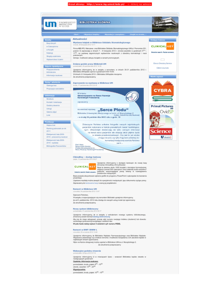 Zrzut strony: http://www.bg.umed.lodz.pl/ : Start : Zasoby Bazy danych : Wypożycz książkę : : Wyszukaj e-czasopismo : <--kliknij na adresie : Znajdź na stronie... : Aktualności Dostępy testowe Wystawa książek w Bibliotece Oddziału Stomatologicznego wtorek, 06 listopada 2012 13:11 e-Czasopisma e-Książki Katalogi Skrypty uczelniane Wydawnictwa Uczelni Firma ABE-IPS, Warszawa oraz Biblioteka Oddziału Stomatologicznego UM (ul. Pomorska 251, poziom 0) zapraszają w dniach 7 – 8 listopada 2012 r. (środa-czwartek) w godzinach 9 o o – 17oo, na wystawę zagranicznych wydawnictw naukowych z dziedziny stomatologii i nauk pokrewnych. Istnieje możliwość zakupu książek w cenach promocyjnych. Zmiana godzin pracy Biblioteki UM Zajęcia dydaktyczne Przysposobienie biblioteczne Informacja naukowa Kursy i szkolenia Obsługa baz Ebsco Directory Service poniedziałek, 29 października 2012 14:35 Oxford Journals Uprzejmie informujemy, że w związku z remontem, w dniach 30-31 października 2012 r. Biblioteka UM będzie czynna w godzinach 8:00-15:00. W dniach 2-3 listopada 2012 r. Biblioteka UM będzie nieczynna. Za utrudnienia przepraszamy. Zaproszenie na wystawę w Bibliotece UM środa, 17 października 2012 23:16 Propozycje warsztatów Informacje Struktura Kontakt i lokalizacja Godziny otwarcia Usługi Galeria zdjęć Linki Punktacja Ważne linki Ranking jednostek za rok 2011 Efektywność lata 20092010 - pracownicy naukowi Efektywność lata 20092010 - wydziały Bibliografia Pracowników ClinicalKey – dostęp testowy piątek, 12 października 2012 09:27 Uprzejmie informujemy o dostępie testowym do nowej bazy klinicznej ClinicalKey z firmy Elsevier. Baza ta zawiera około 1000 książek o tematyce biomedycznej, artykuły z ponad 500 czasopism oraz materiały audio-wizualne i graficzne wspomagające pracę lekarzy w rozwiązywaniu problemów medycznych. Baza pozwala eksportować wybrane grafiki do programu PowerPoint i wykorzystać do tworzenia prezentacji. Uzyskane rezultaty można zawęzić do specjalności medycznych, typu dokumentu czy typu pracy. Zapraszamy do testowania bazy i ocenę jej przydatności. Remont w Bibliotece UM czwartek, 04 października 2012 13:47 Szanowni Państwo, W związku z rozpoczynającym się remontem Biblioteki uprzejmie informujemy, że od 8 października 2012 roku dostęp do naszych usług może być ograniczony. Za utrudnienia przepraszamy. Nowy system biblioteczny poniedziałek, 01 października 2012 09:17 Uprzejmie informujemy, że w związku z wdrożeniem nowego systemu bibliotecznego, zmieniony został również katalog elektroniczny. Aby się do niego zalogować, proszę użyć numeru swojego indeksu (studenci) lub dowodu osobistego (pracownicy) korzystając z wielkich liter. W polu hasła należy wpisać 5 ostatnich cyfr numeru PESEL Remont w BWF i BWW-L czwartek, 20 września 2012 13:46 Uprzejmie informujemy, że Biblioteka Wydziału Farmaceutycznego oraz Biblioteka Wydziału Wojskowo-Lekarskiego są w trakcie remontu i możliwość korzystania z ich zasobów będzie w najbliższych dniach ograniczona. Wpis na Karcie obiegowej można uzyskać w Bibliotece UM na ul. Muszyńskiego 2. Za utrudnienia przepraszamy Wakacyjne godziny otwarcia poniedziałek, 02 lipca 2012 07:16 Uprzejmie informujemy iż w miesiącach lipiec - wrzesień Biblioteka będzie otwarta w następujących godzinach: Czytelnia, informacja naukowa: poniedziałek, środa, piątek: 800 - 1500 wtorek, czwartek: 1300 - 2000 Wypożyczalnia: poniedziałek, środa, piątek: 1000 - 1500 Warto zajrzeć Zrzut strony: http://www.bg.umed.lodz.pl/ <--kliknij na adresie wtorek, czwartek: 1300 - 1730 << pierwsza < poprzednia 1 2 3 4 5 następna > ostatnia >> Strona 1 z 5 Feed Entries Valid XHTML and CSS. Biblioteka Główna Uniwersytetu Medycznego w Łodzi, Powered by Joomla!; Joomla templates by SG web hosting